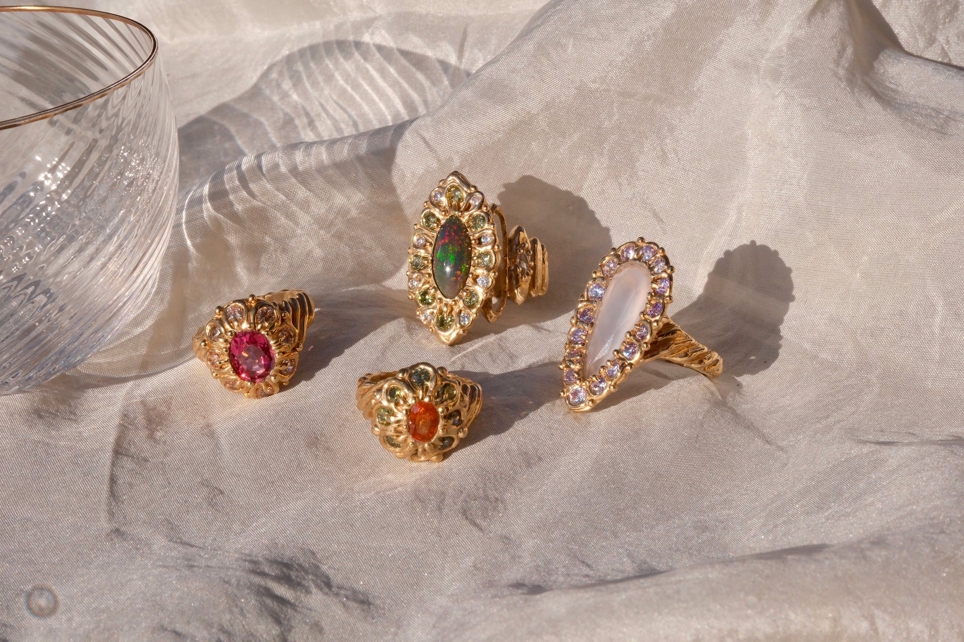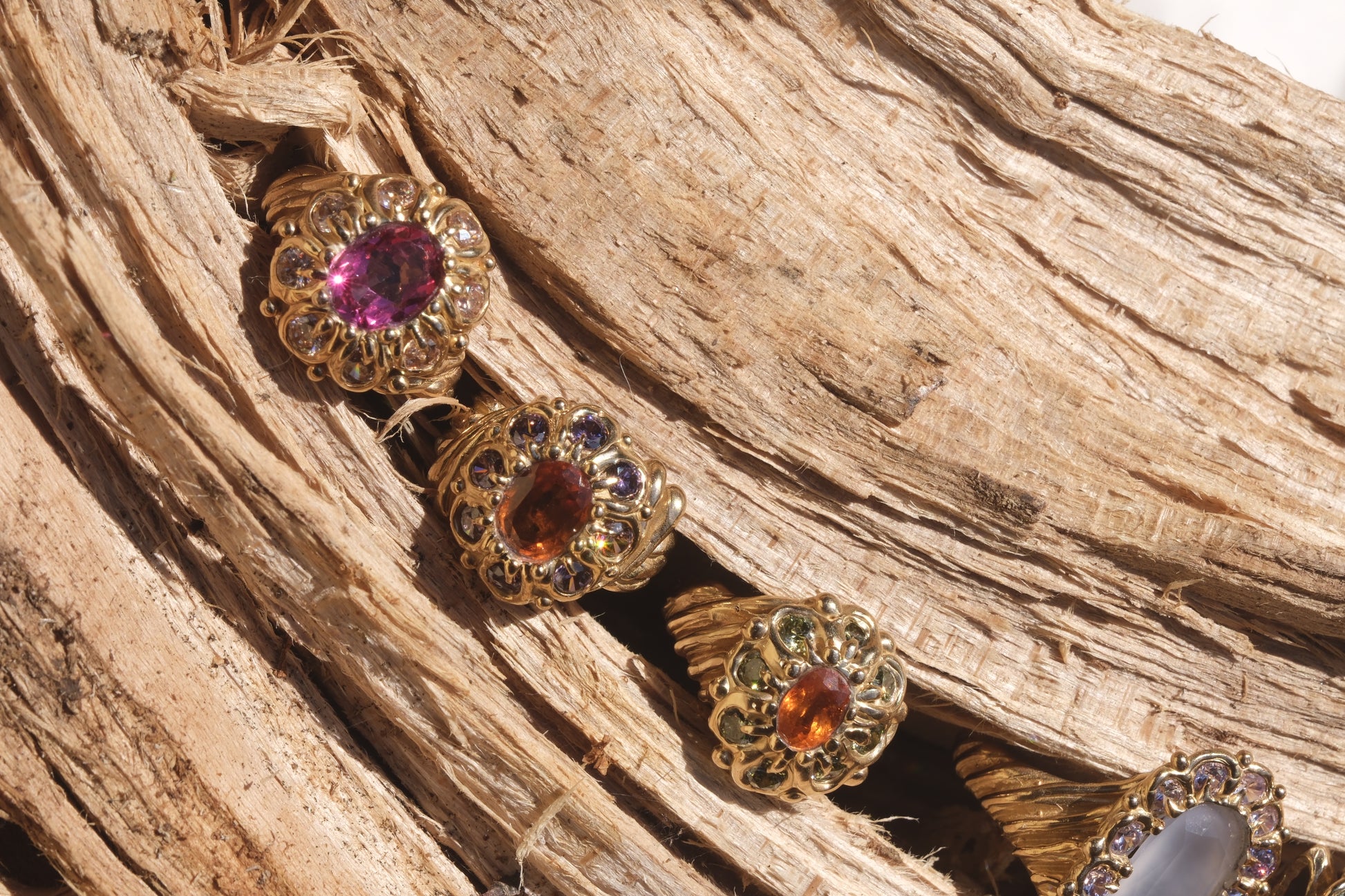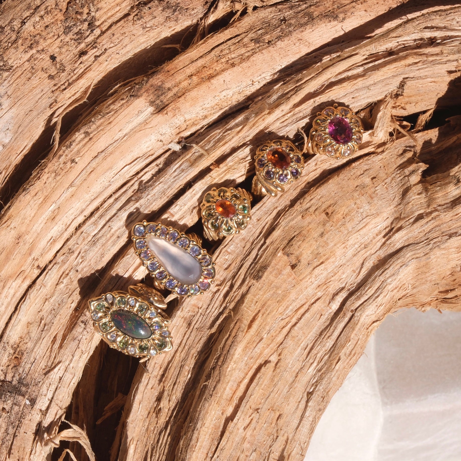Collezione di anelli realizzati con la stessa struttura in bronzo giallo, pensata per esaltare la bellezza delle pietre centrali naturali, ognuna unica per colore e carattere. Il design armonioso e coerente rende questi anelli immediatamente riconoscibili, pur lasciando spazio all’individualità di ogni gemma.