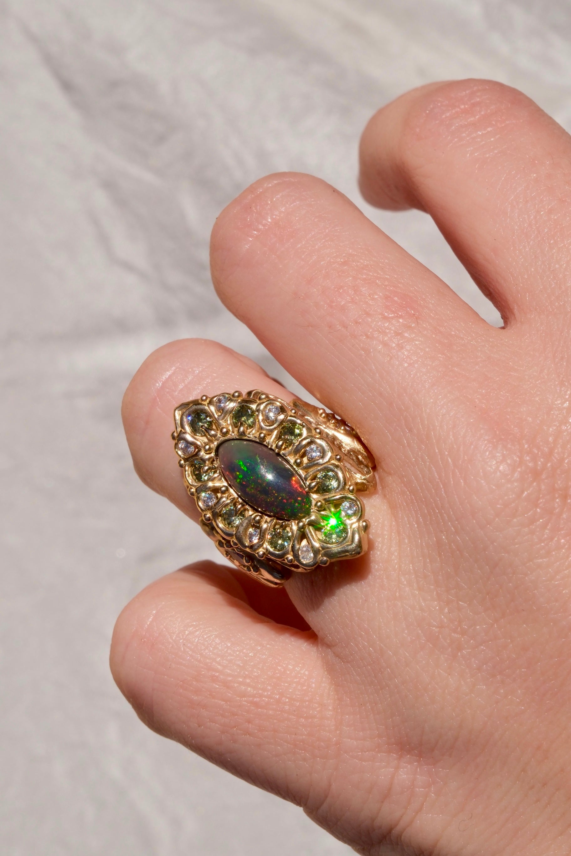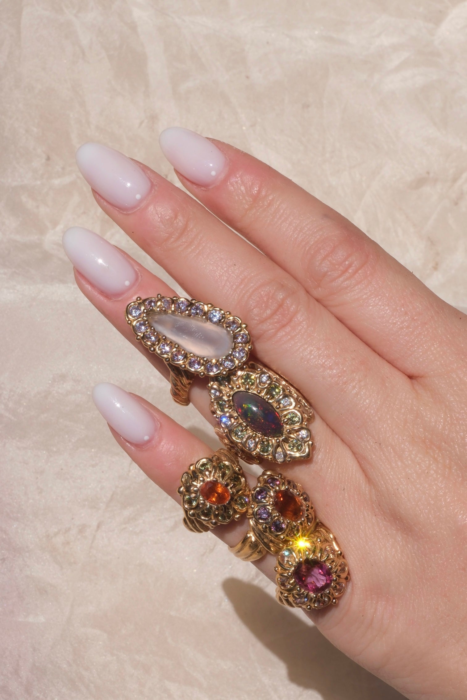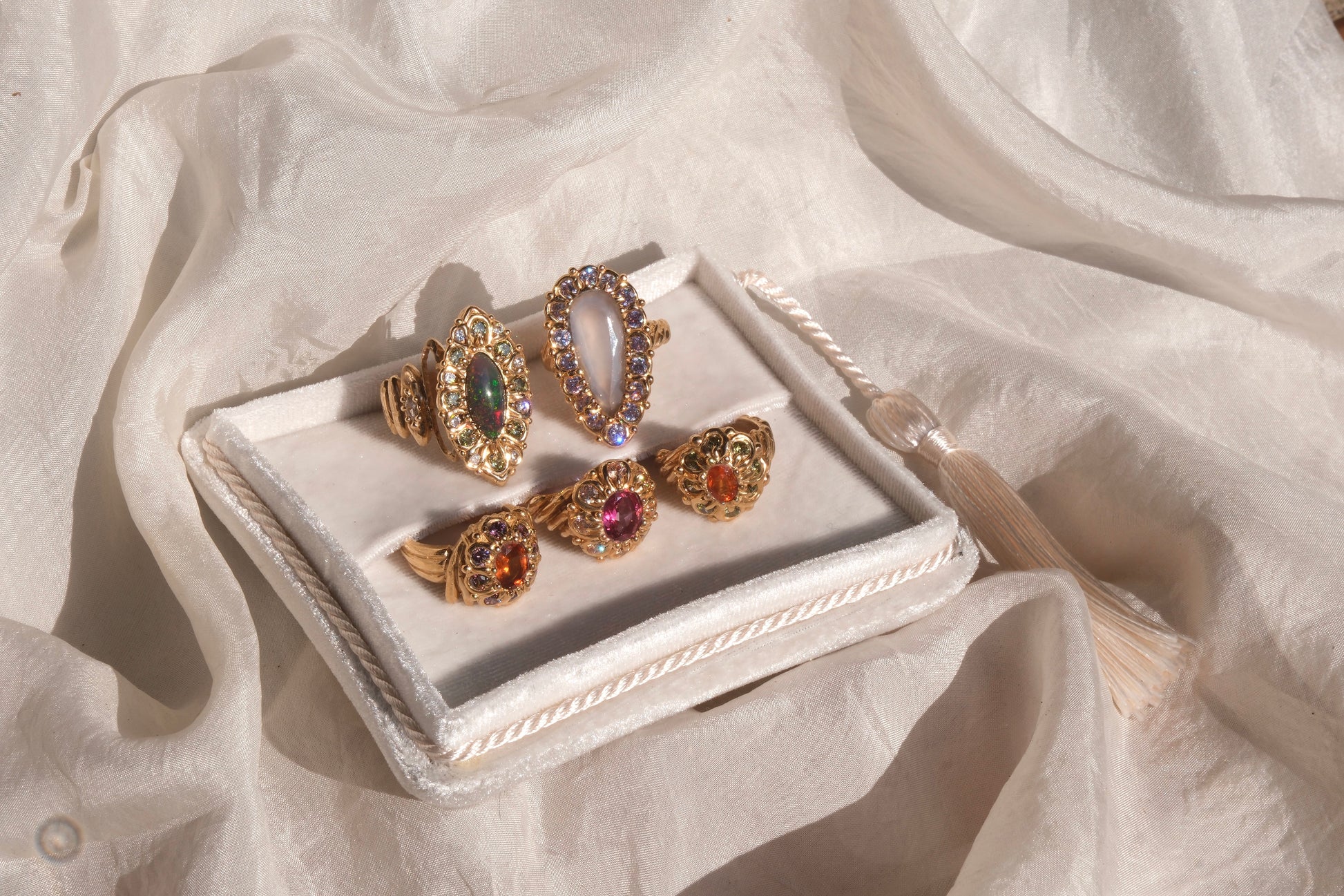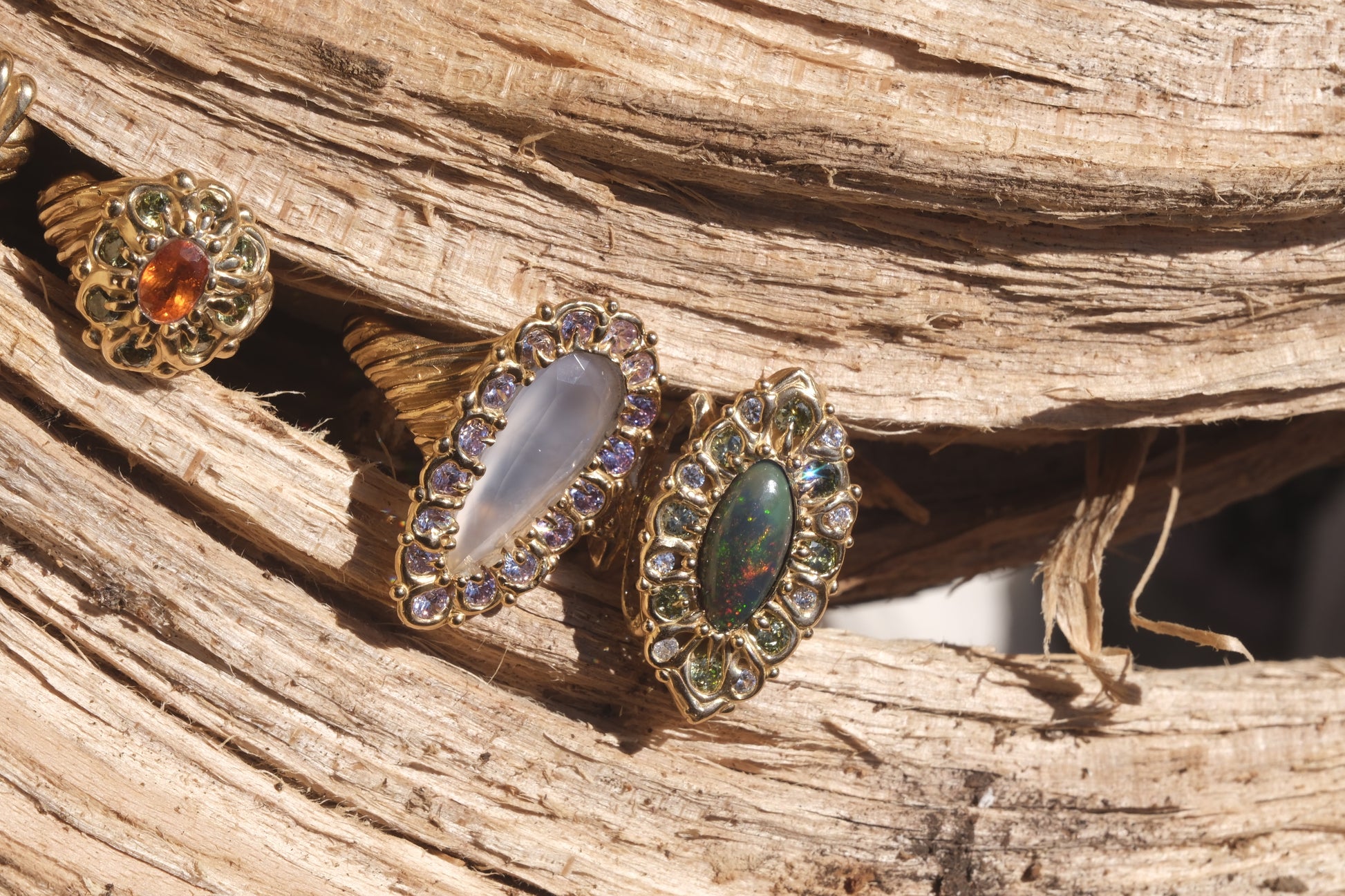 Collezione di anelli realizzati con la stessa struttura in bronzo giallo, pensata per esaltare la bellezza delle pietre centrali naturali, ognuna unica per colore e carattere. Il design armonioso e coerente rende questi anelli immediatamente riconoscibili, pur lasciando spazio all’individualità di ogni gemma.