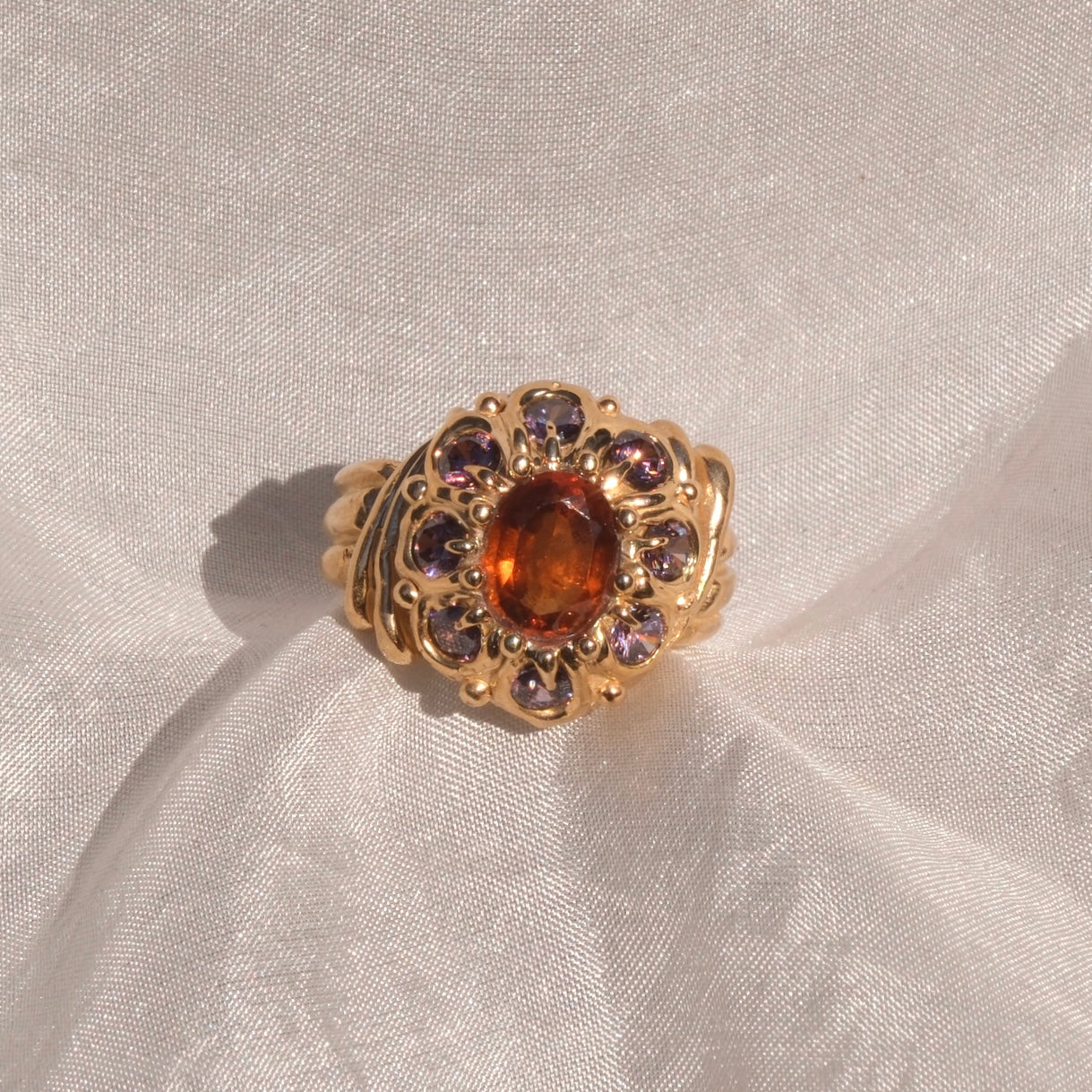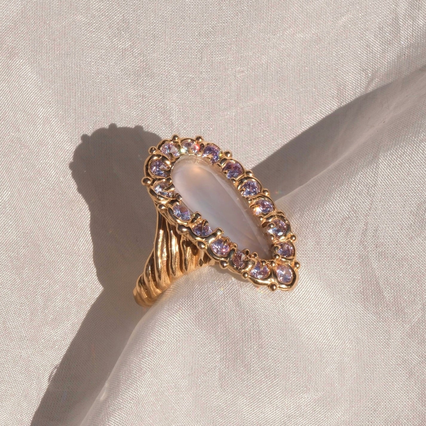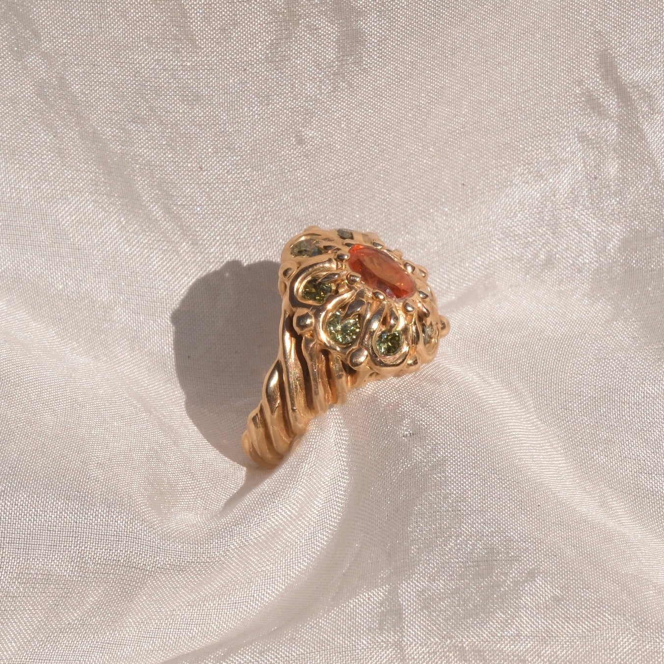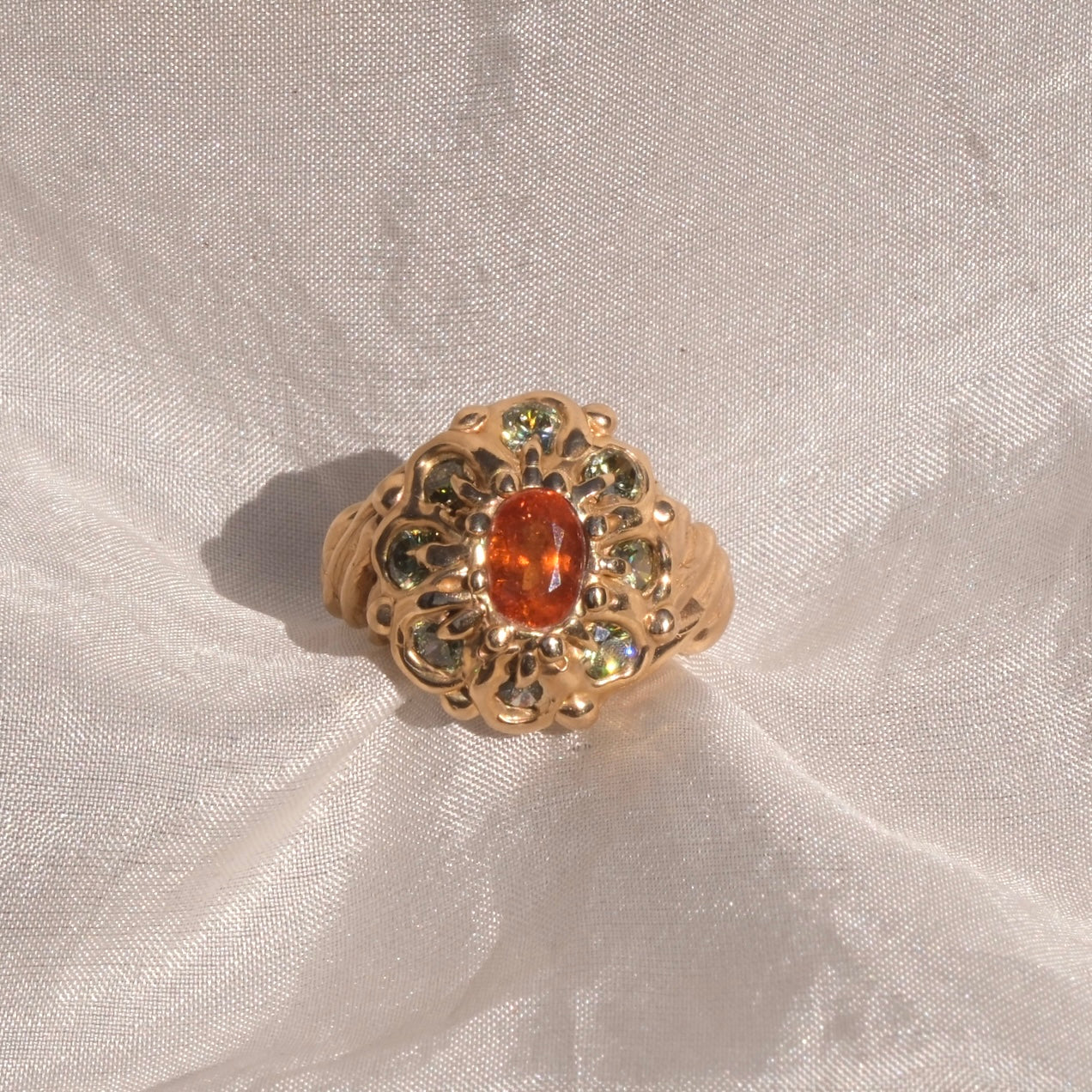 La cornice che avvolge la pietra centrale è impreziosita da cubic zirconia colorata, accuratamente selezionata in base alle tonalità della gemma principale, creando un elegante dialogo cromatico e un raffinato gioco di luce. Il caldo riflesso del bronzo giallo fa da sfondo ideale, valorizzando sia l’intensità delle pietre naturali sia la brillantezza delle zirconia.