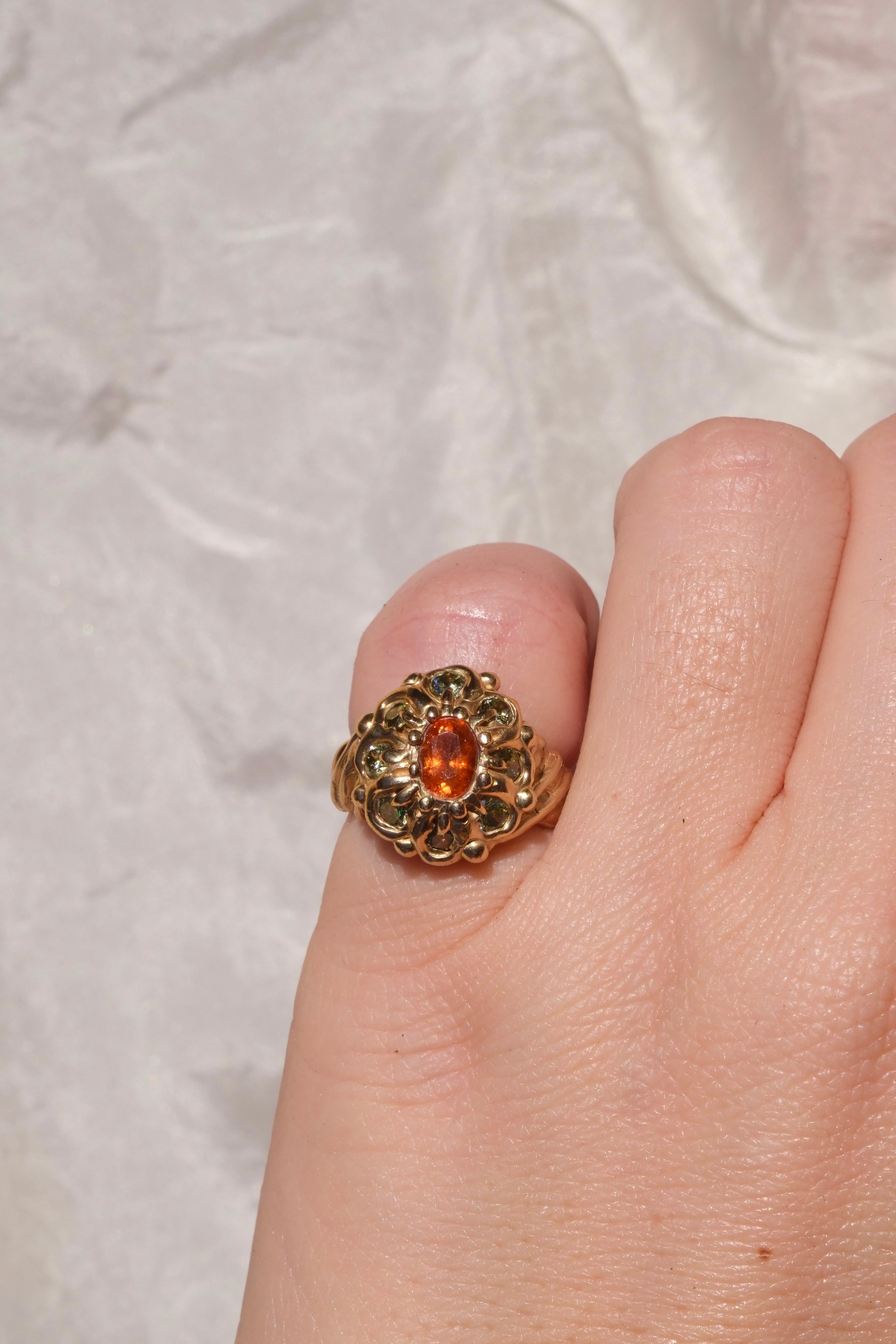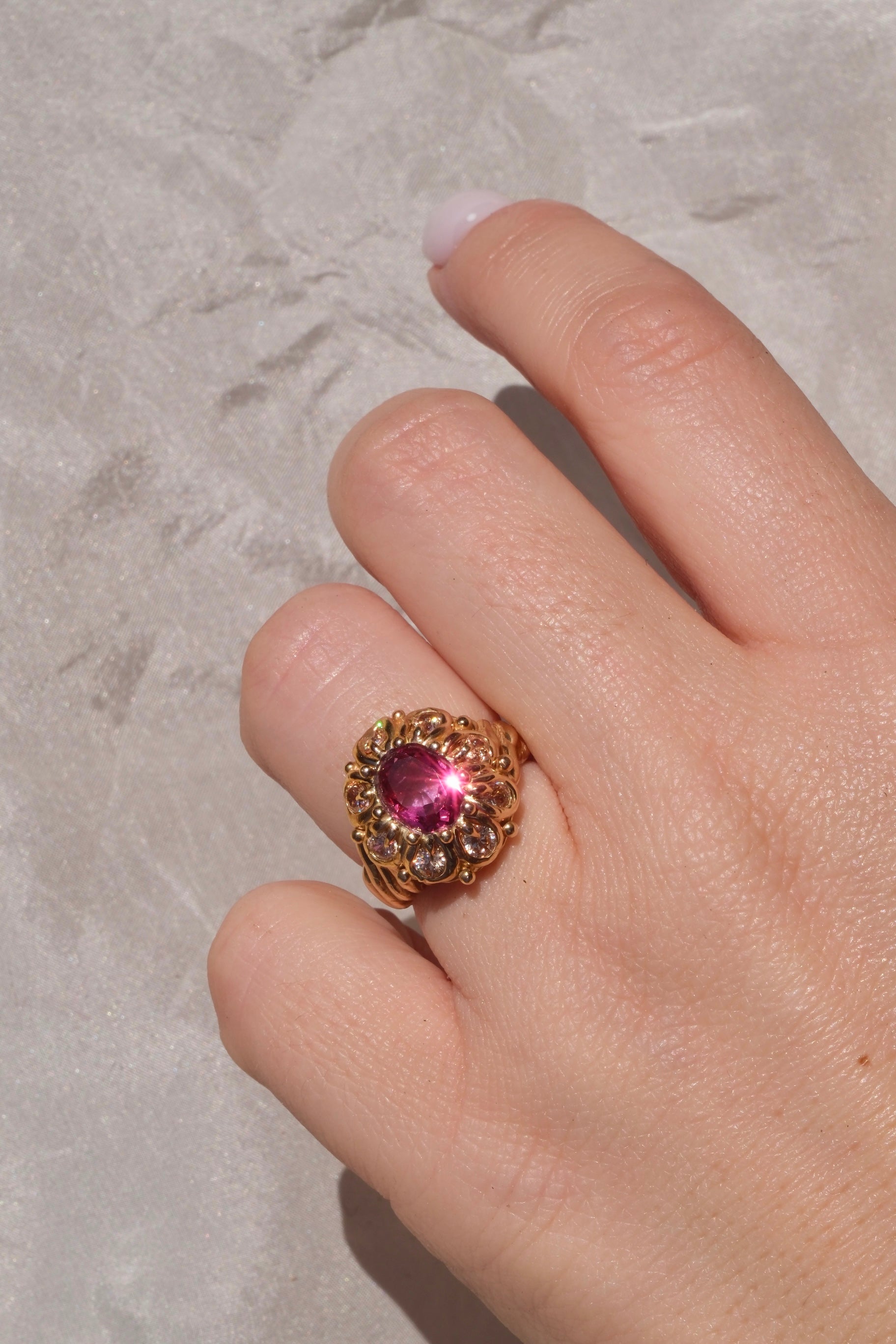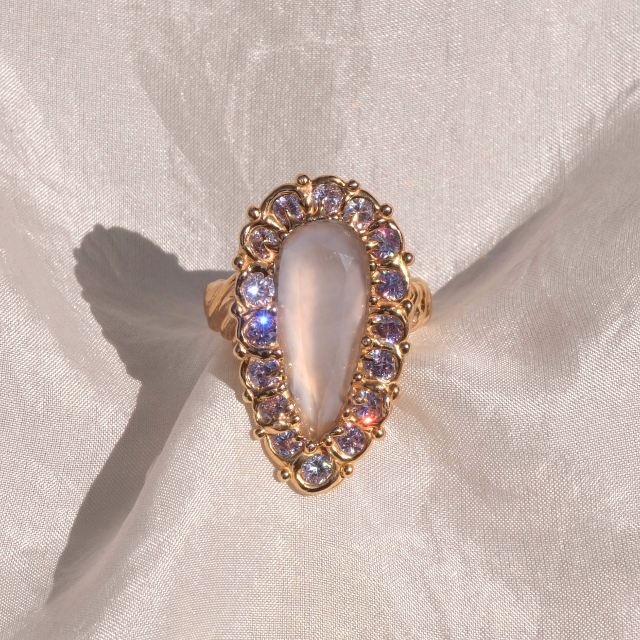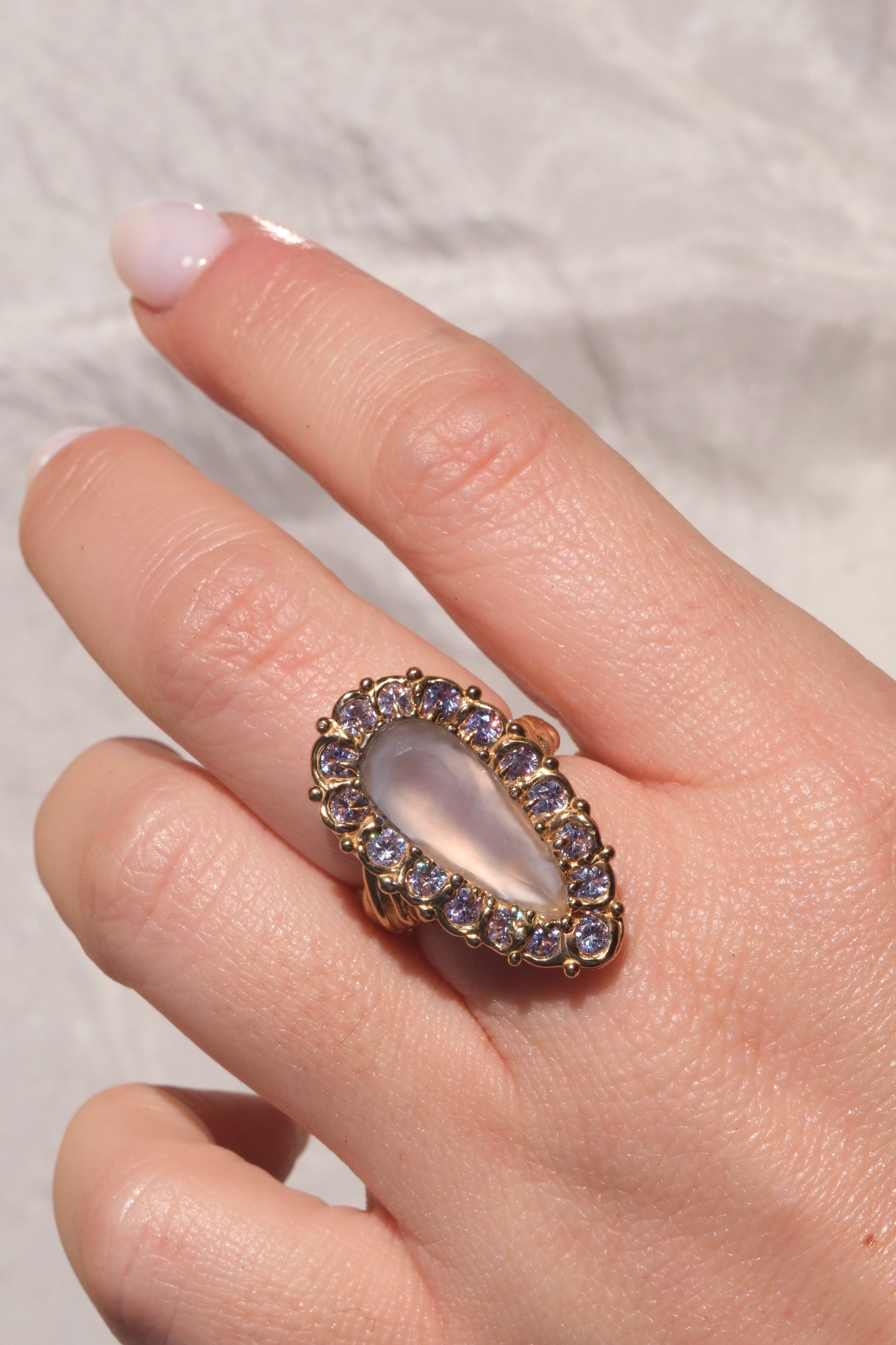 La cornice che avvolge la pietra centrale è impreziosita da cubic zirconia colorata, accuratamente selezionata in base alle tonalità della gemma principale, creando un elegante dialogo cromatico e un raffinato gioco di luce. Il caldo riflesso del bronzo giallo fa da sfondo ideale, valorizzando sia l’intensità delle pietre naturali sia la brillantezza delle zirconia.