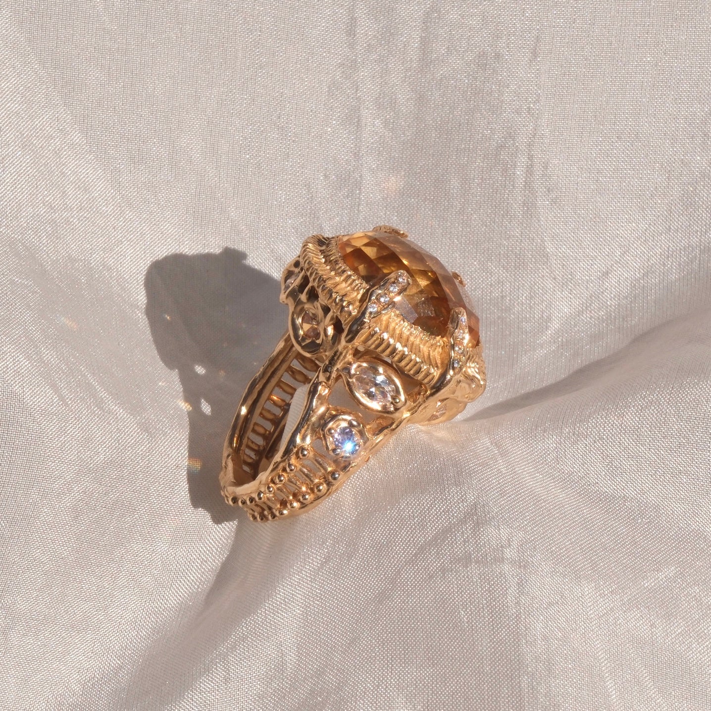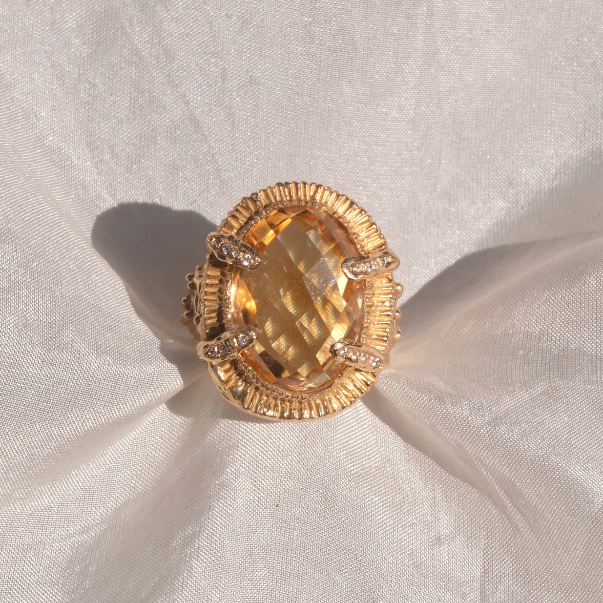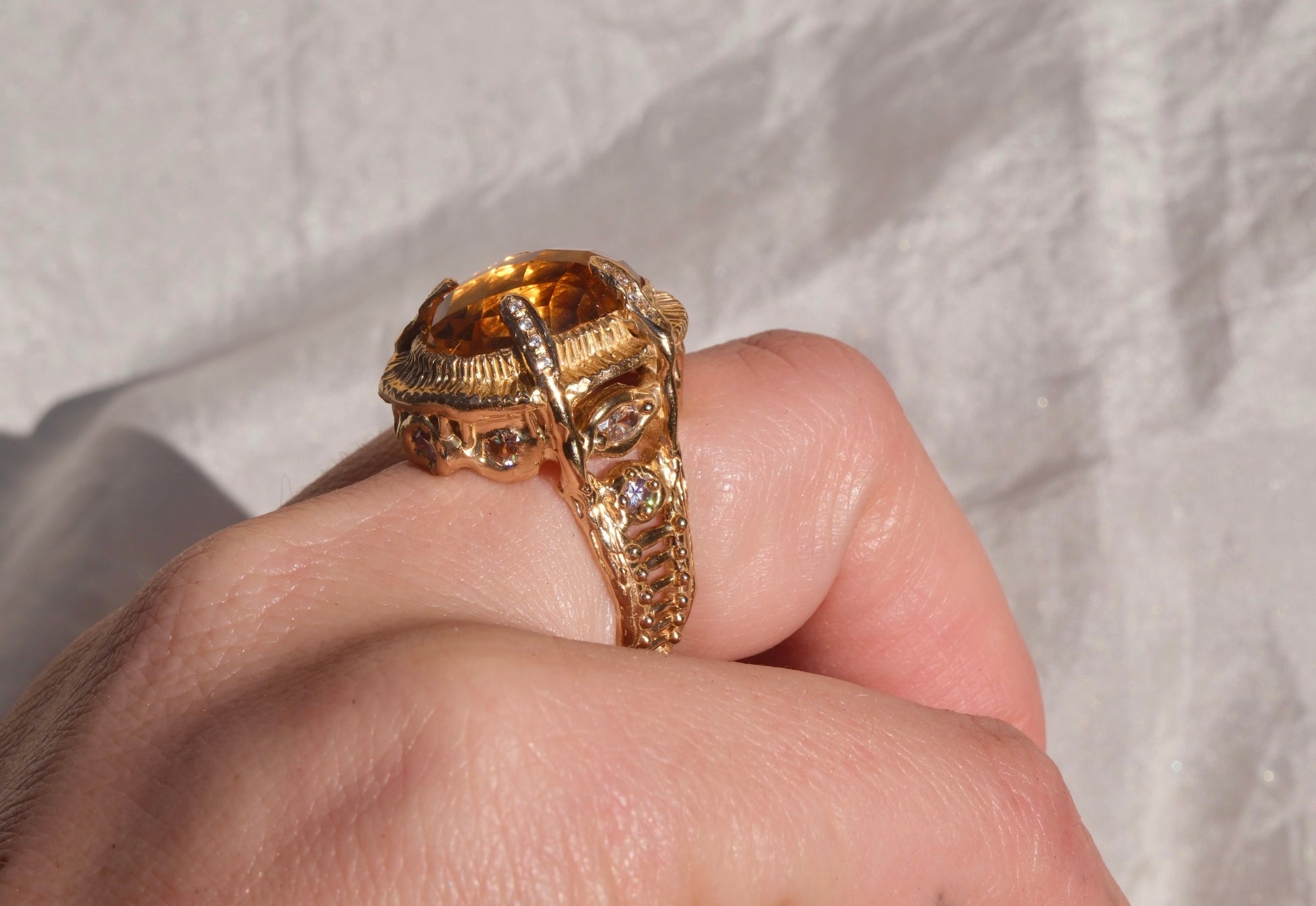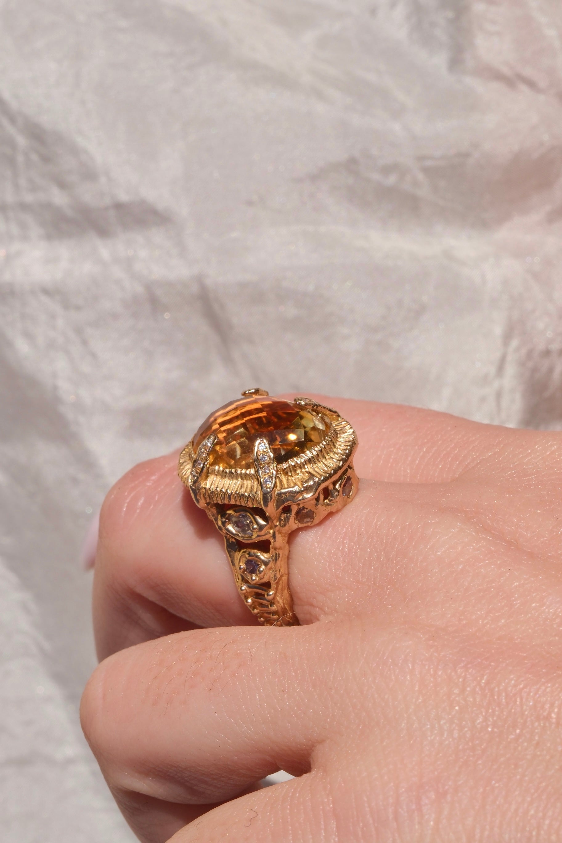 Si segnala con trasparenza che due delle zirconia verdi, preincassate durante la fase di fusione, si sono lievemente danneggiate: su entrambe manca un piccolo frammento. Il difetto è di dimensioni ridotte e non compromette la struttura né la portabilità dell’anello, ma è visibile da vicino e contribuisce a rendere il gioiello un pezzo unico, con le sue caratteristiche e la sua storia artigianale.