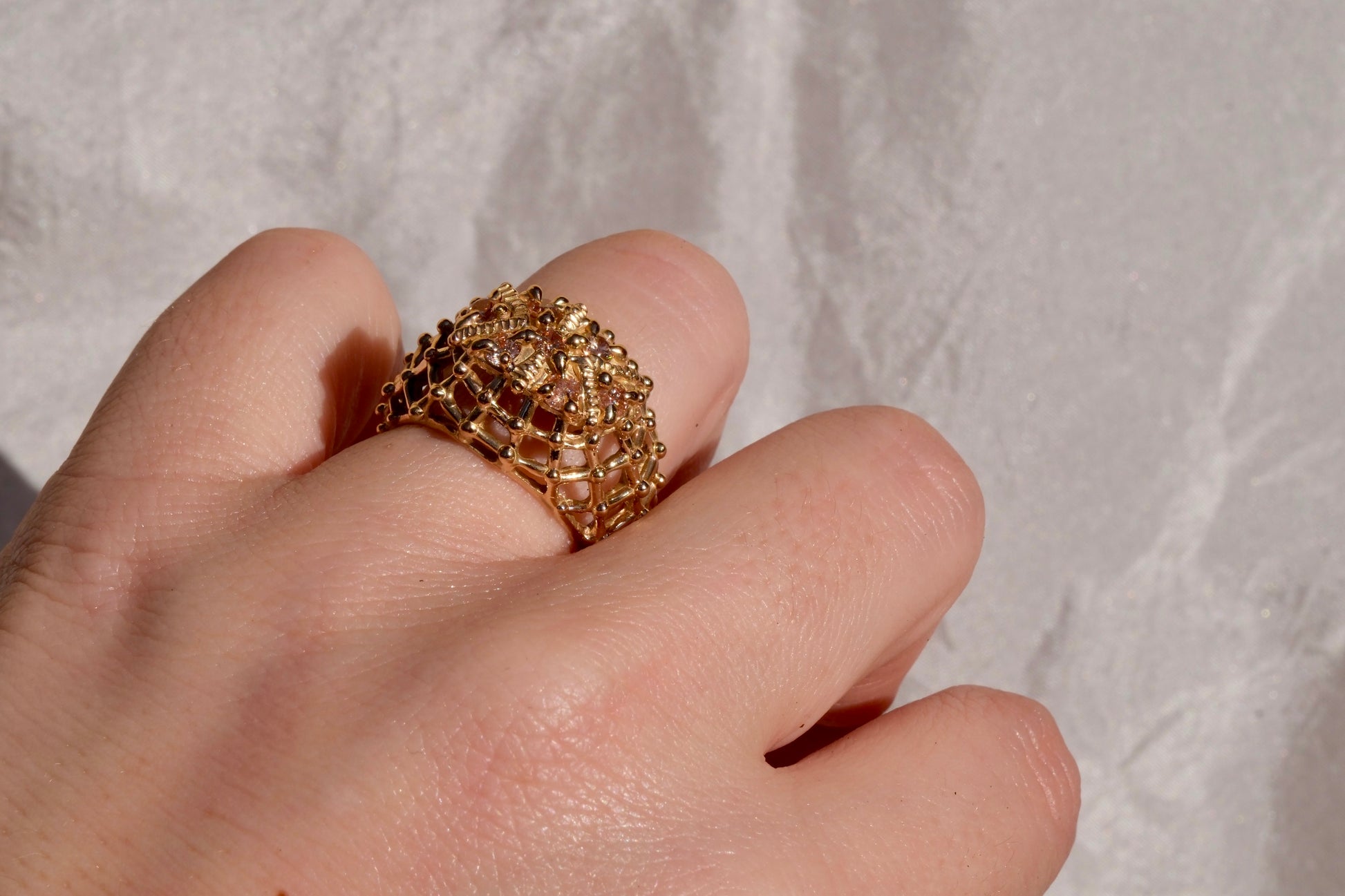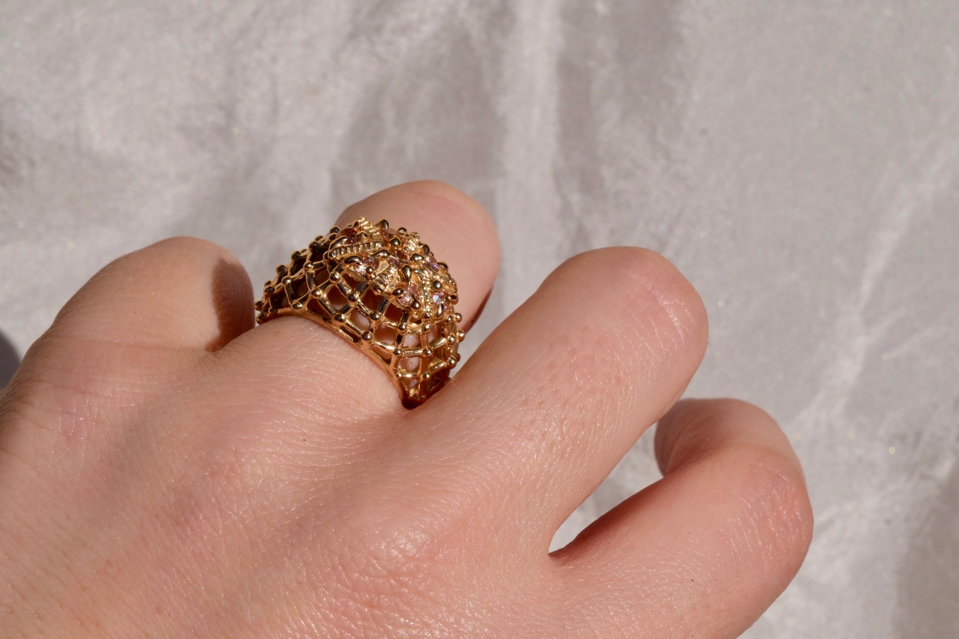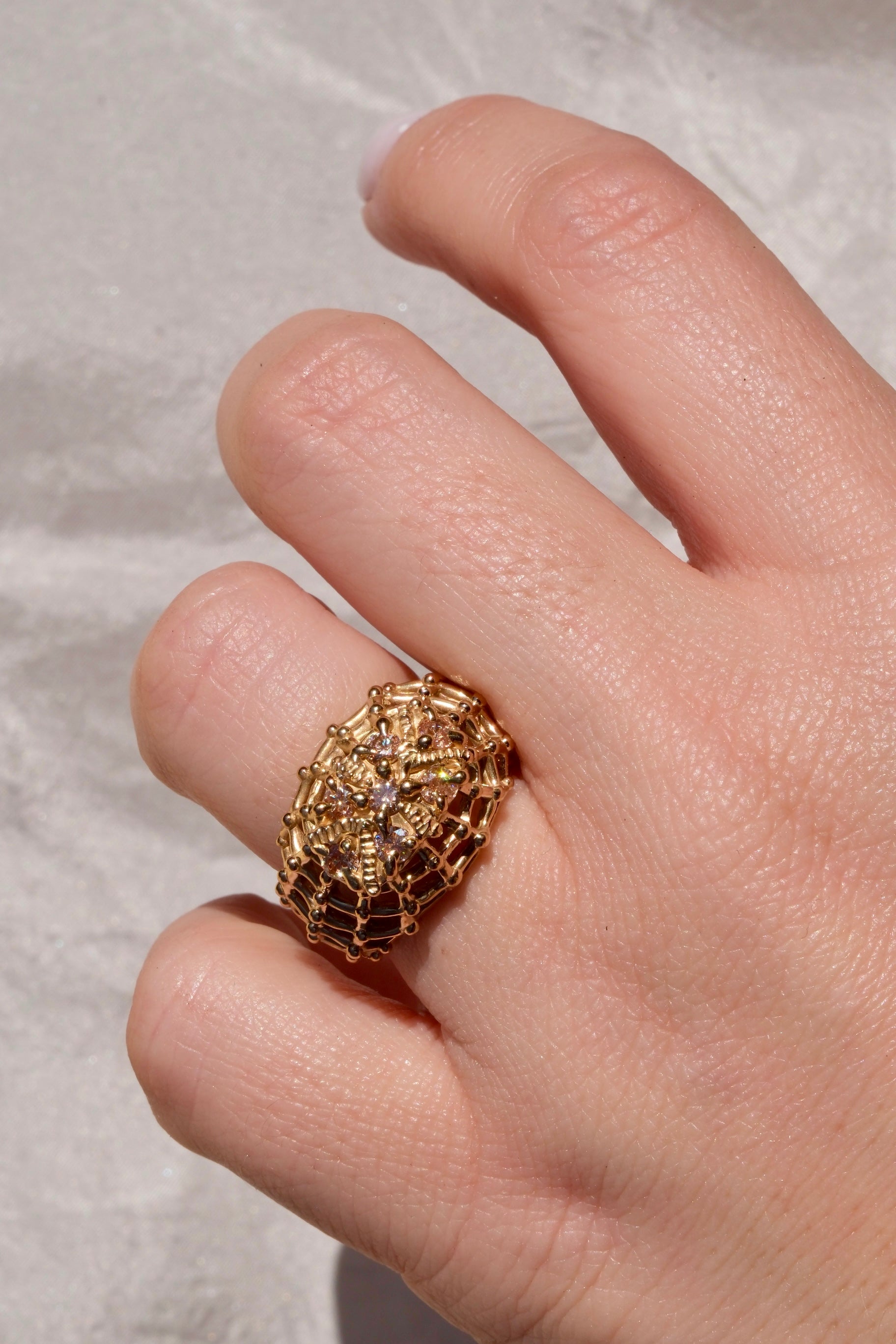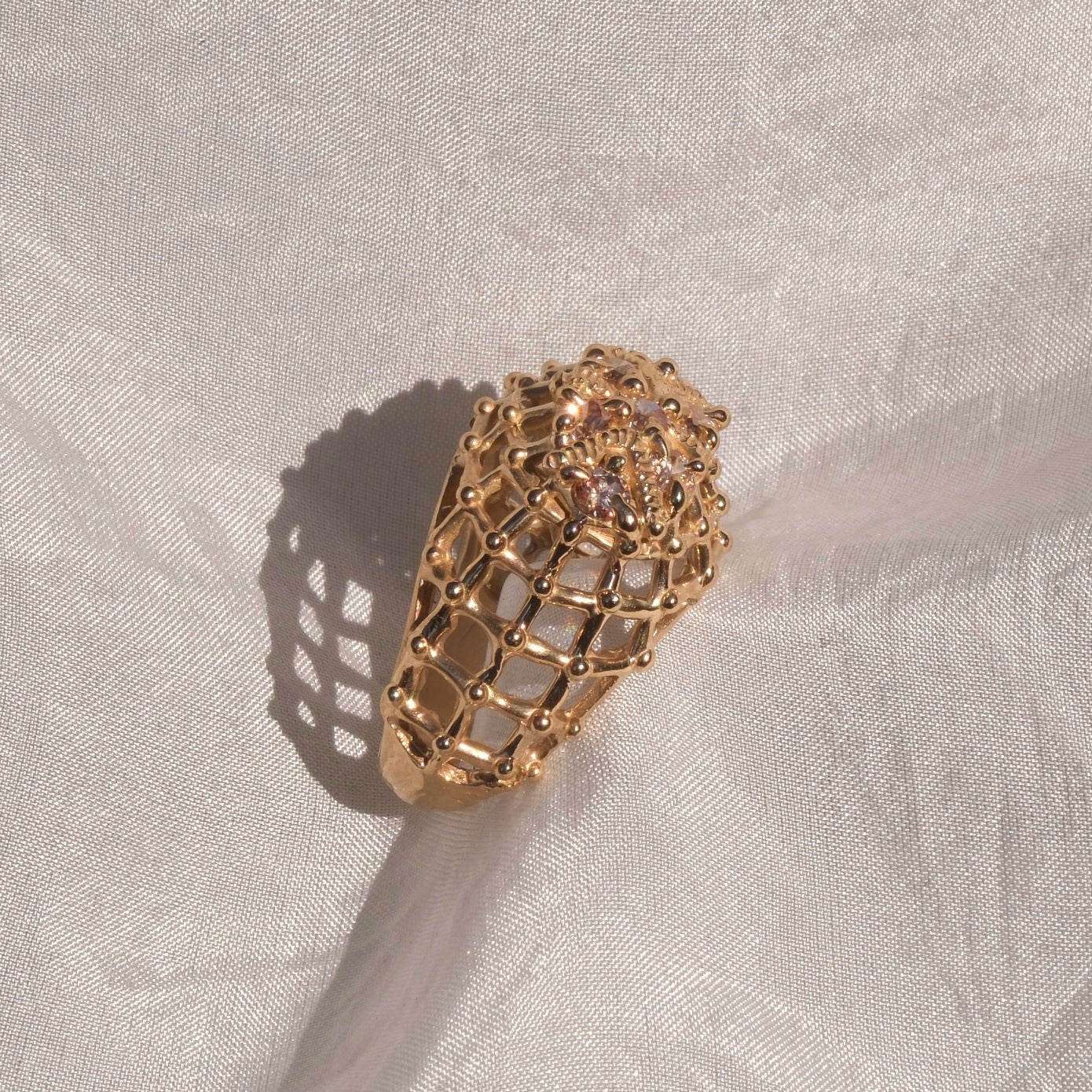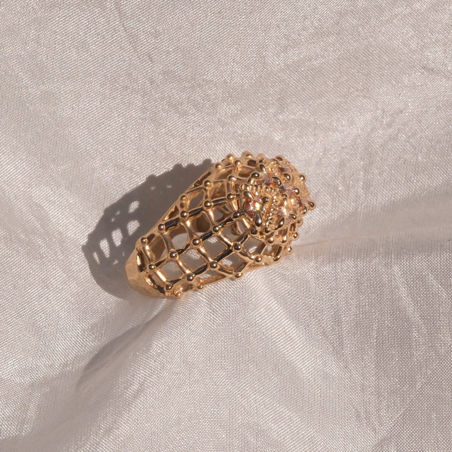 Anello in bronzo giallo dal design moderno e originale, caratterizzato da cubic zirconia color champagne al centro, scelta per la sua calda luminosità e per i riflessi sofisticati che richiamano le sfumature dell’oro. Le pietre sono valorizzate da una montatura a gabbia, che avvolge delicatamente la gemma creando un effetto tridimensionale e permettendo alla luce di esaltarne brillantezza e profondità.