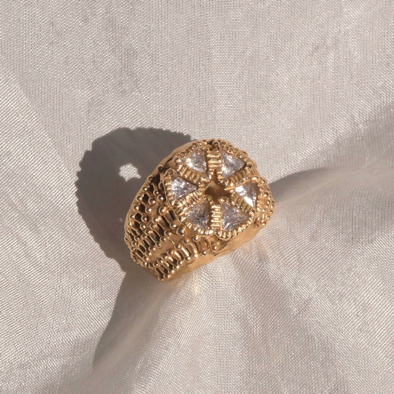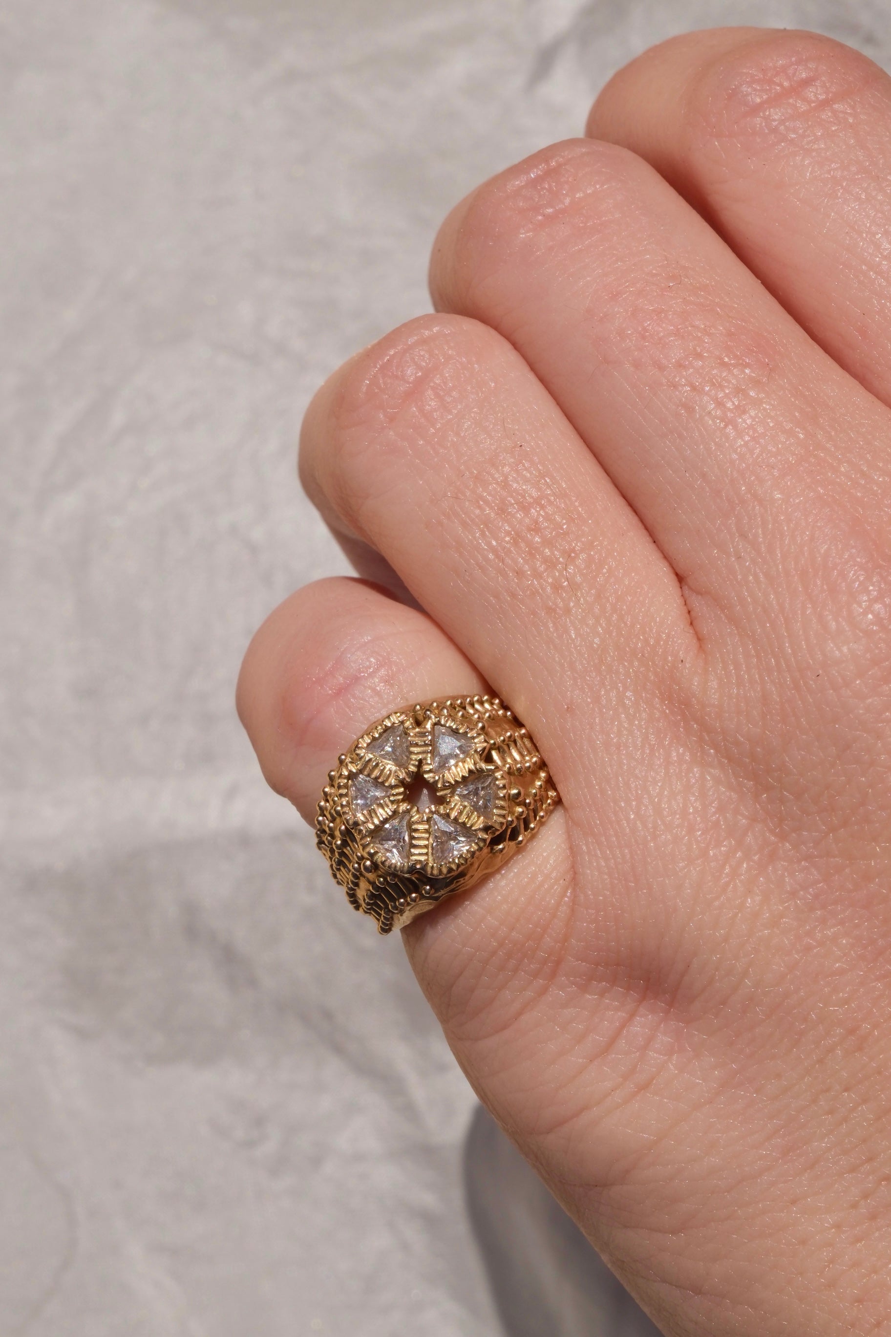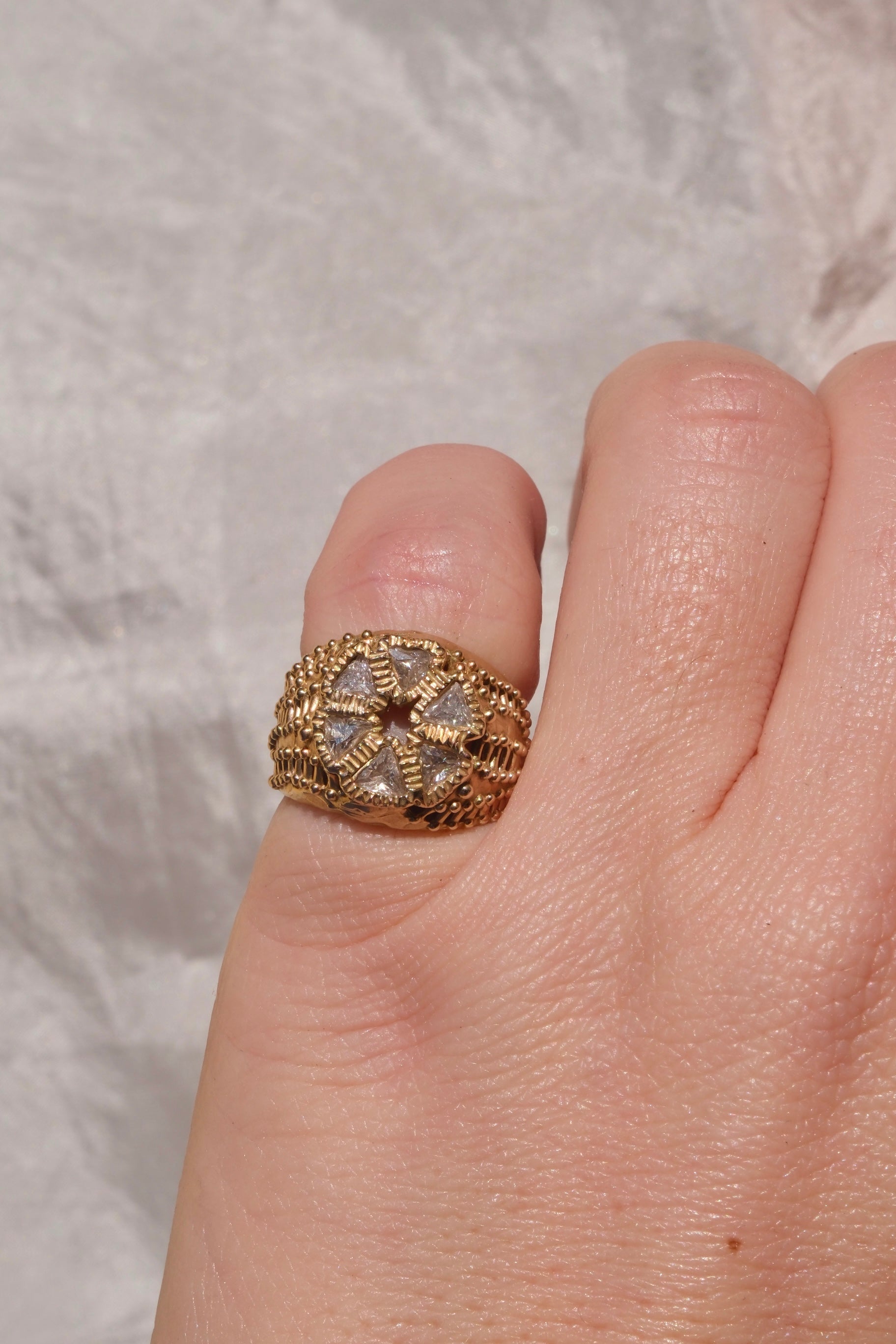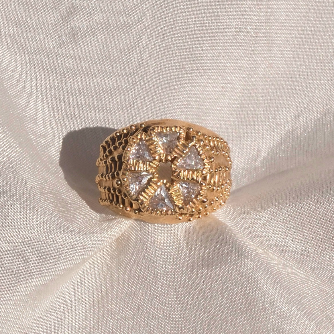 Anello in bronzo dal design moderno e raffinato, caratterizzato da zirconia bianca a taglio triangolare disposte una accanto all’altra fino a formare un elegante cerchio luminoso. La particolare geometria delle pietre crea un suggestivo gioco di luce e riflessi, donando movimento e brillantezza all’insieme.