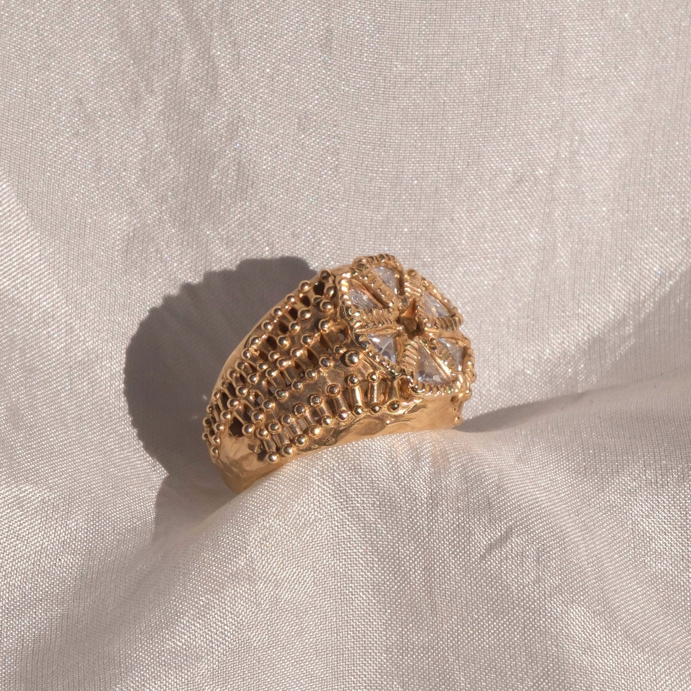 Un anello dal carattere deciso e sofisticato, ideale per chi ama le forme geometriche e desidera un gioiello originale, elegante e senza tempo.