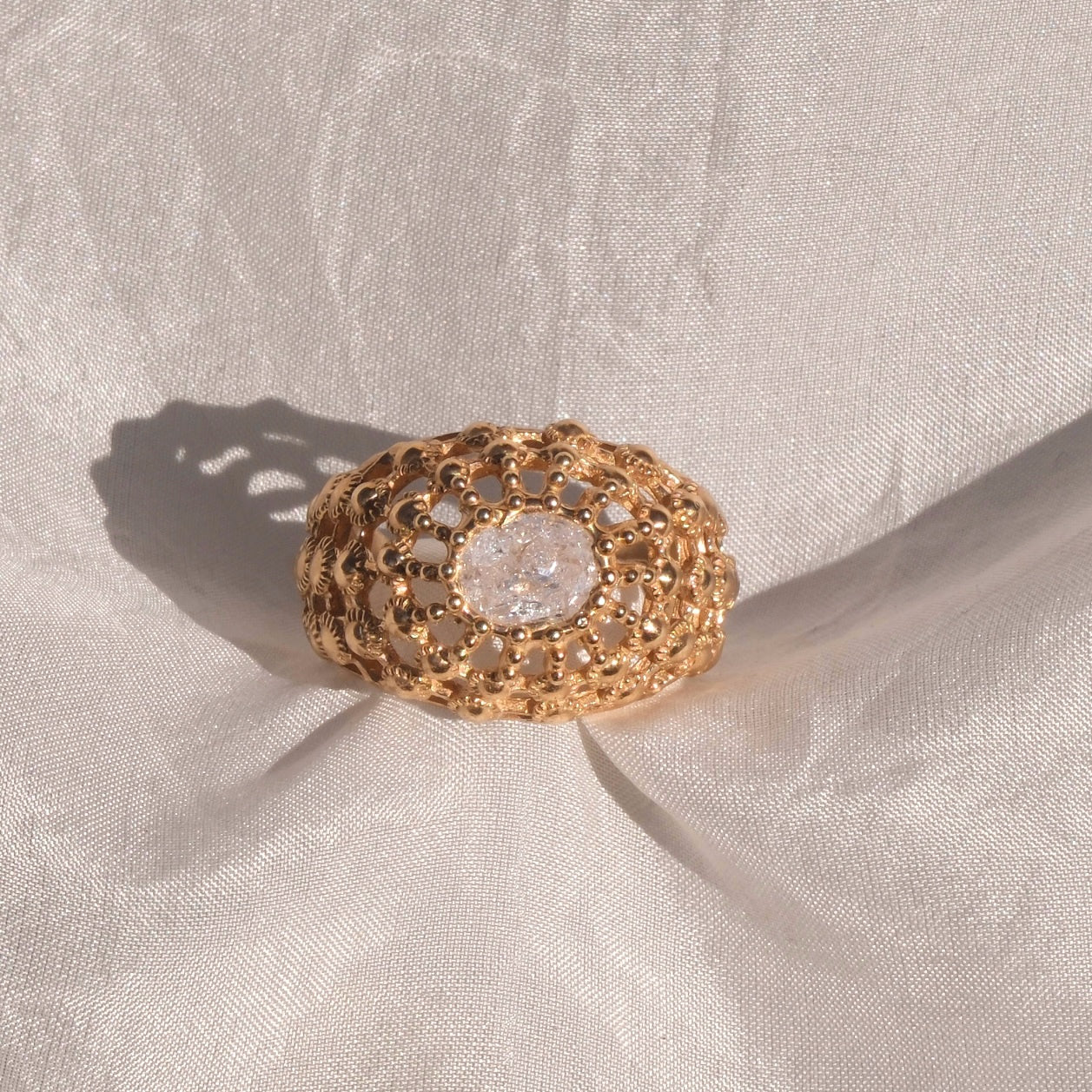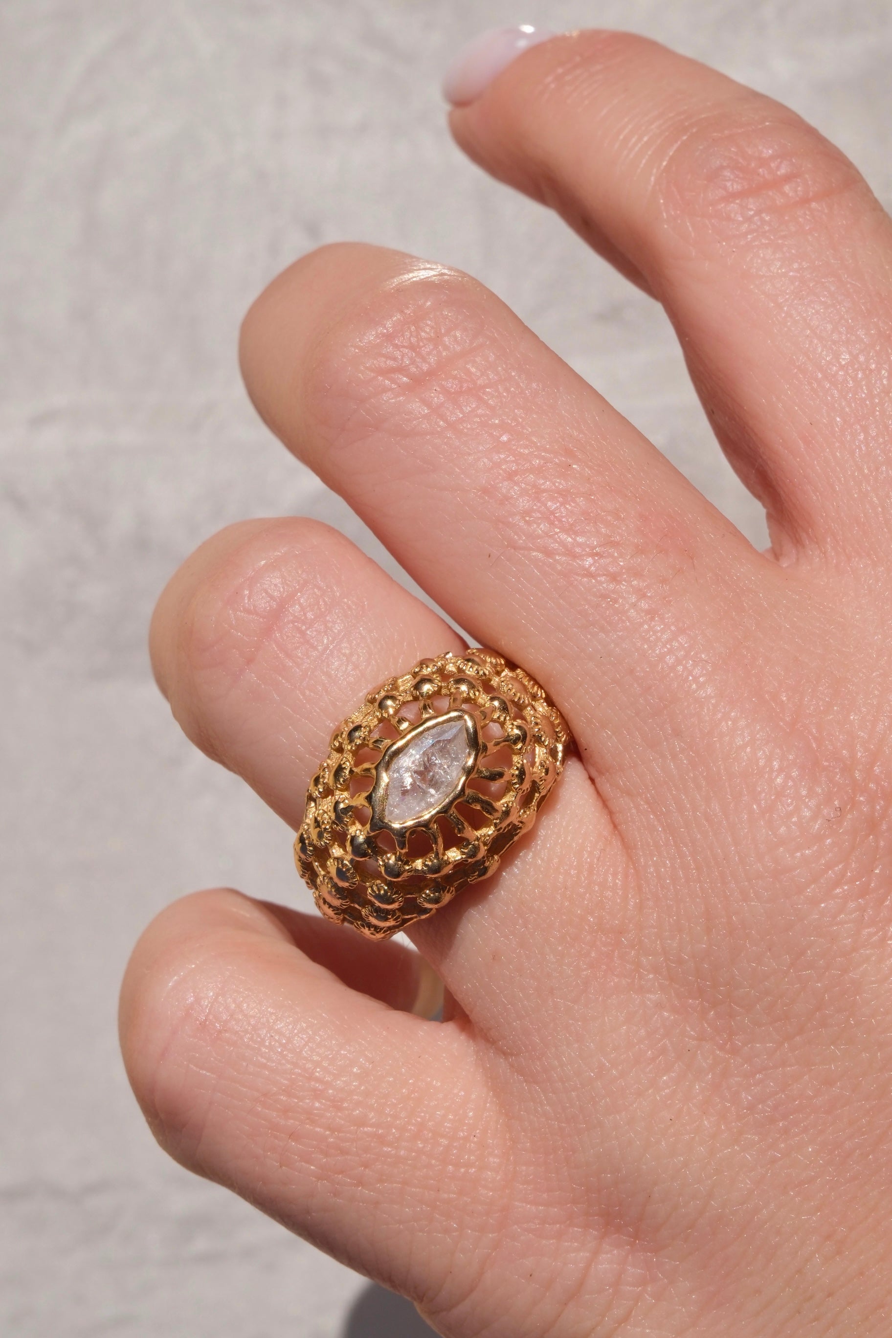 Protagonista è una cubic zirconia, disponibile in taglio ovale oppure marquise, scelta che conferisce all’anello un carattere più morbido e armonioso o, in alternativa, slanciato e sofisticato. Il caldo tono dorato del bronzo giallo crea un raffinato contrasto con la luminosità della gemma, valorizzandone la forma e i riflessi.