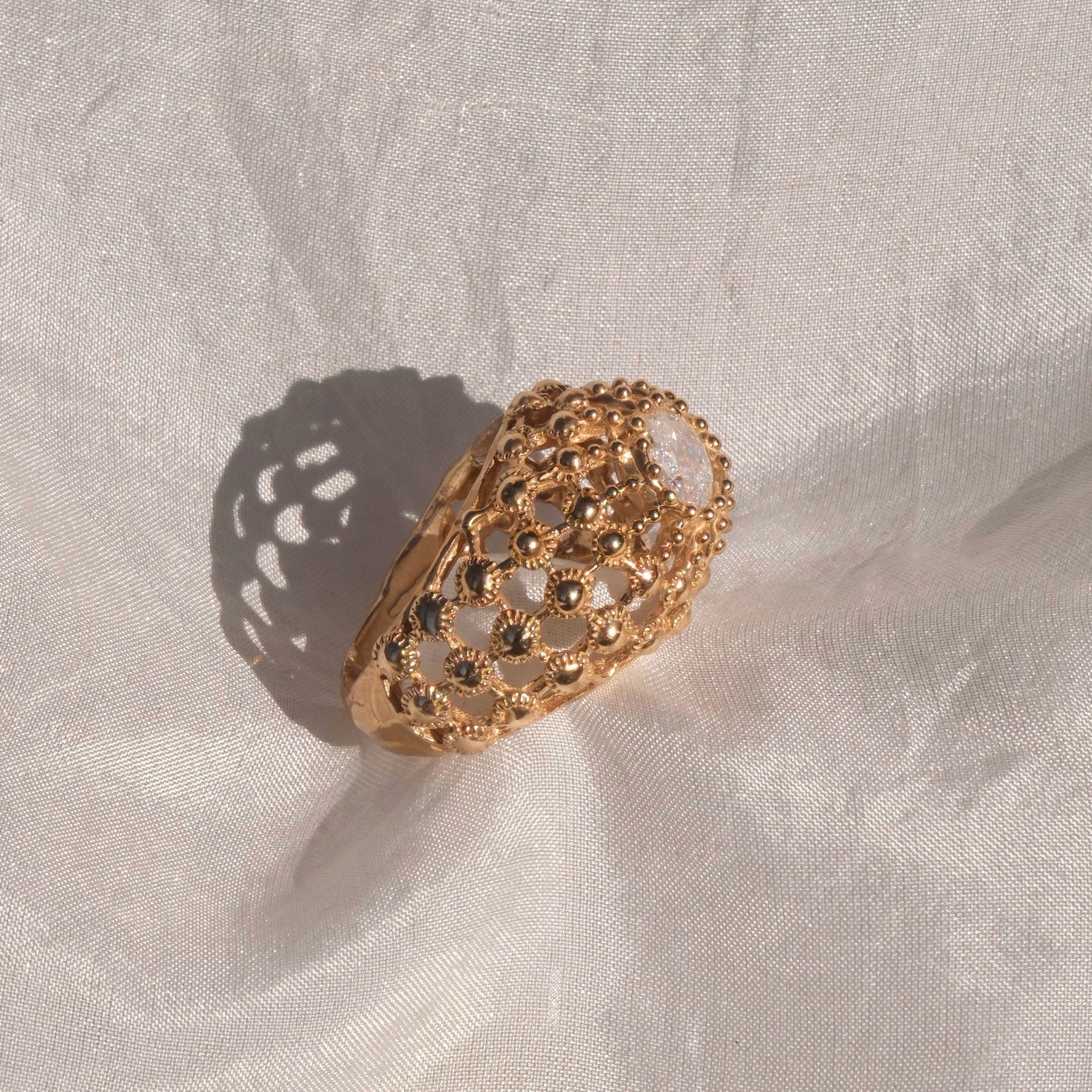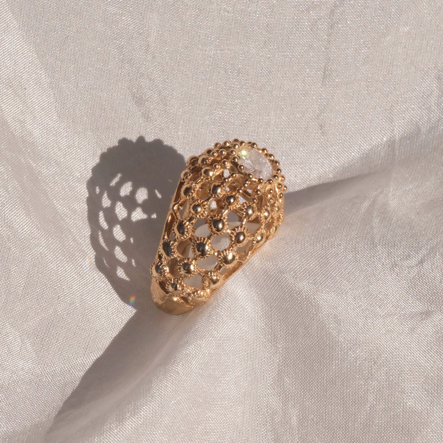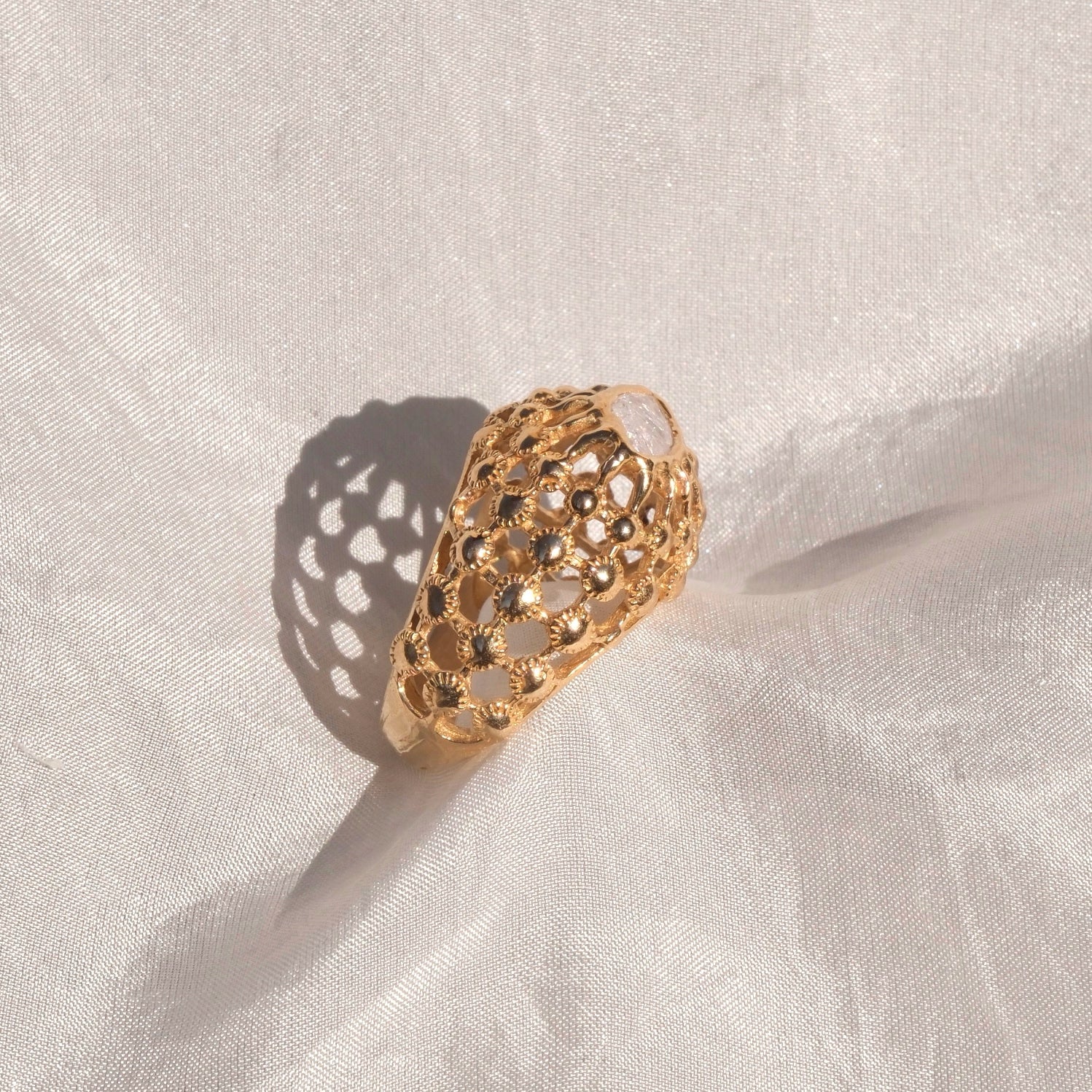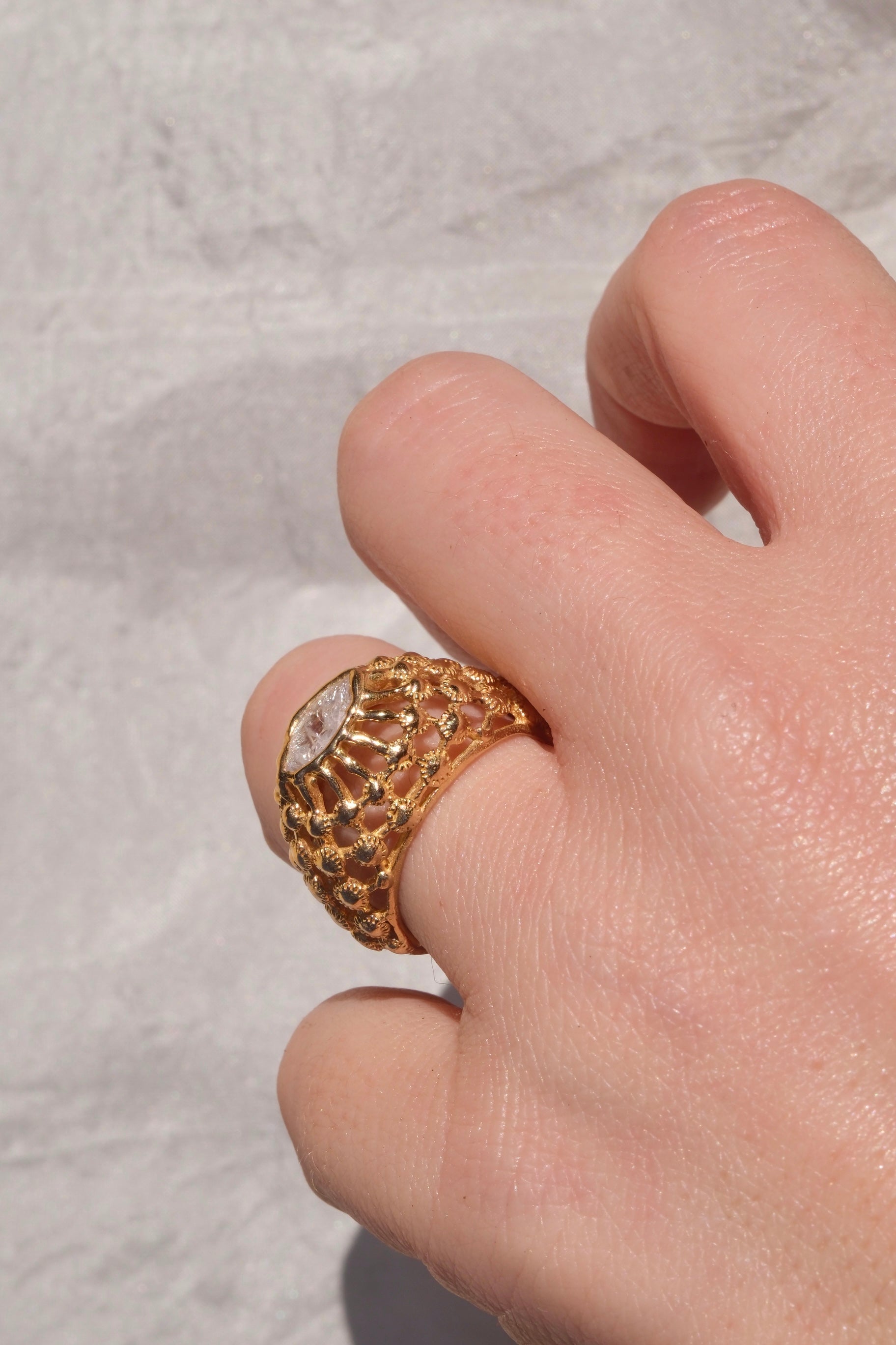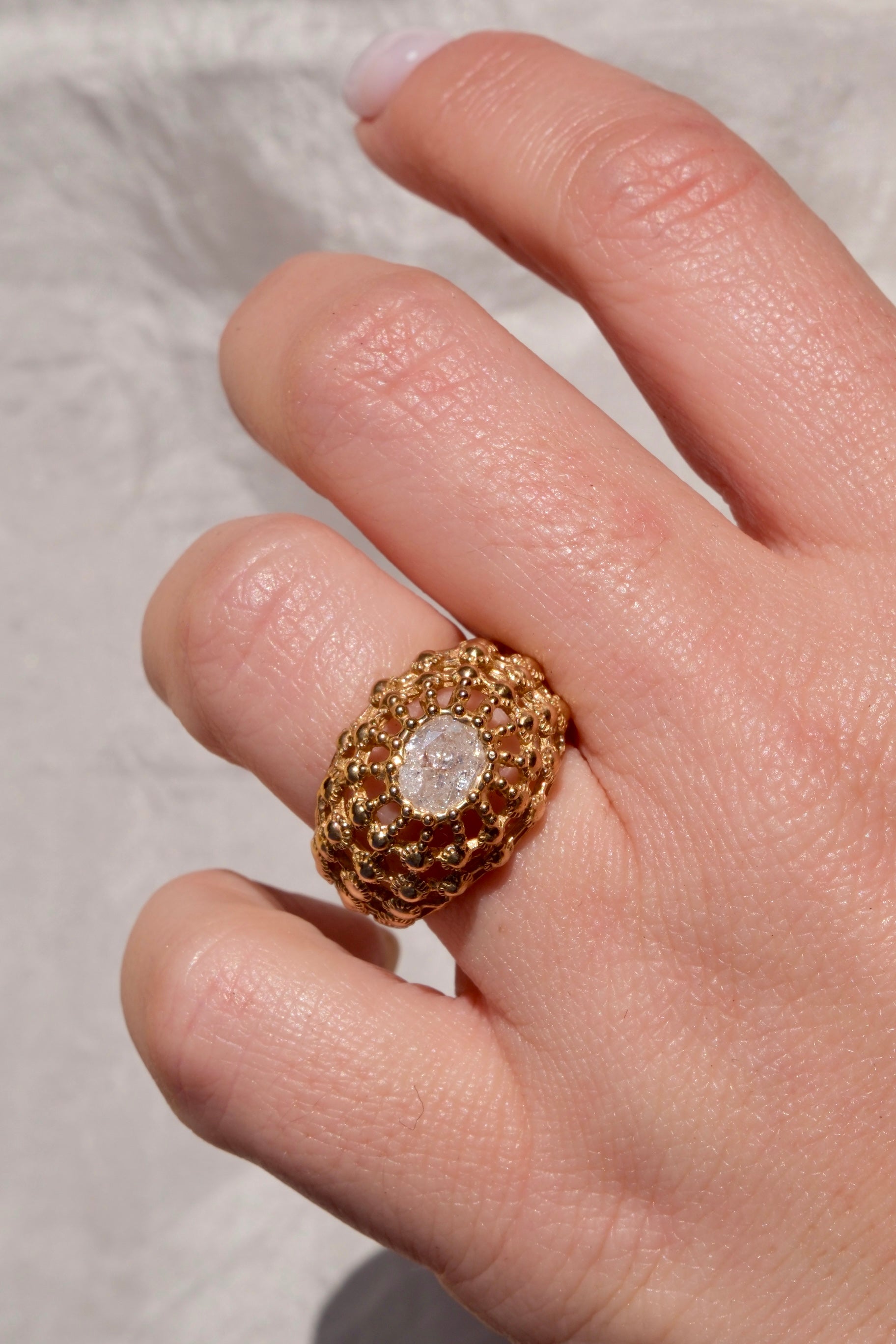 Anello a gabbia in bronzo giallo dal design originale e contemporaneo, caratterizzato da una struttura leggera ma decisa che avvolge la gemma creando un elegante effetto di profondità. Il motivo a gabbia lascia filtrare la luce, esaltando la brillantezza della pietra e donando al gioiello un forte impatto visivo.