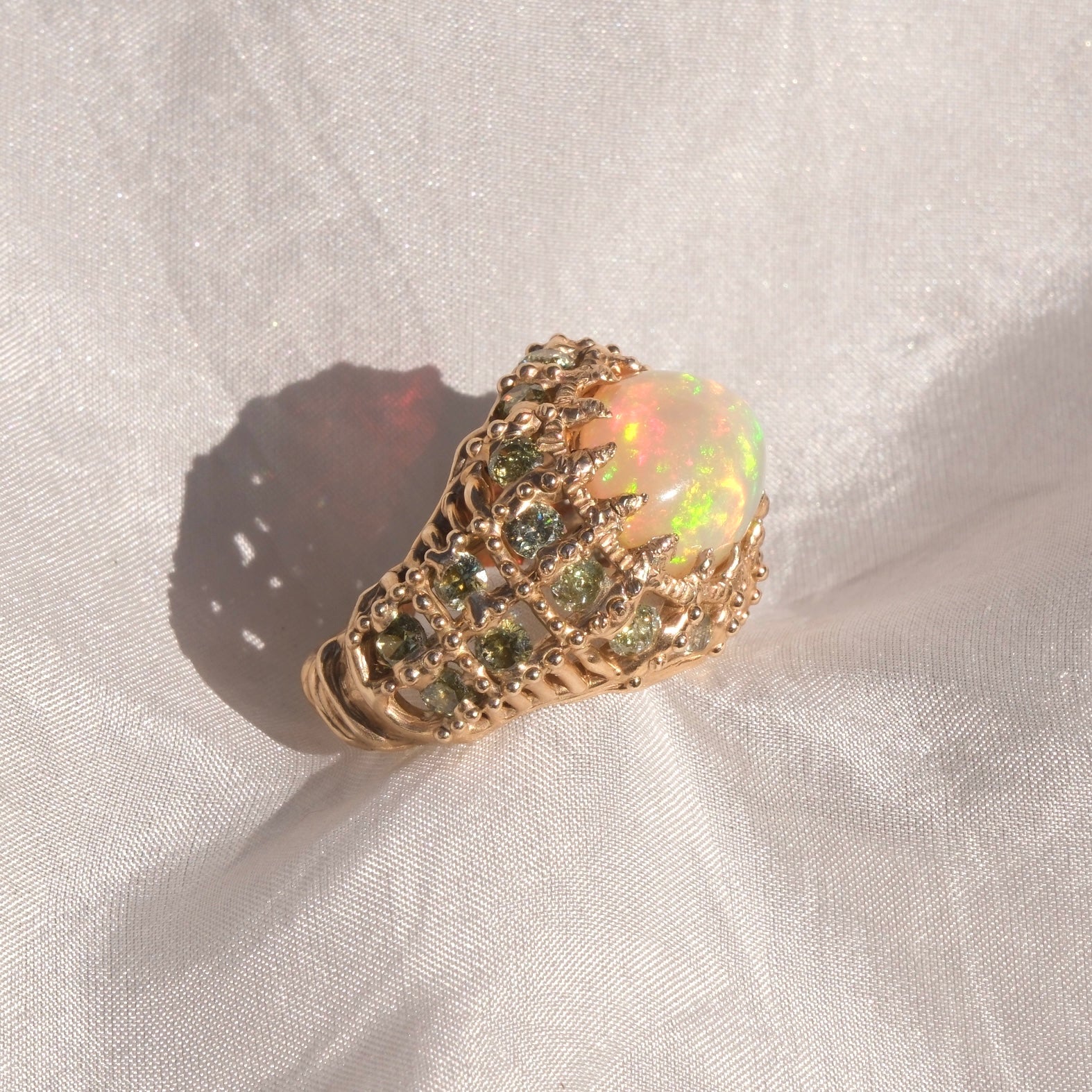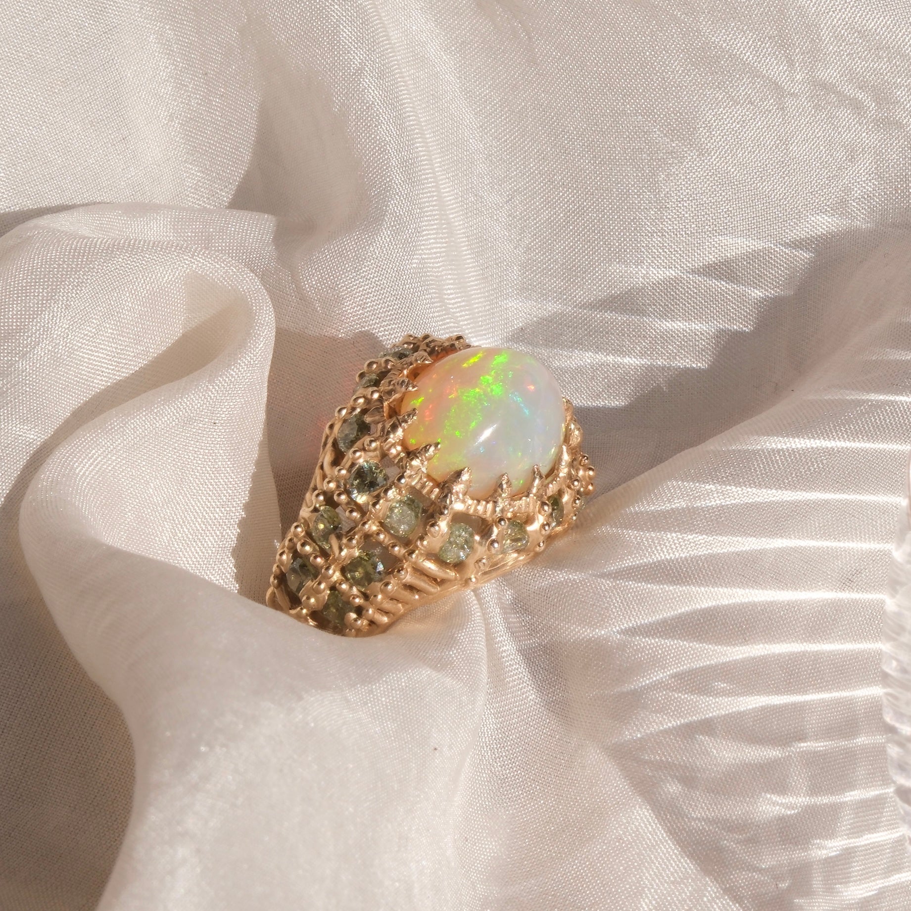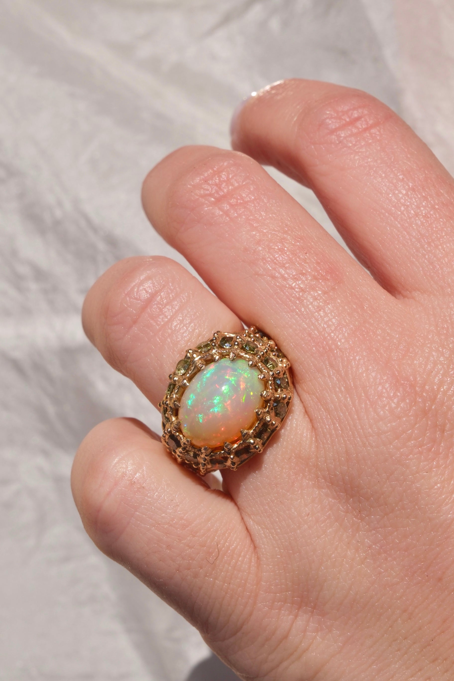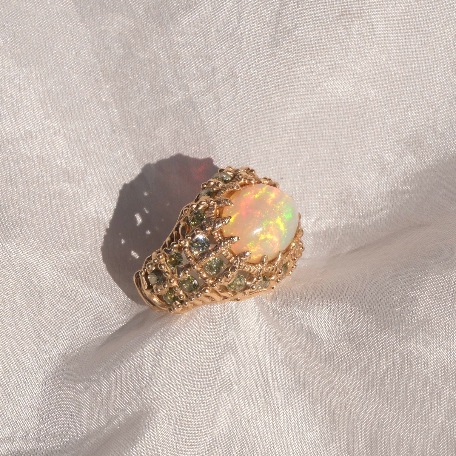 Anello in bronzo giallo dal fascino caldo e luminoso, impreziosito al centro da un opale etiope naturale ovale da 6.05 ct, celebre per i suoi riflessi iridescenti e i giochi di colore che rendono ogni pezzo unico e irripetibile. La gemma centrale è valorizzata da una montatura che ne esalta la luminosità e il carattere etereo.