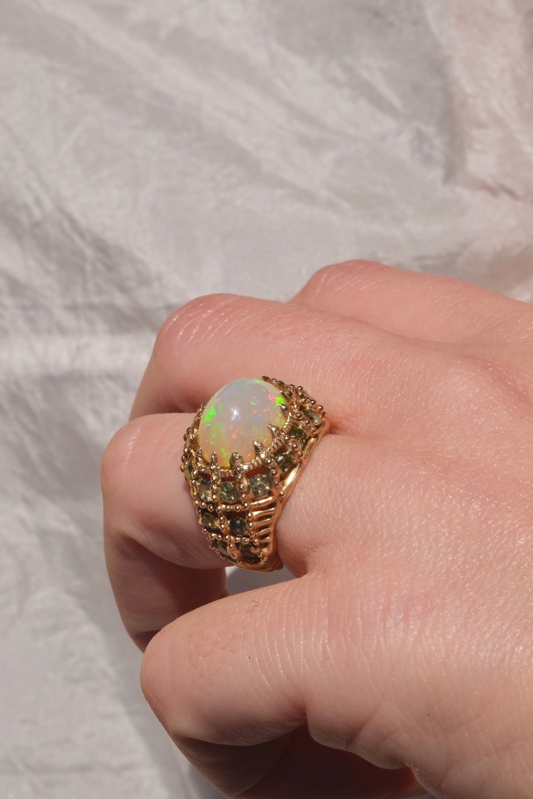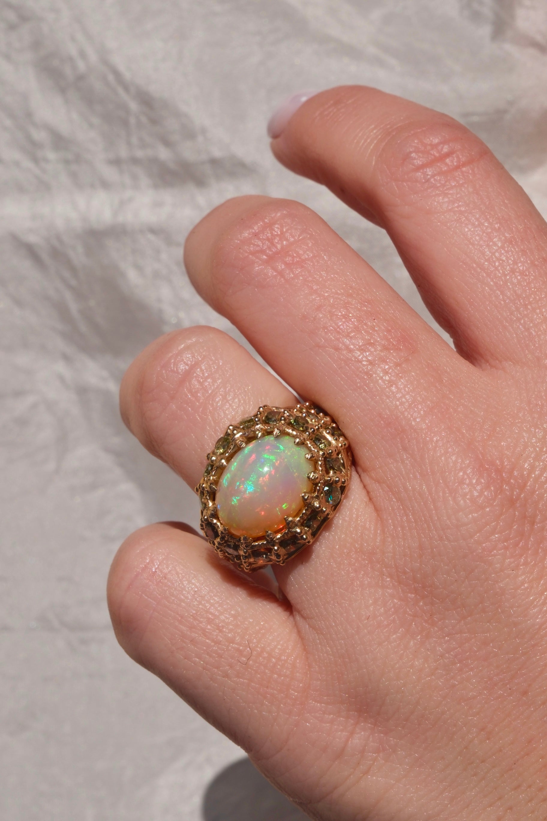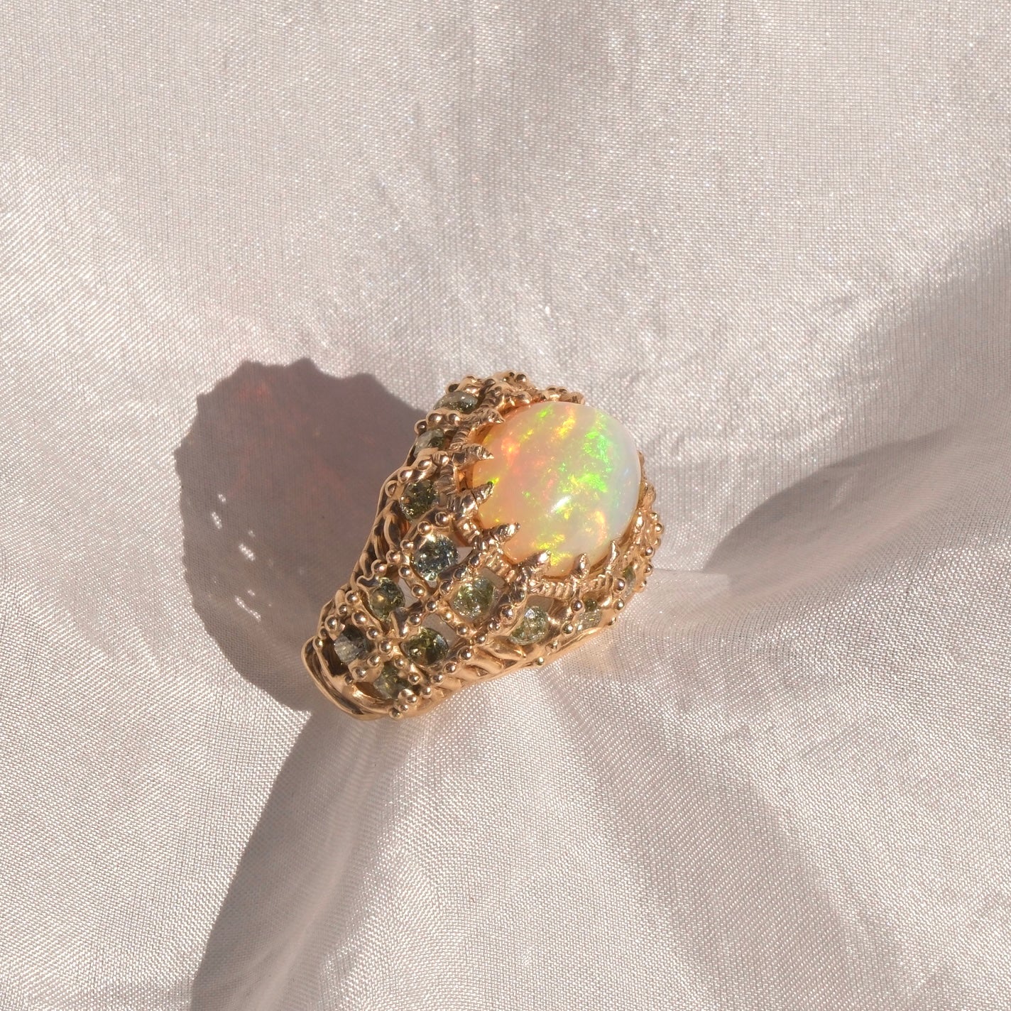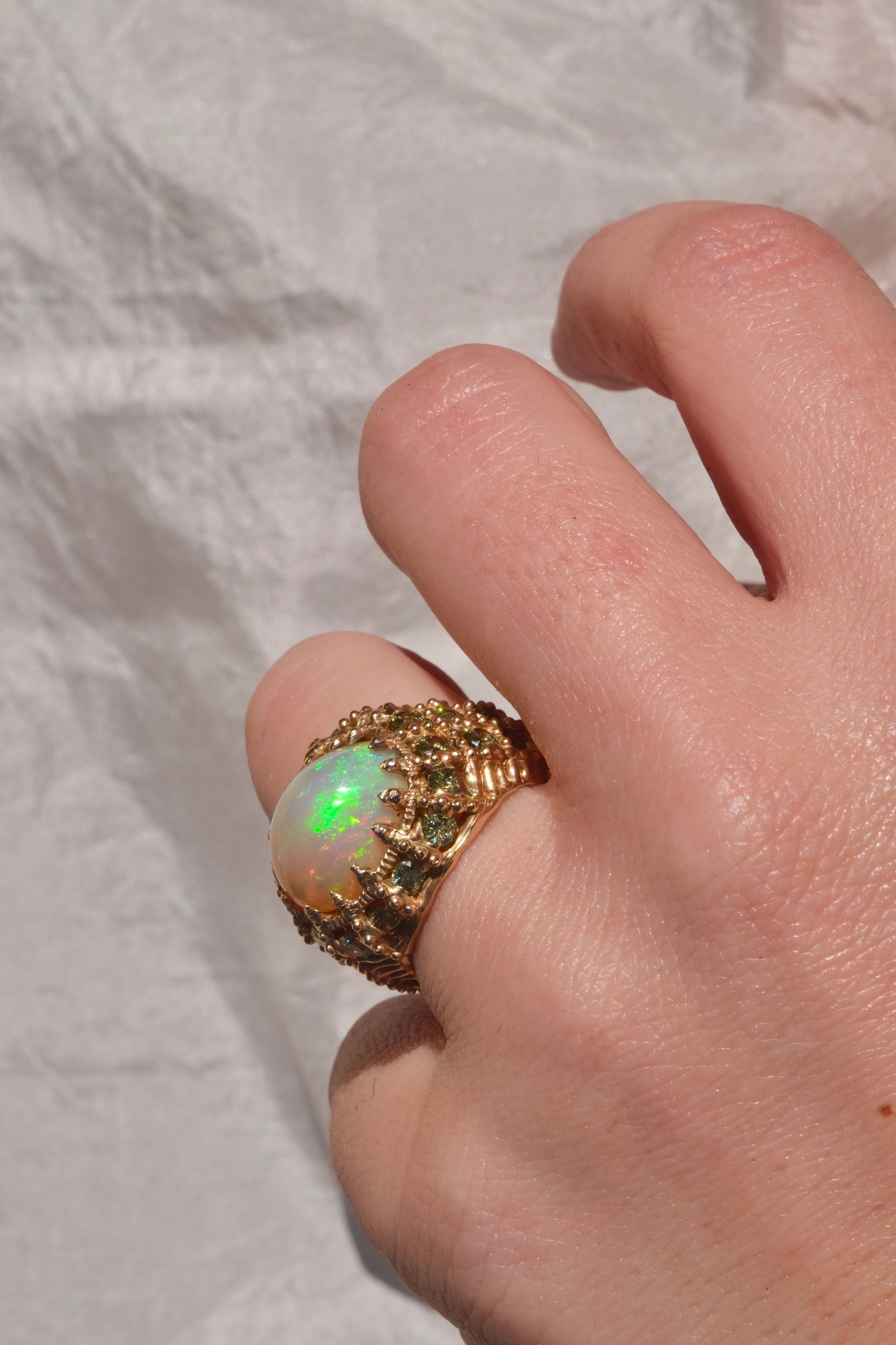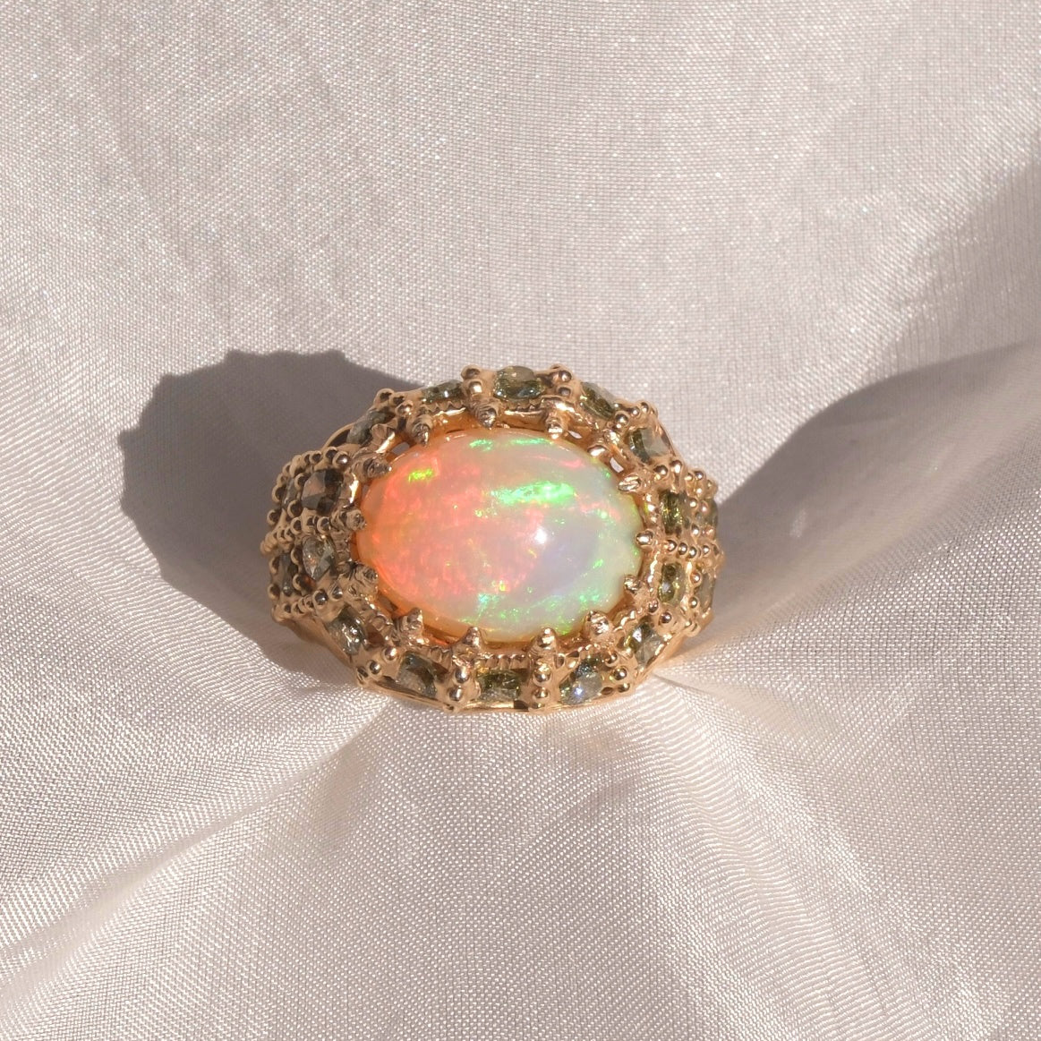 Anello in bronzo giallo dal fascino caldo e luminoso, impreziosito al centro da un opale etiope naturale ovale da 6.05 ct, celebre per i suoi riflessi iridescenti e i giochi di colore che rendono ogni pezzo unico e irripetibile. La gemma centrale è valorizzata da una montatura che ne esalta la luminosità e il carattere etereo.