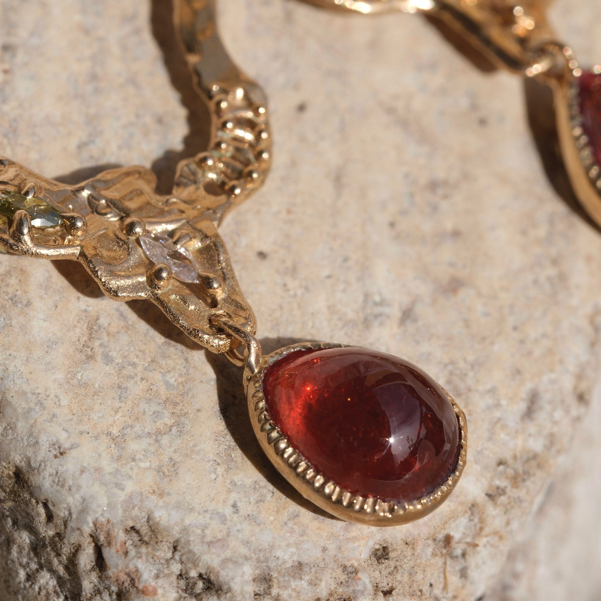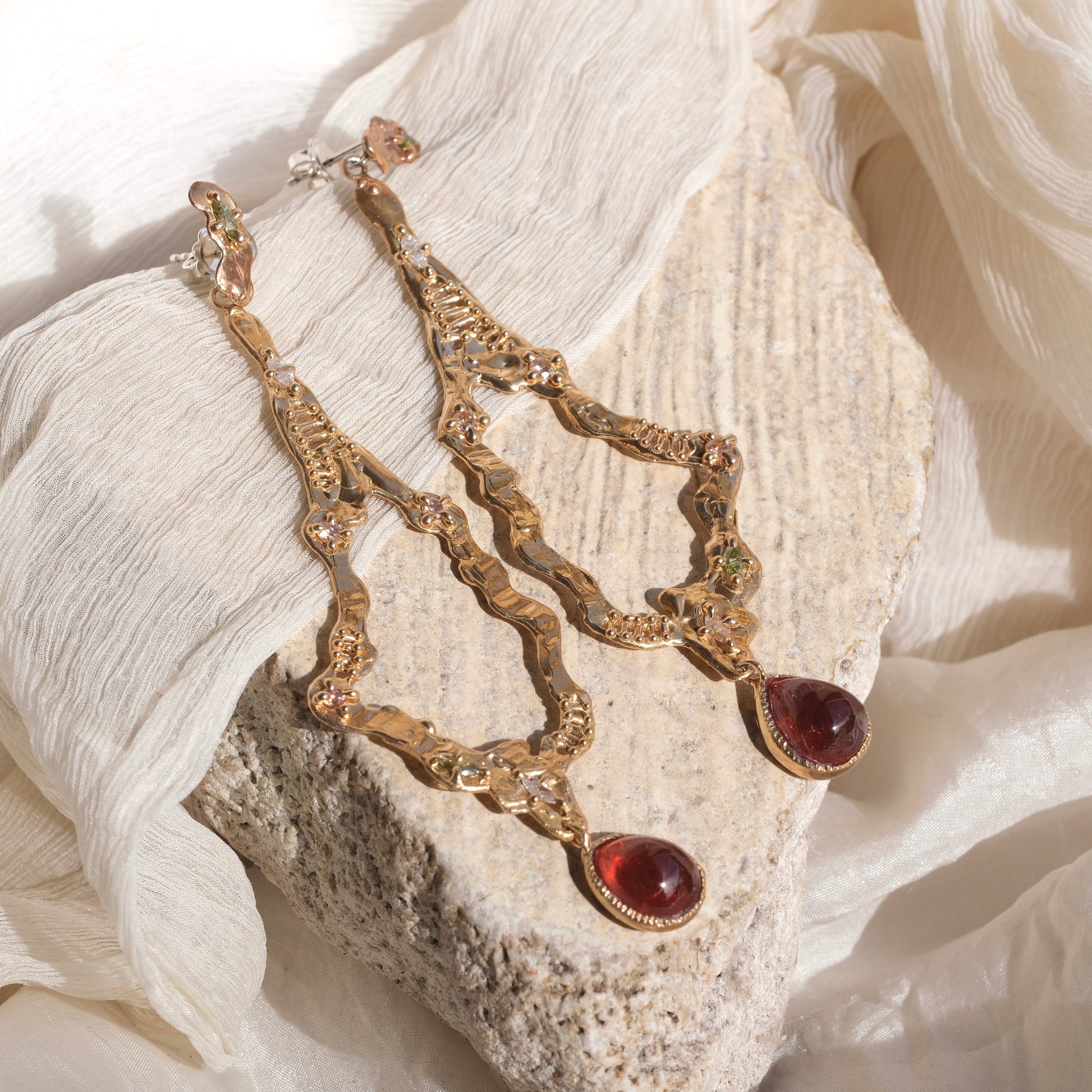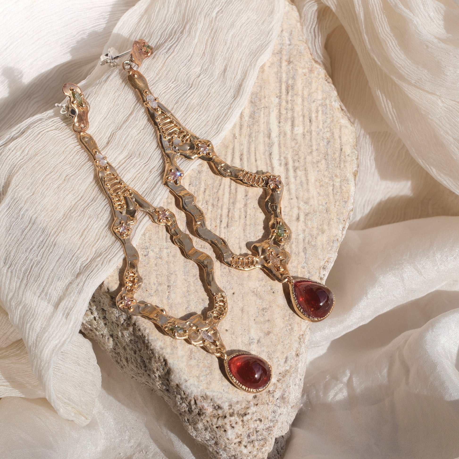 Un gioiello che unisce calore, luce e raffinatezza. Questi orecchino in bronzo giallo sono impreziositi da granati mandarino cabochon a goccia, le cui tonalità aranciate profonde catturano lo sguardo, e da zirconi bianchi, che aggiungono brillantezza e luminosità.