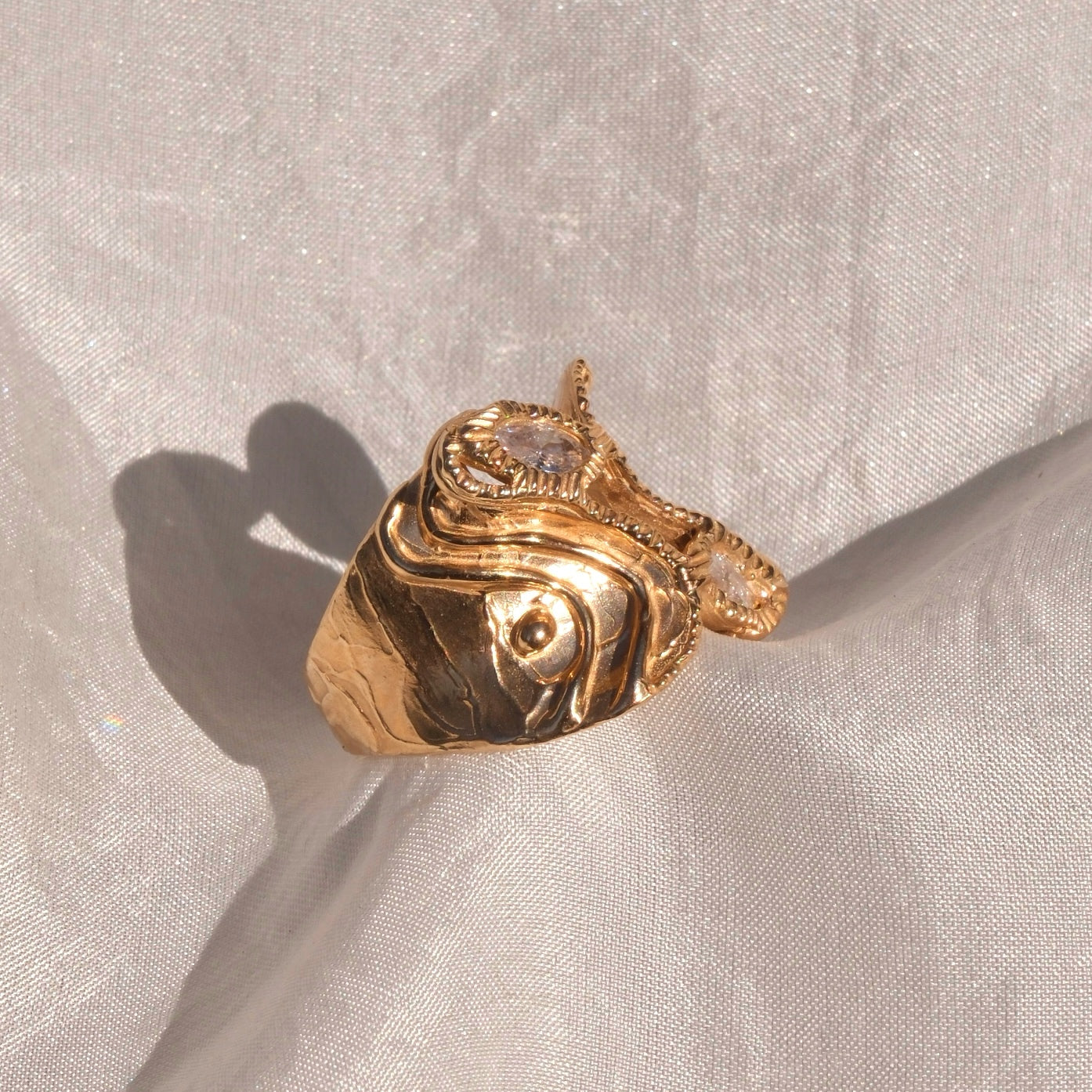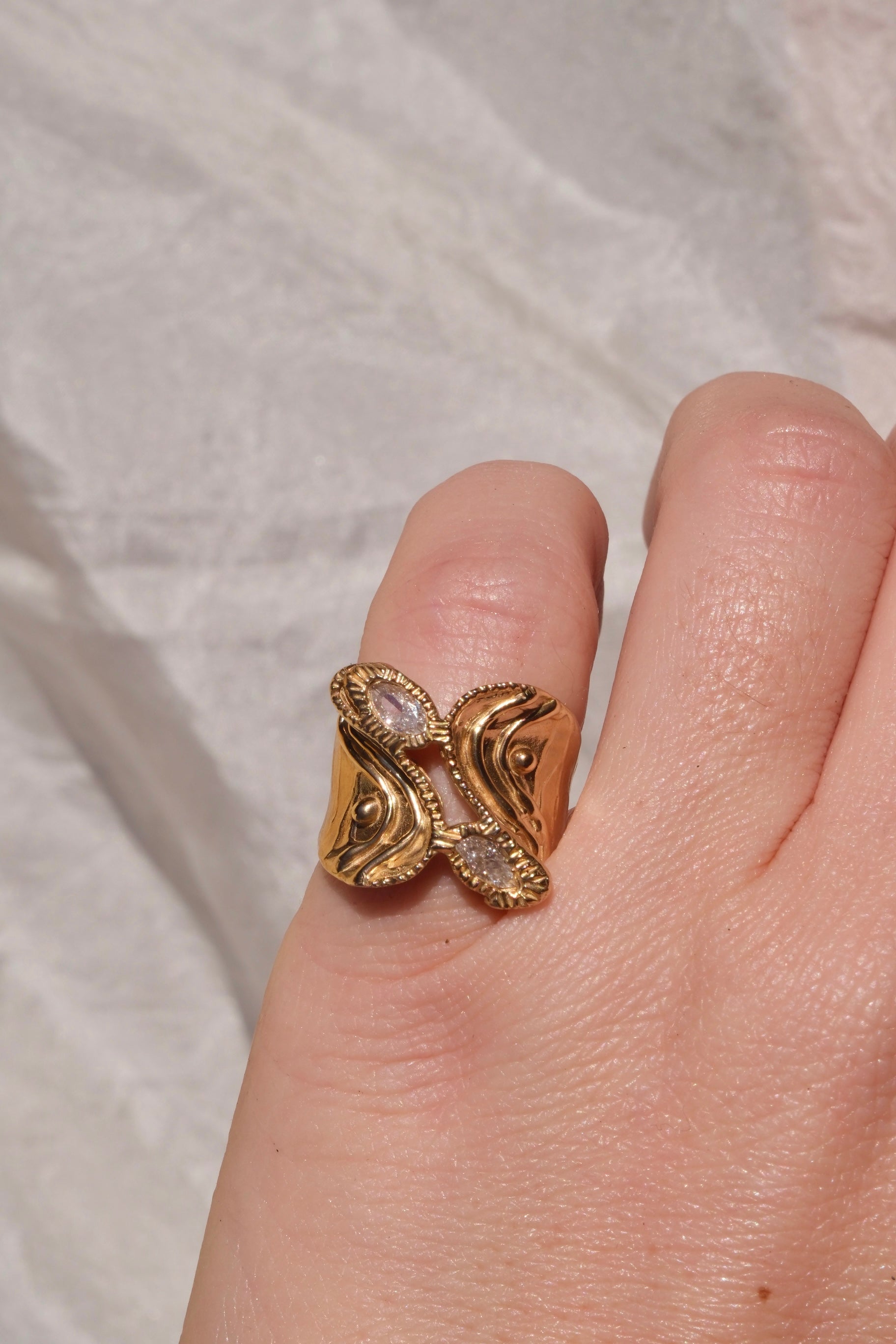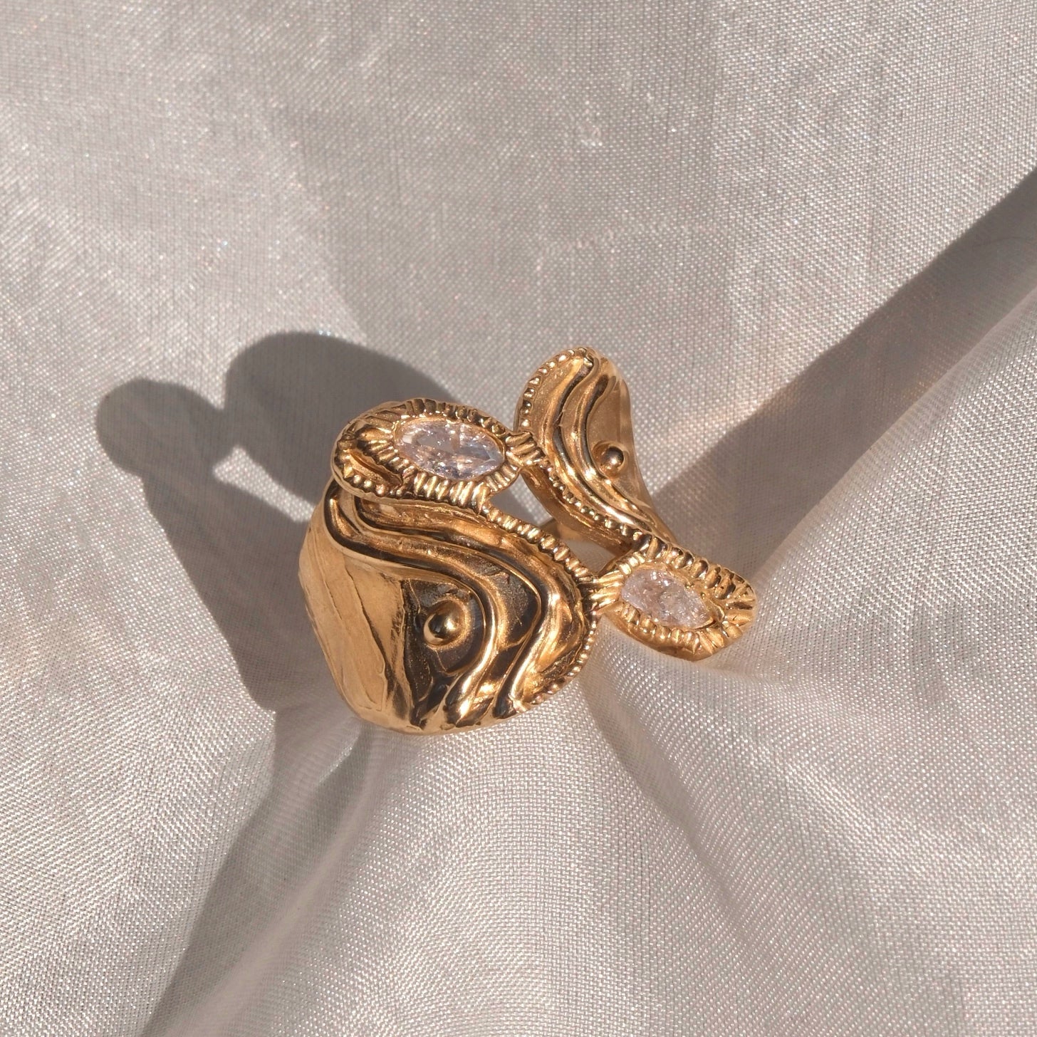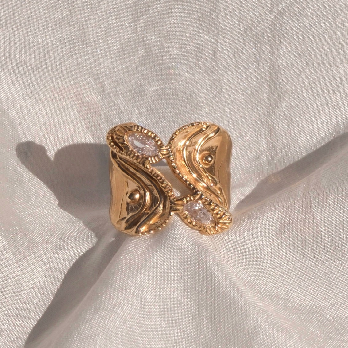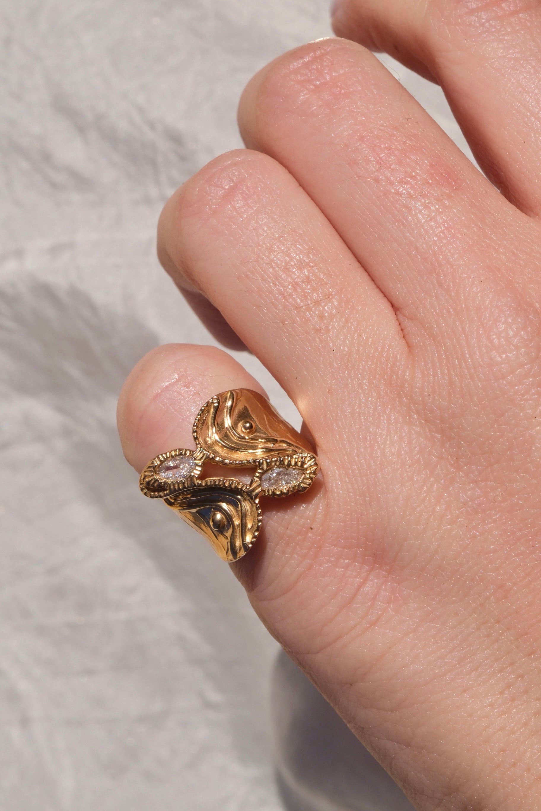 Anello in bronzo giallo dal design elegante e armonioso, impreziosito da due cubic zirconia a taglio navette che donano slancio e raffinatezza alla composizione. La particolare forma allungata delle gemme esalta la luminosità e crea un delicato gioco di riflessi, valorizzando la linea dell’anello.
