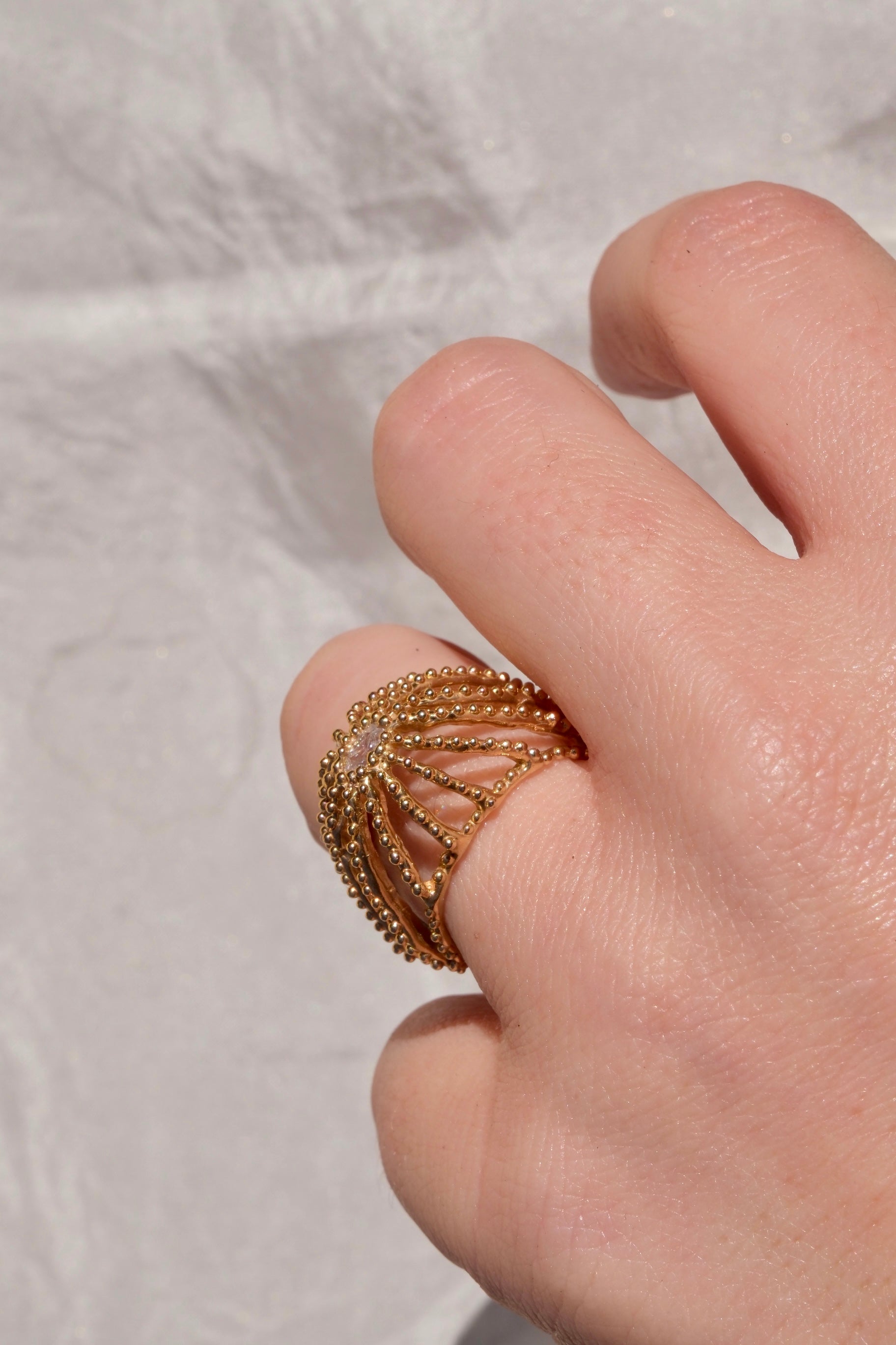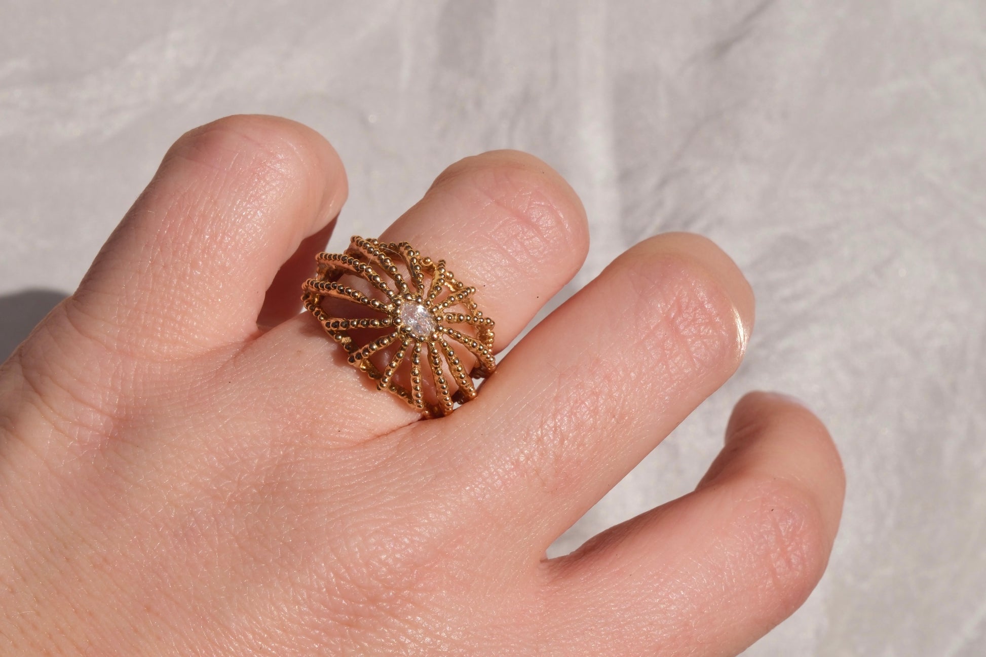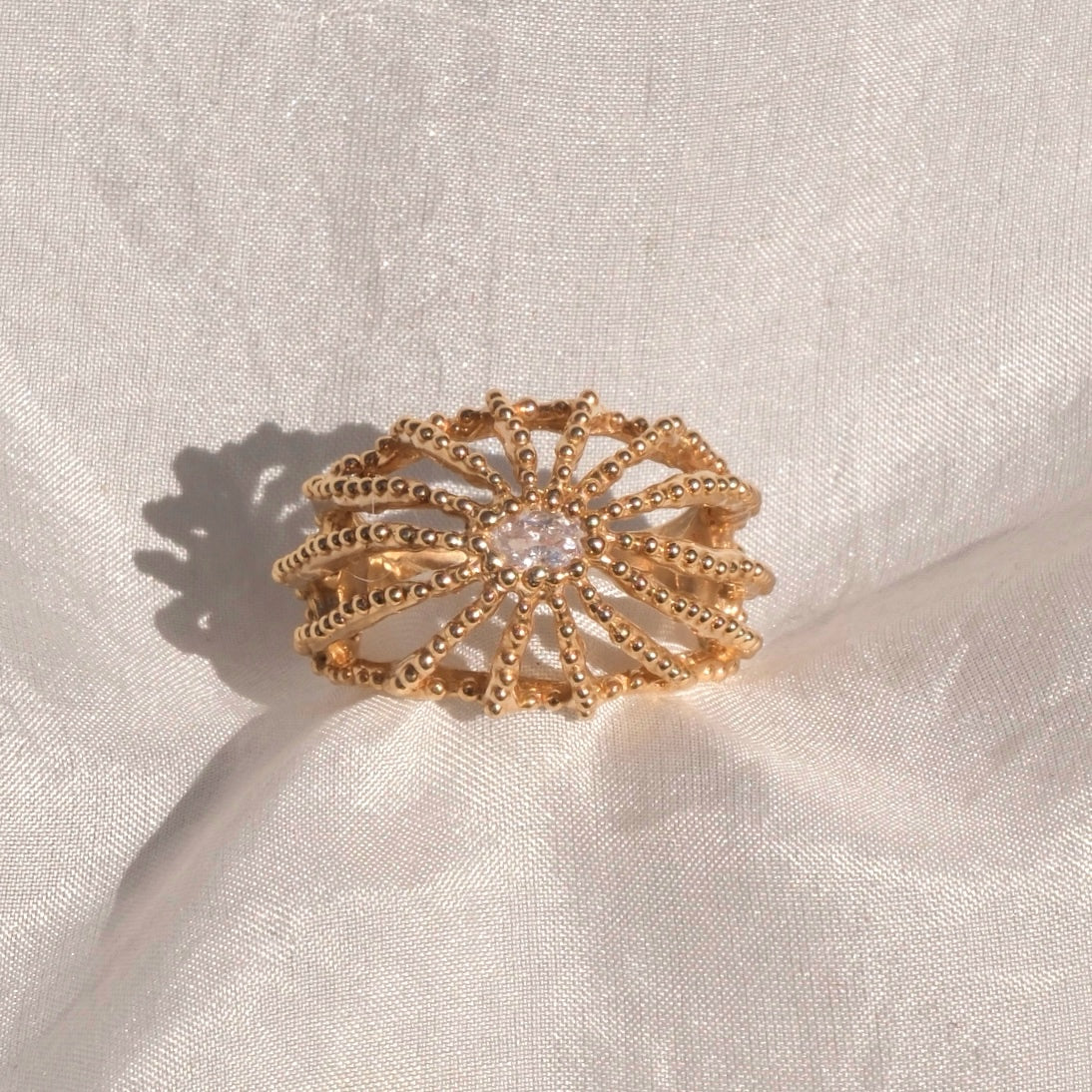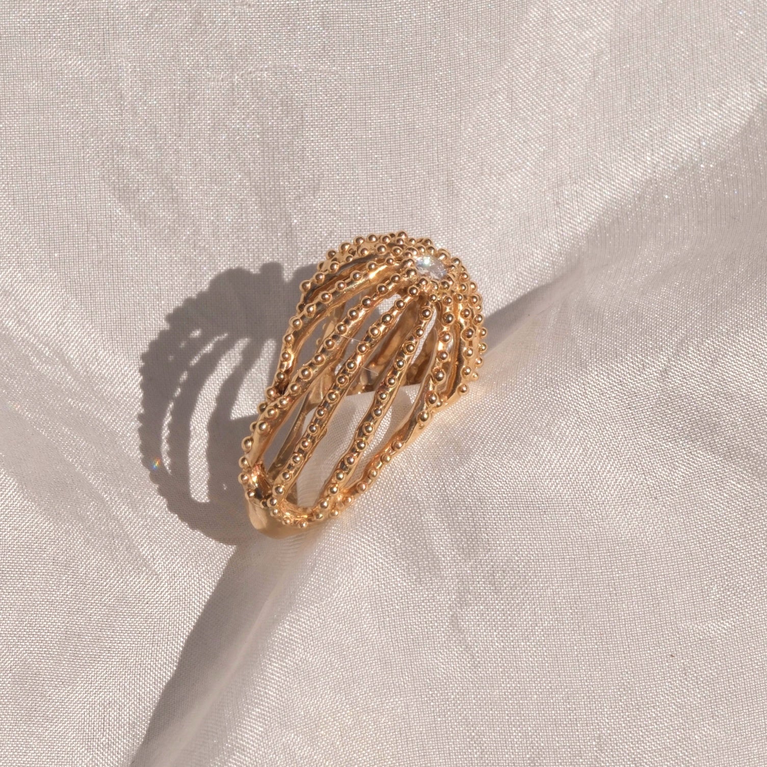 Anello in bronzo dal design ispirato alla natura, caratterizzato da una zirconia bianca a taglio marquise come protagonista centrale. La particolare disposizione e forma dell’anello richiamano la struttura di un riccio marino, creando un effetto tridimensionale e dinamico che cattura la luce da ogni angolazione.