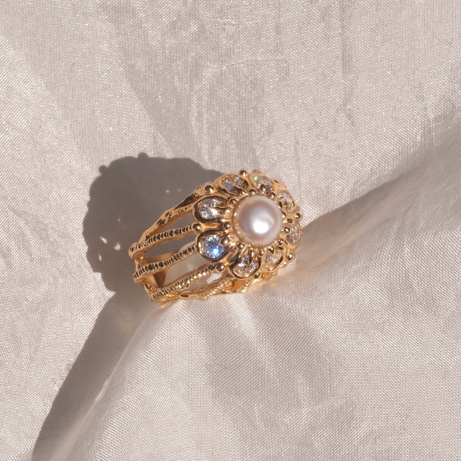 Anello in bronzo giallo dal fascino delicato e luminoso, impreziosito al centro da una perla naturale rosa, scelta per le sue morbide sfumature cipria e la sua eleganza senza tempo. La perla è valorizzata da una cornice di cubic zirconia bianca che la contorna, creando un raffinato effetto di luce e mettendo in risalto la sua naturale luminosità.