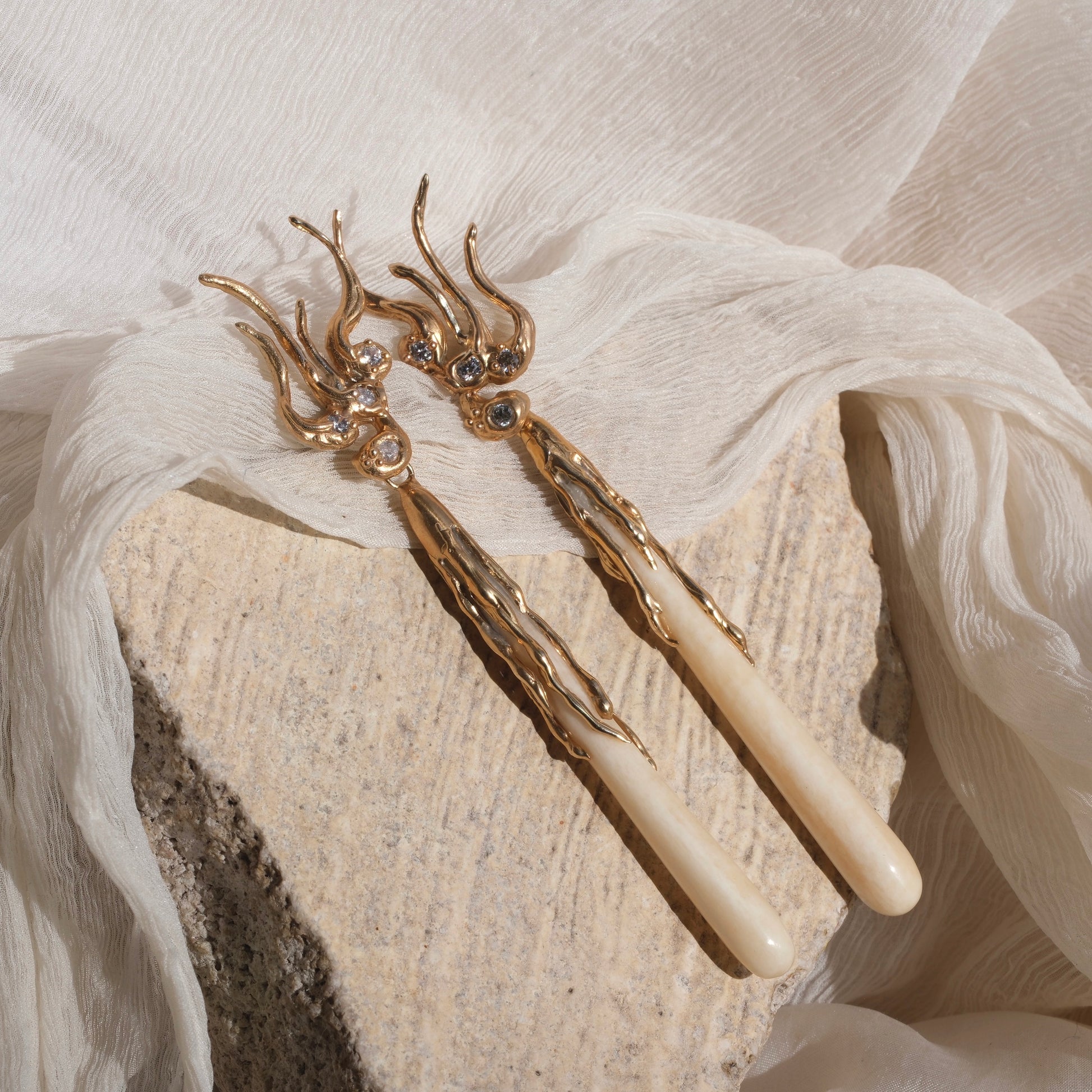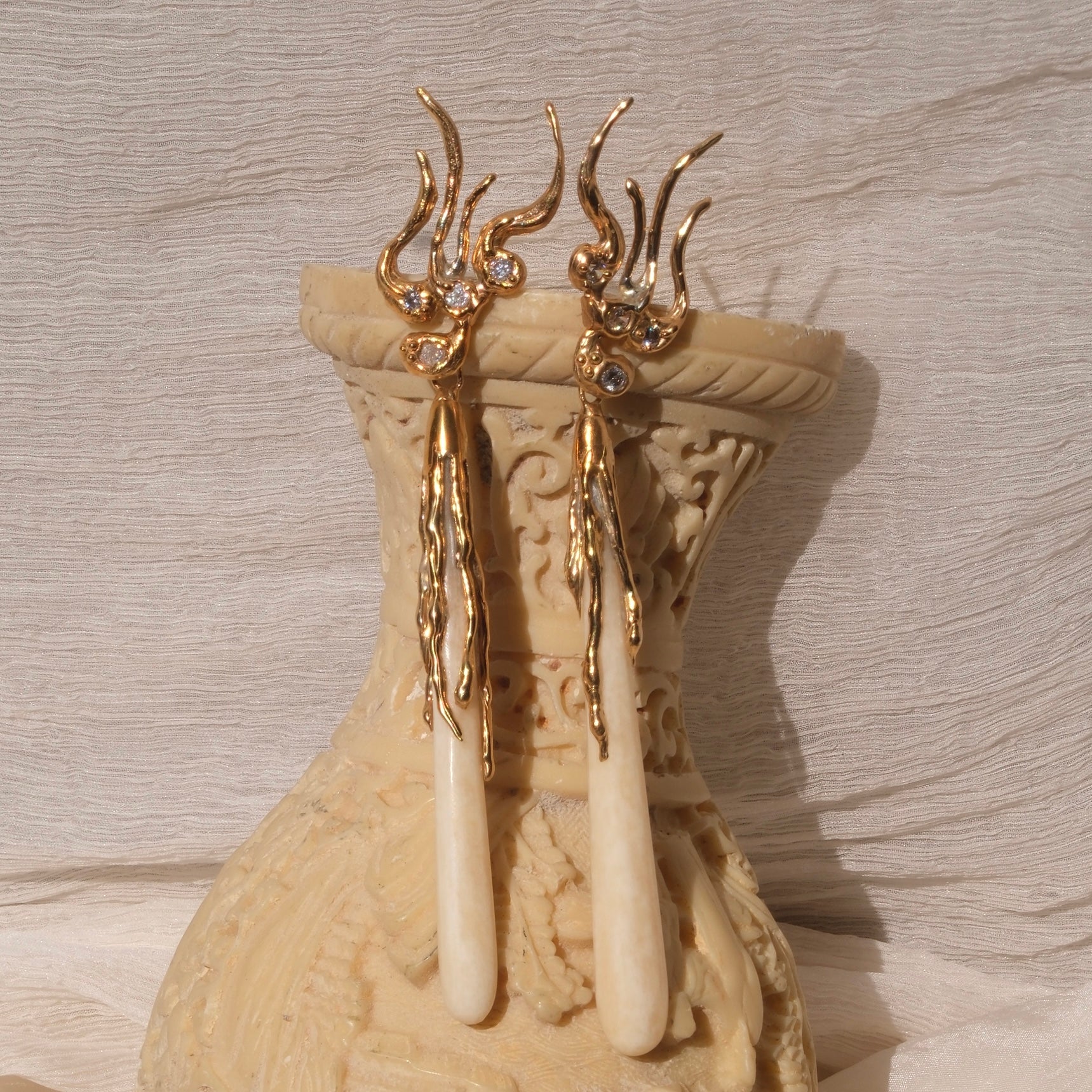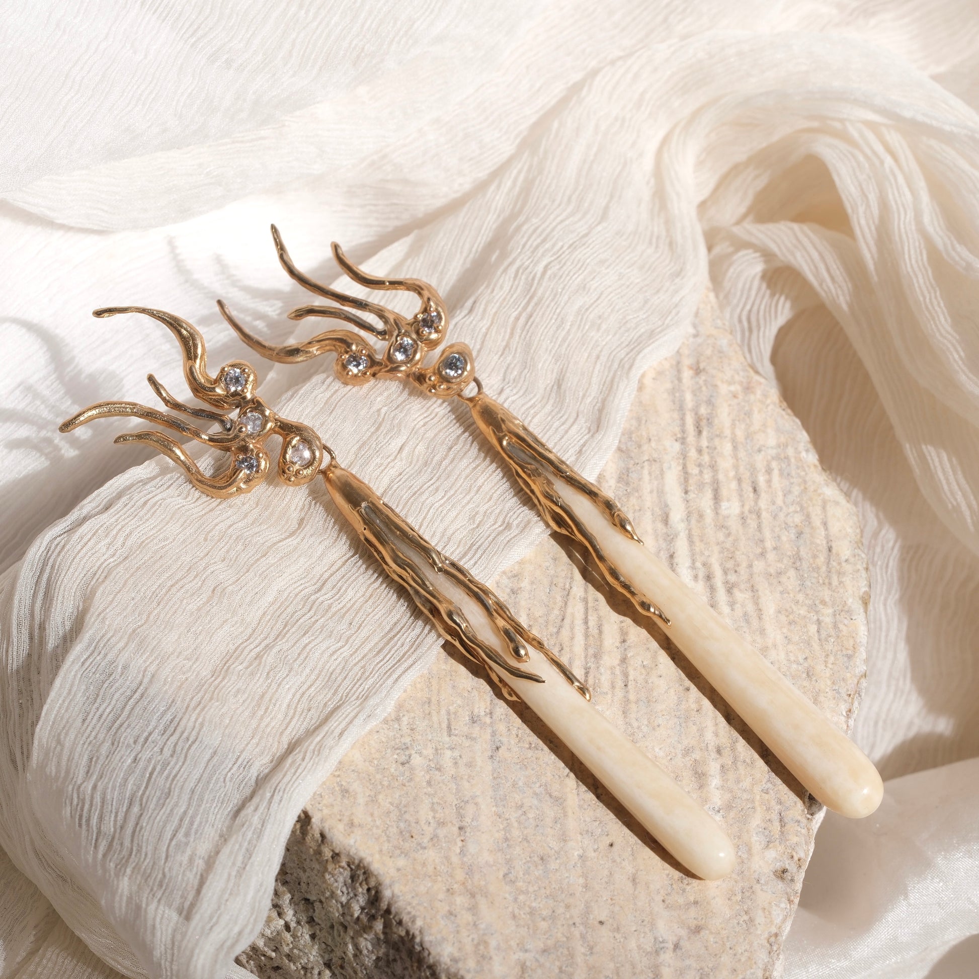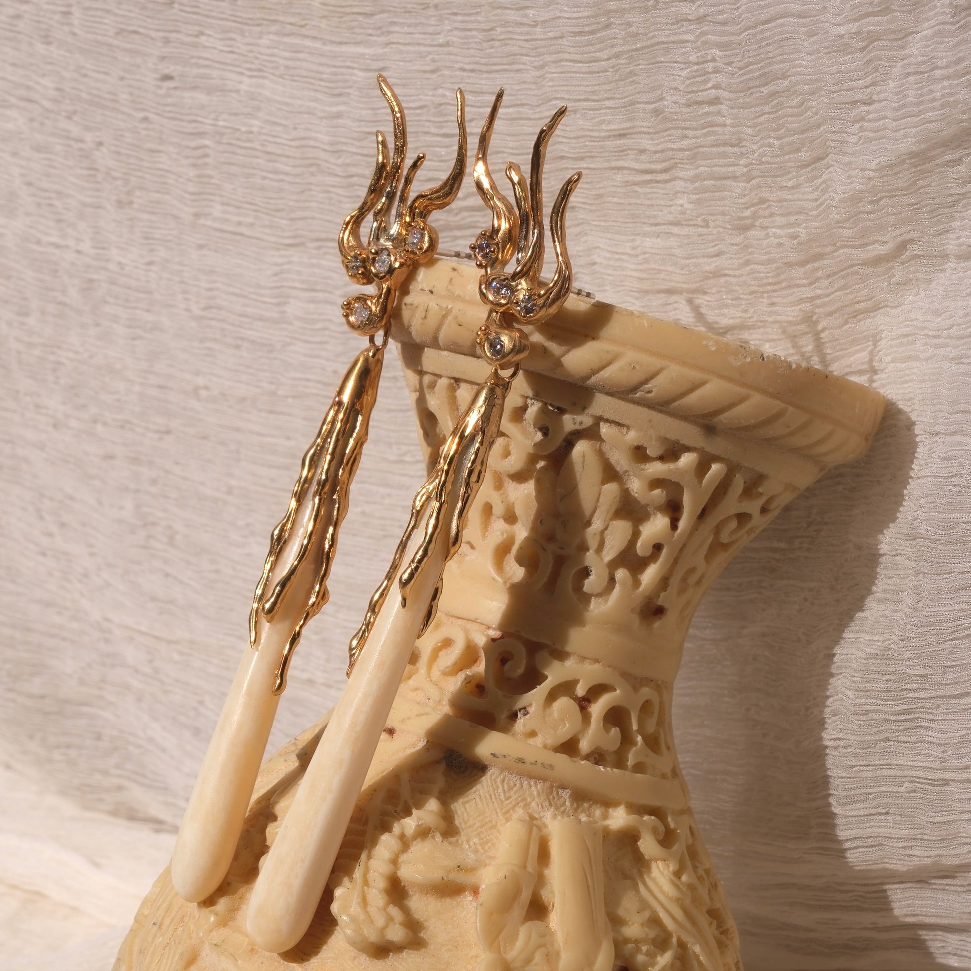 Un gioiello dal fascino contemporaneo e naturale. Questi raffinati orecchini in bronzo giallo sono impreziositi da zirconi bianchi che donano brillantezza e luminosità, mentre lunghe gocce di corno aggiungono movimento e un tocco di stile etnico-chic.