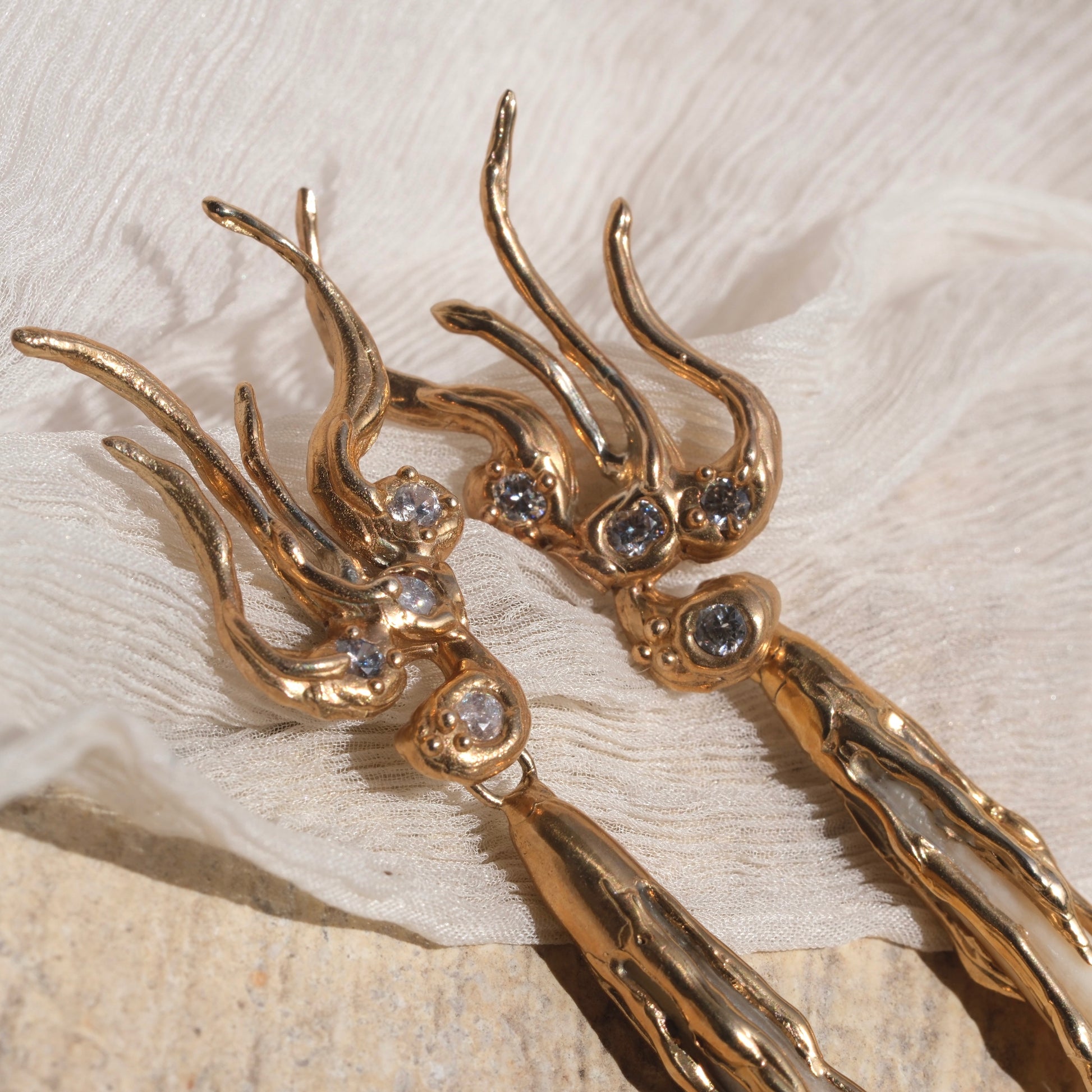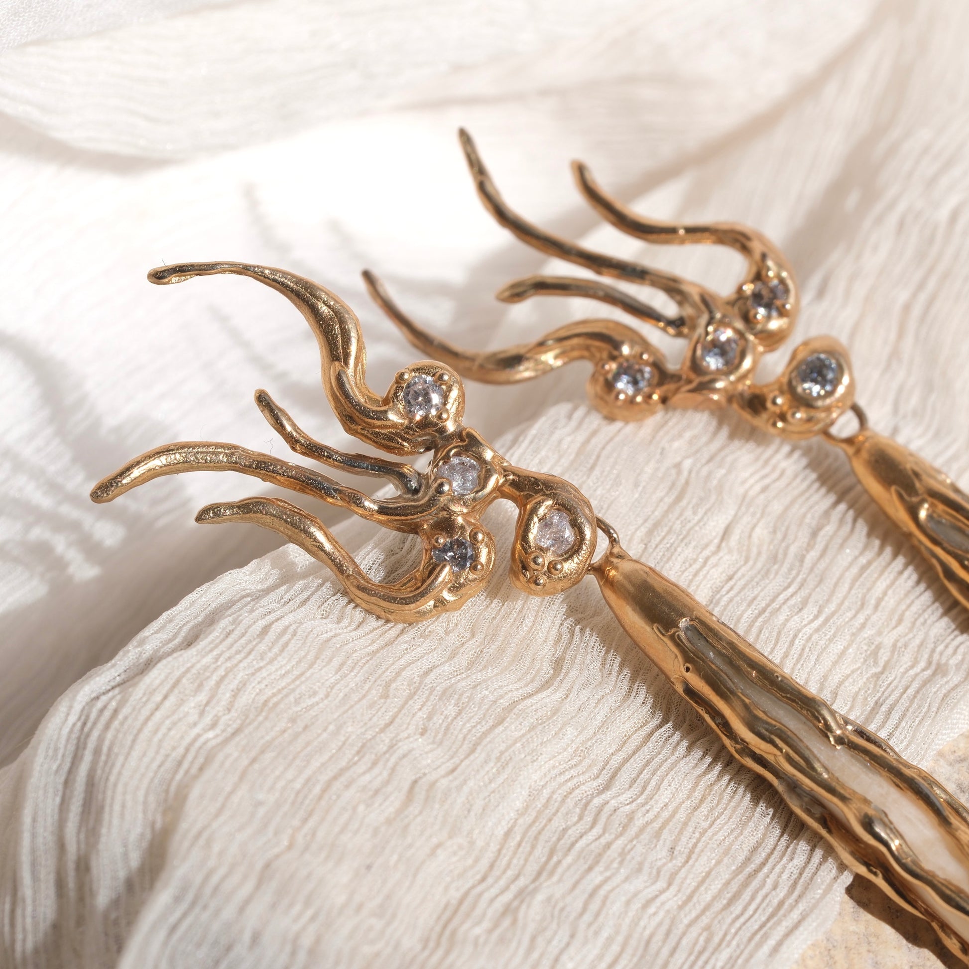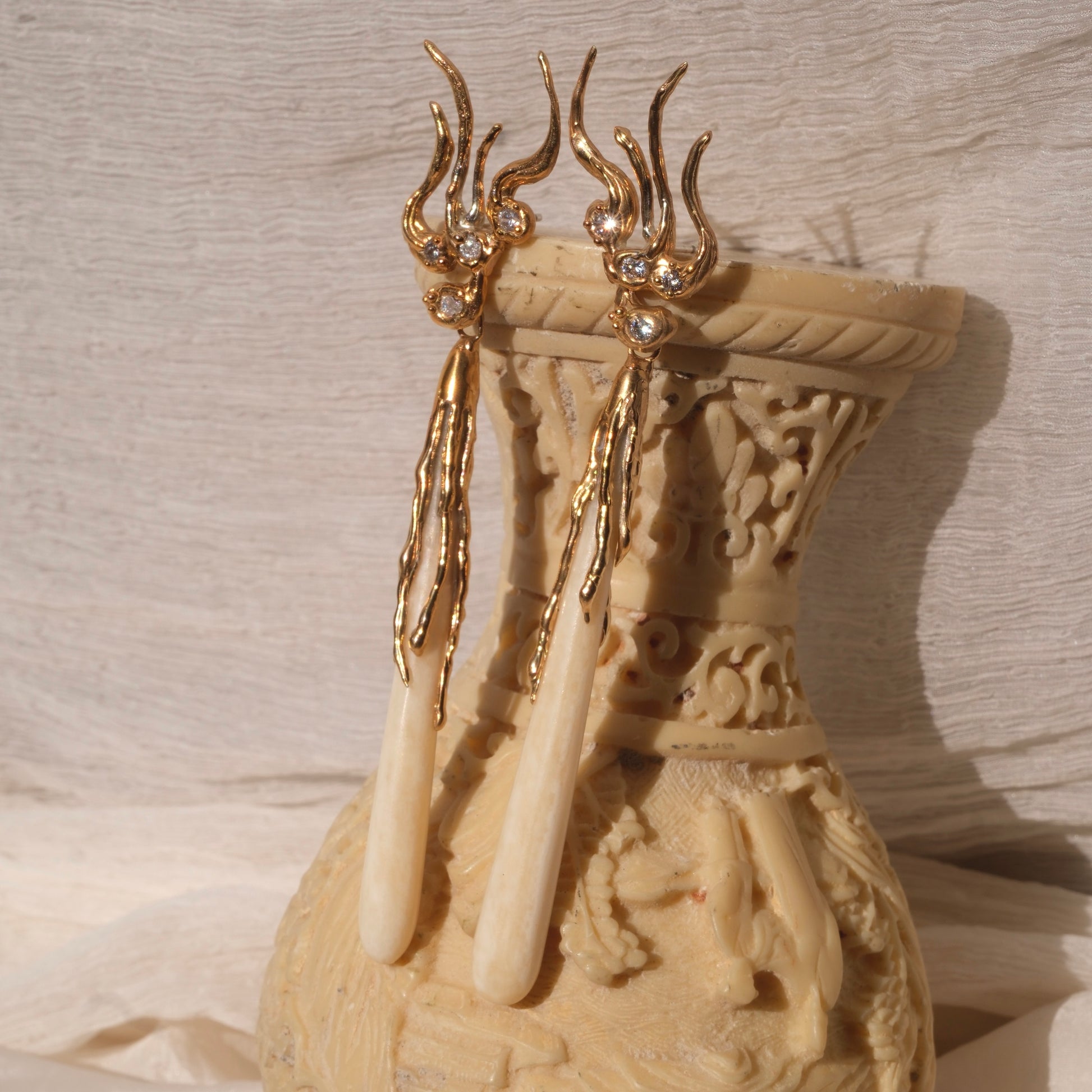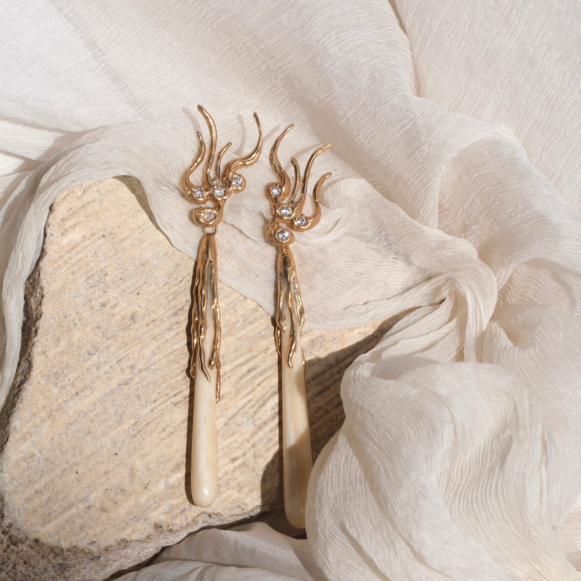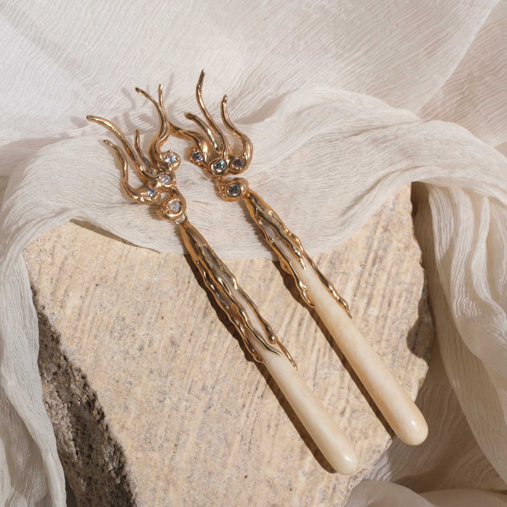 Un gioiello dal fascino contemporaneo e naturale. Questi raffinati orecchini in bronzo giallo sono impreziositi da zirconi bianchi che donano brillantezza e luminosità, mentre lunghe gocce di corno aggiungono movimento e un tocco di stile etnico-chic.