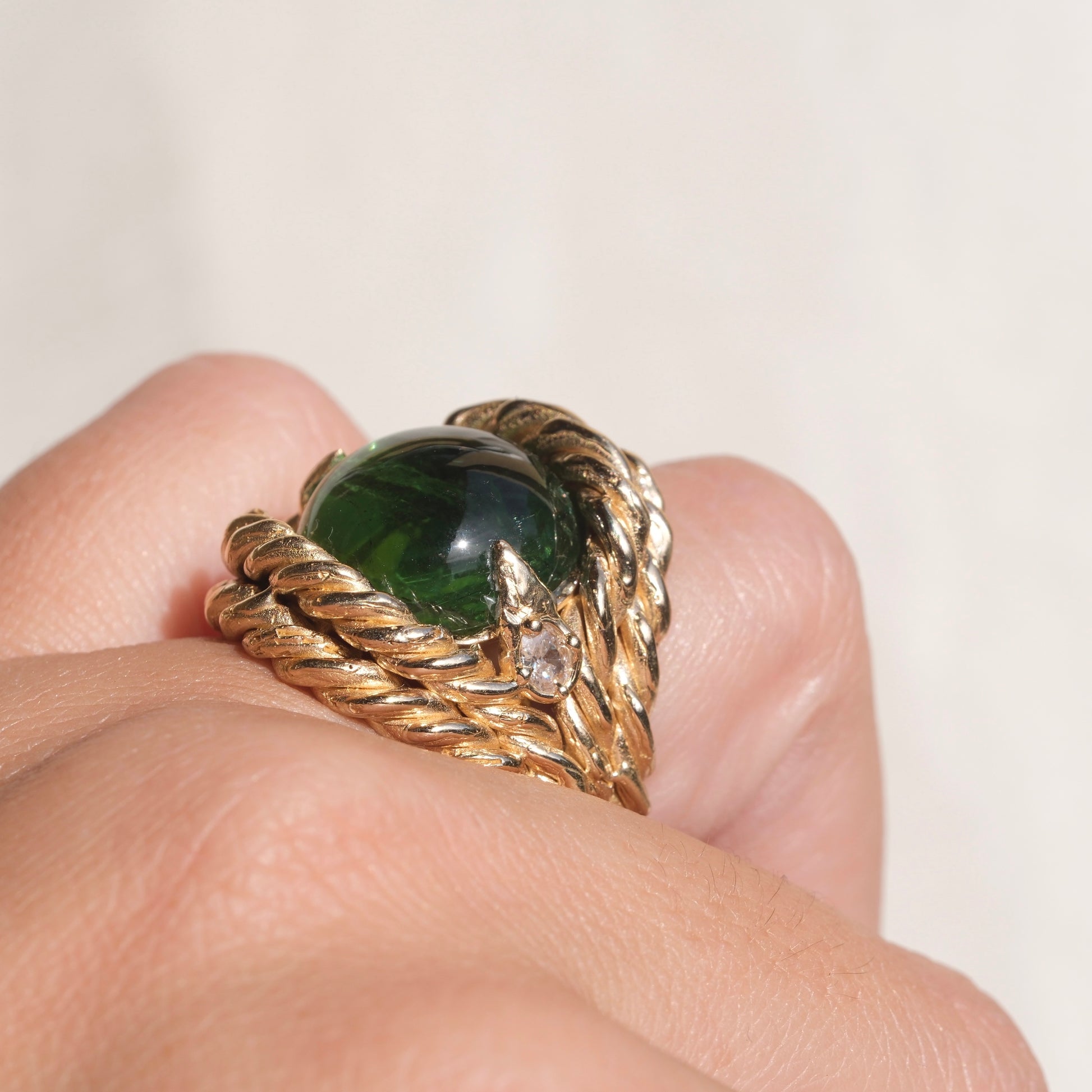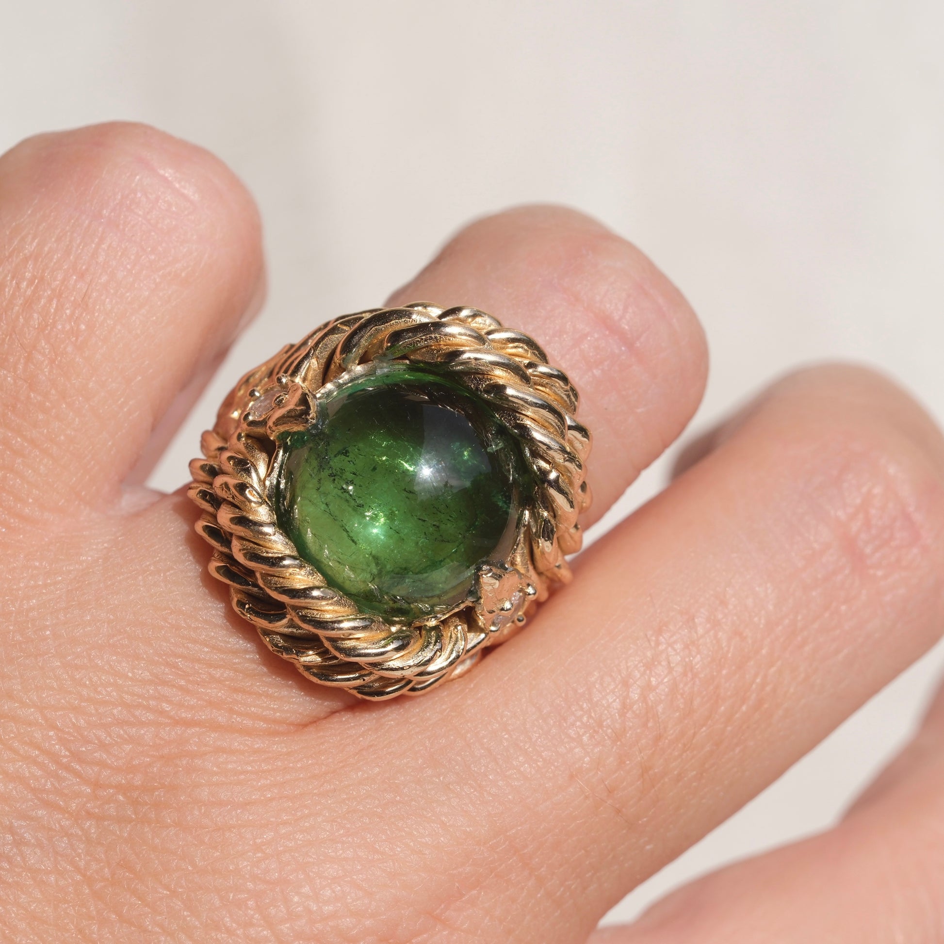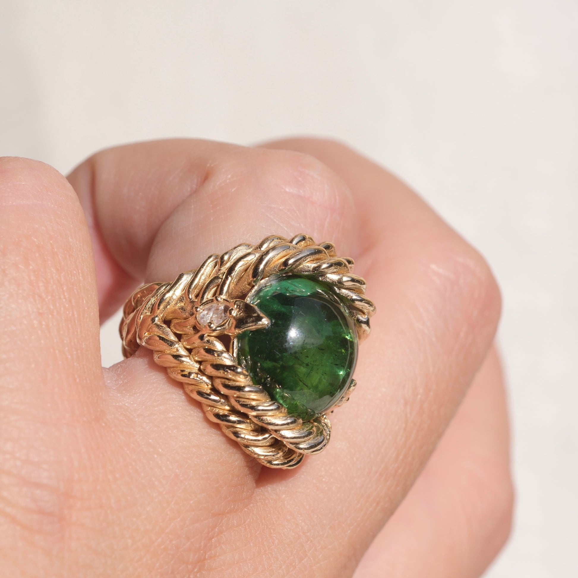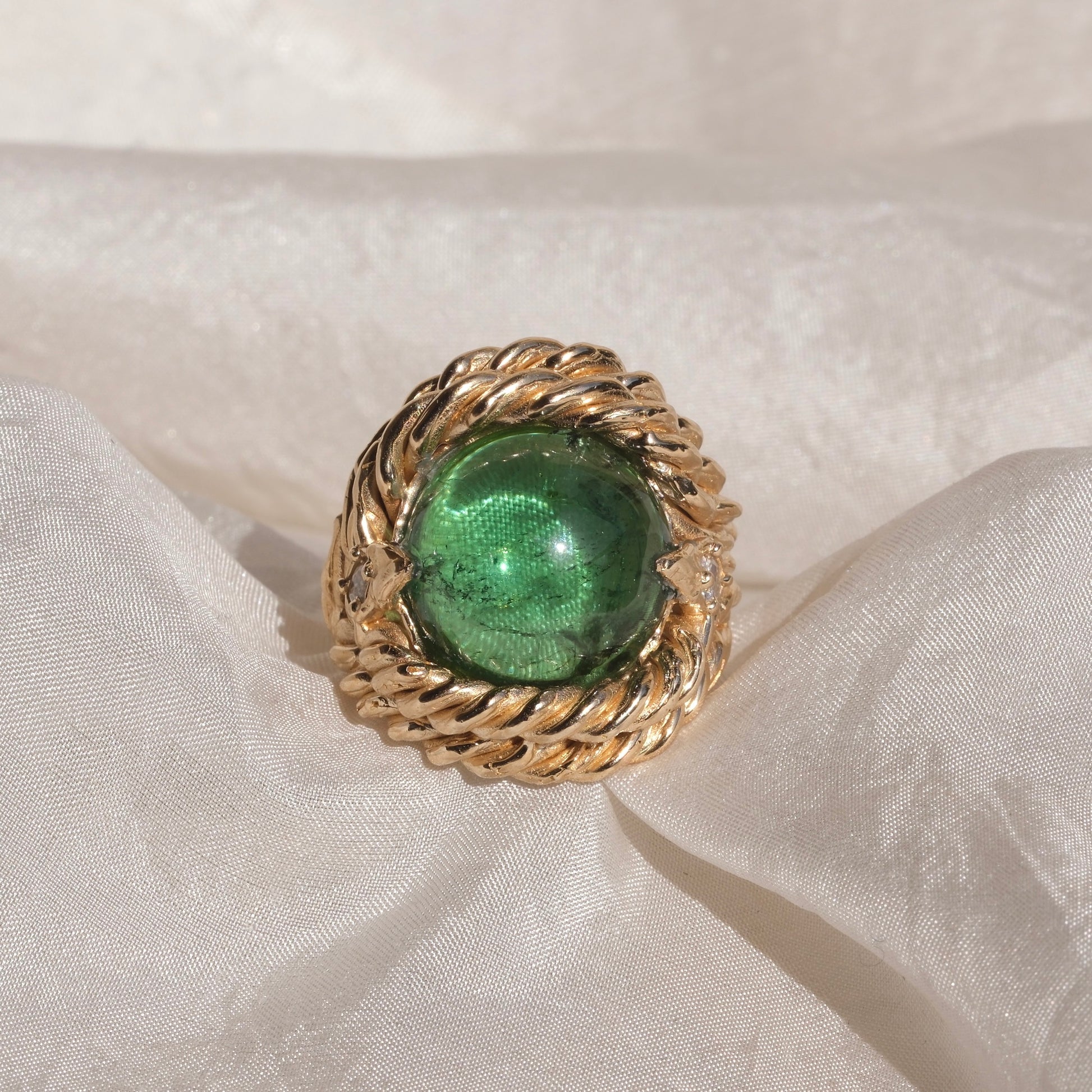 Raffinato anello realizzato in bronzo giallo, impreziosito da una tormalina verde taglio cabochon (16.79ct) e zirconi bianchi taglio a goccia che ne esaltano la lucentezza.