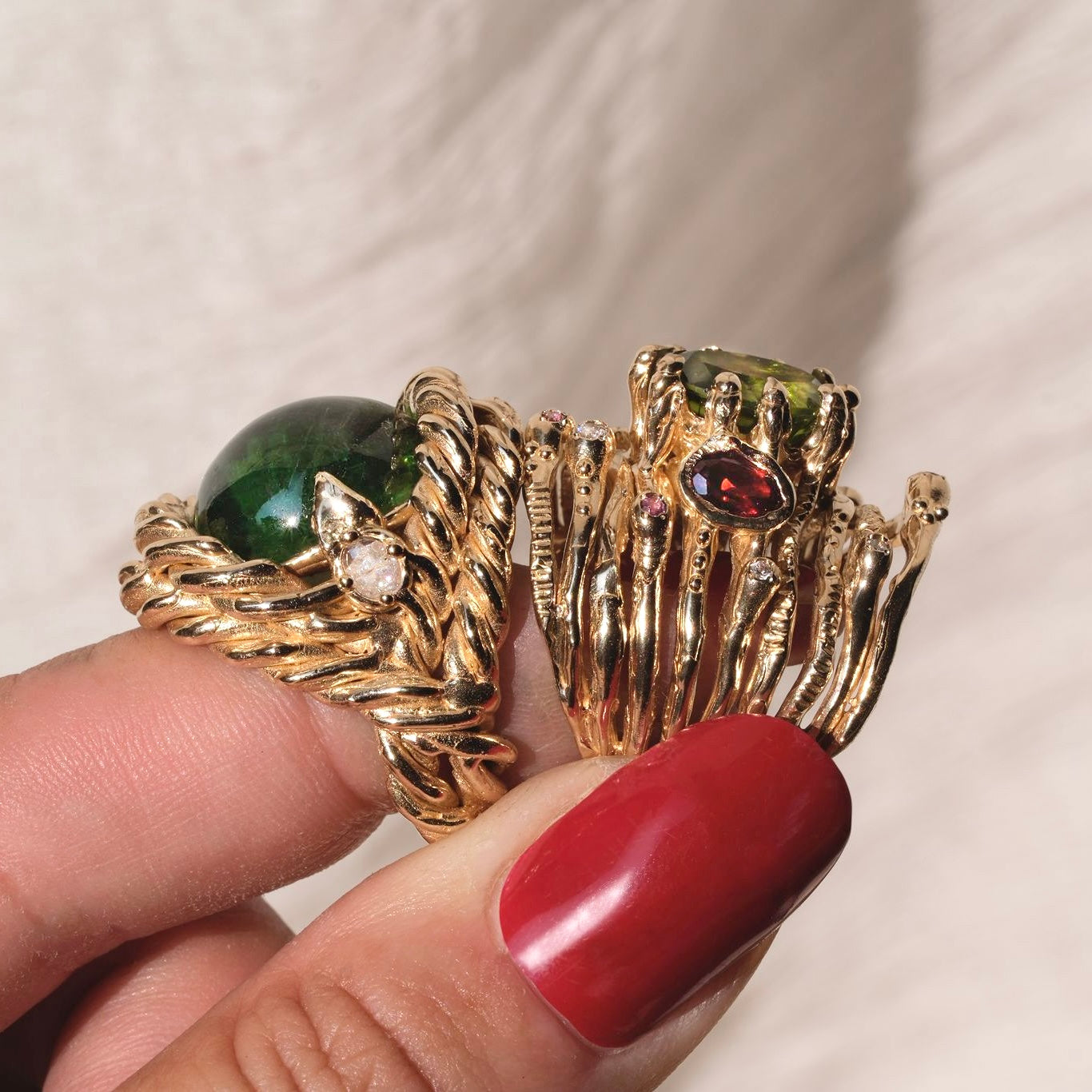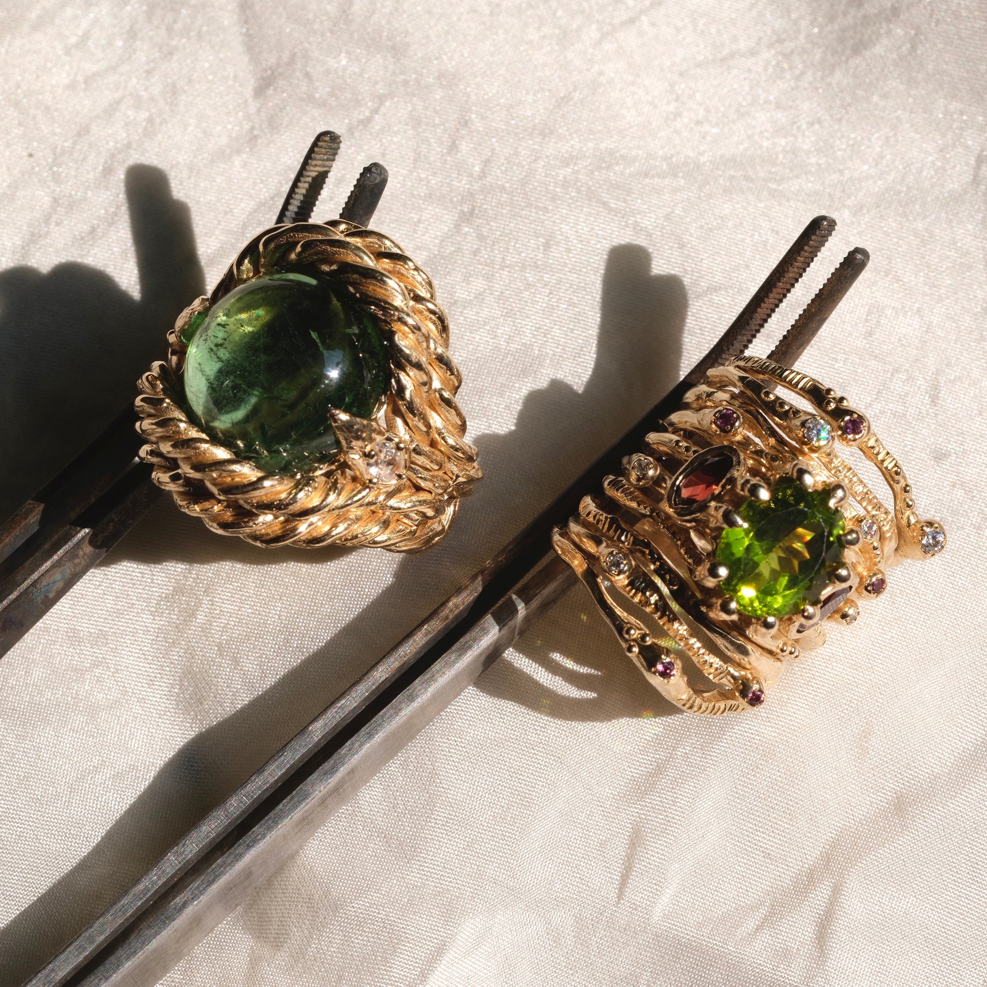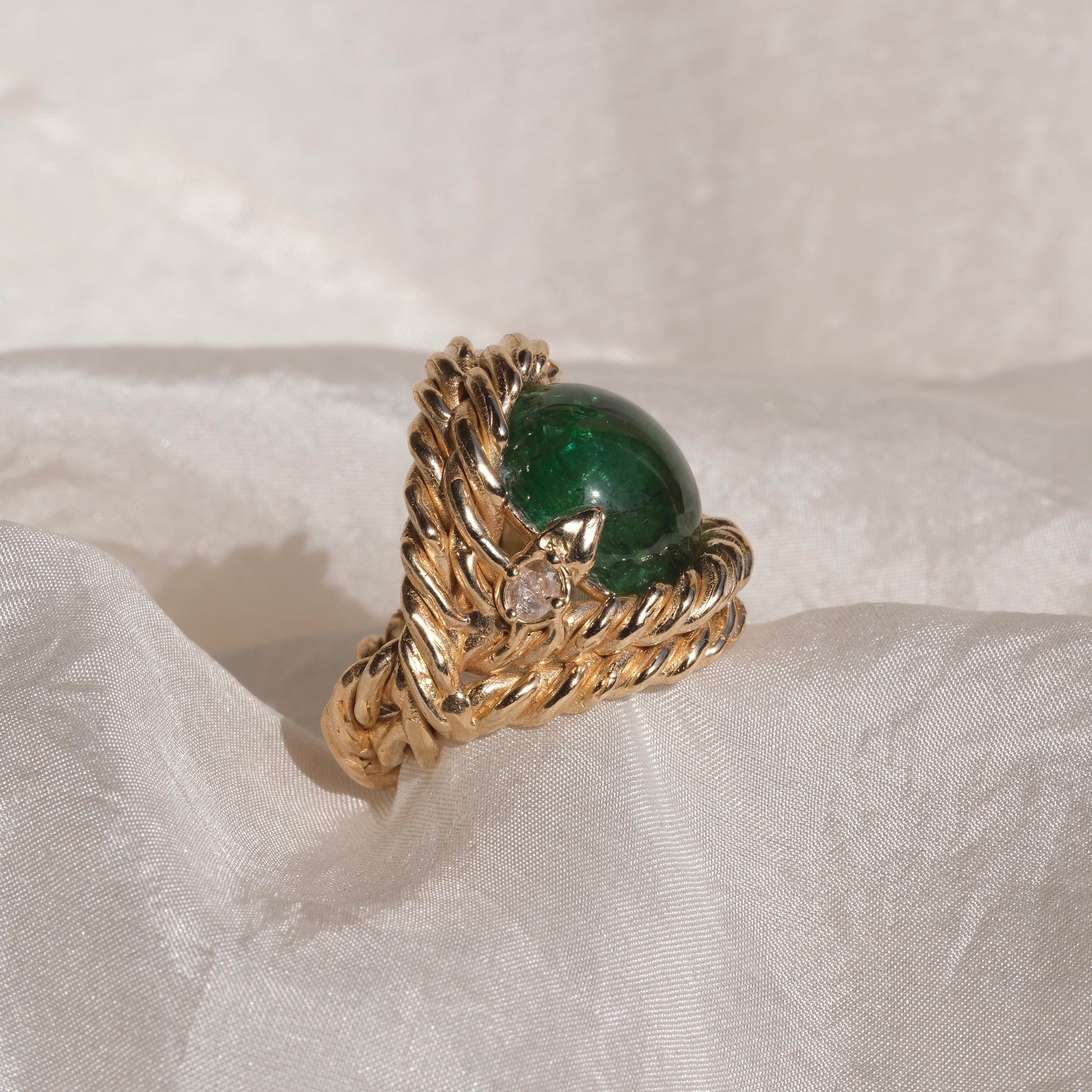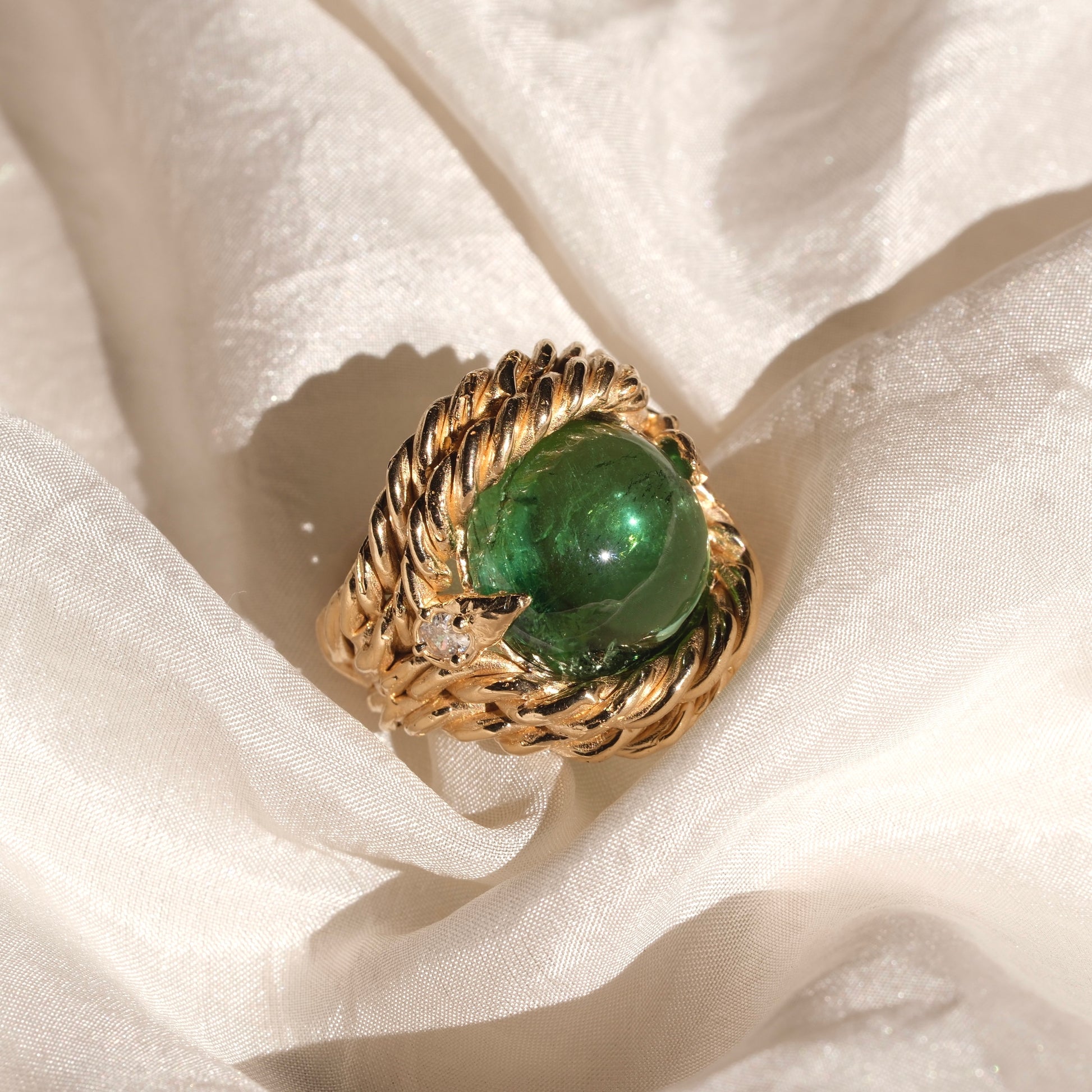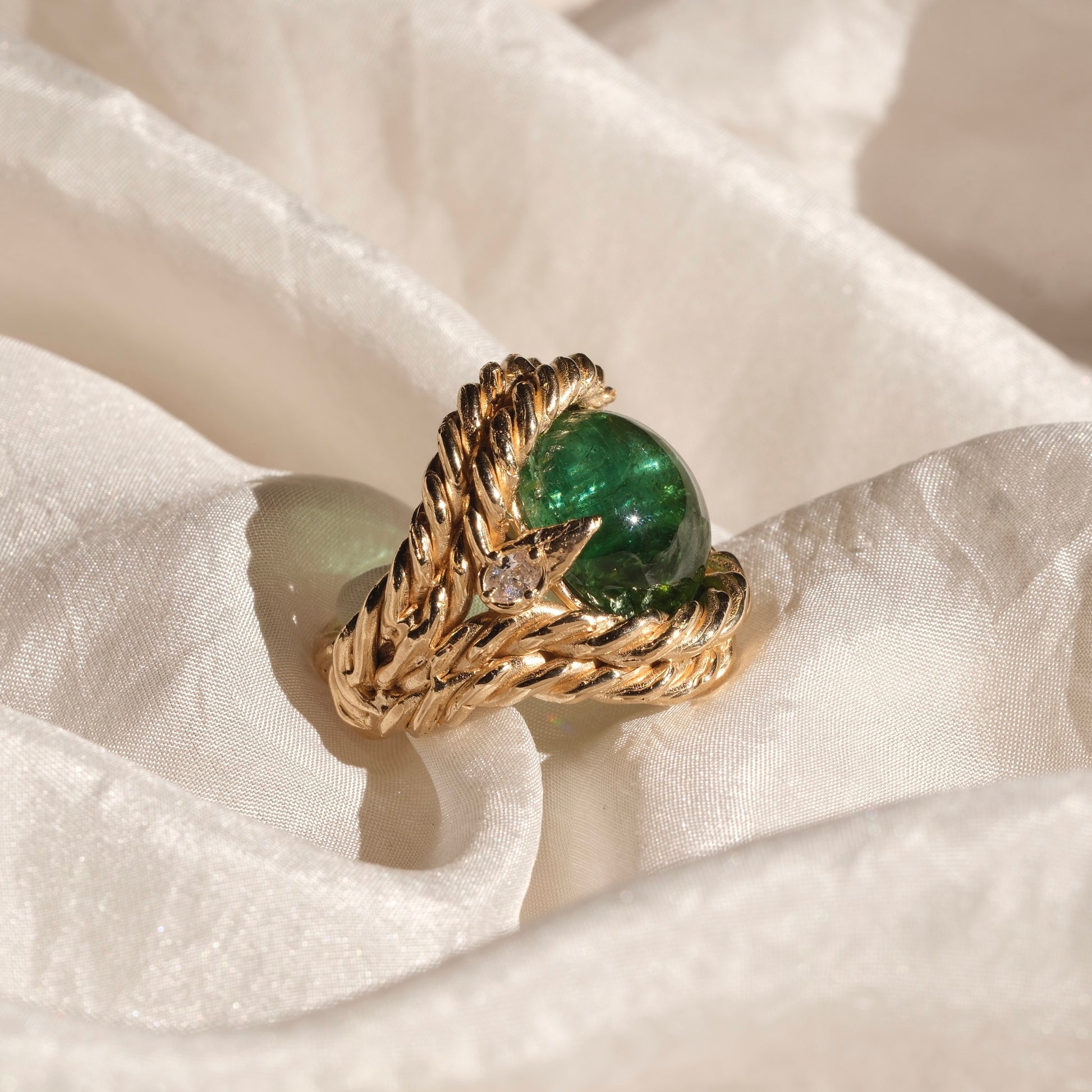 Raffinato anello realizzato in bronzo giallo, impreziosito da una tormalina verde taglio cabochon (16.79ct) e zirconi bianchi taglio a goccia che ne esaltano la lucentezza.