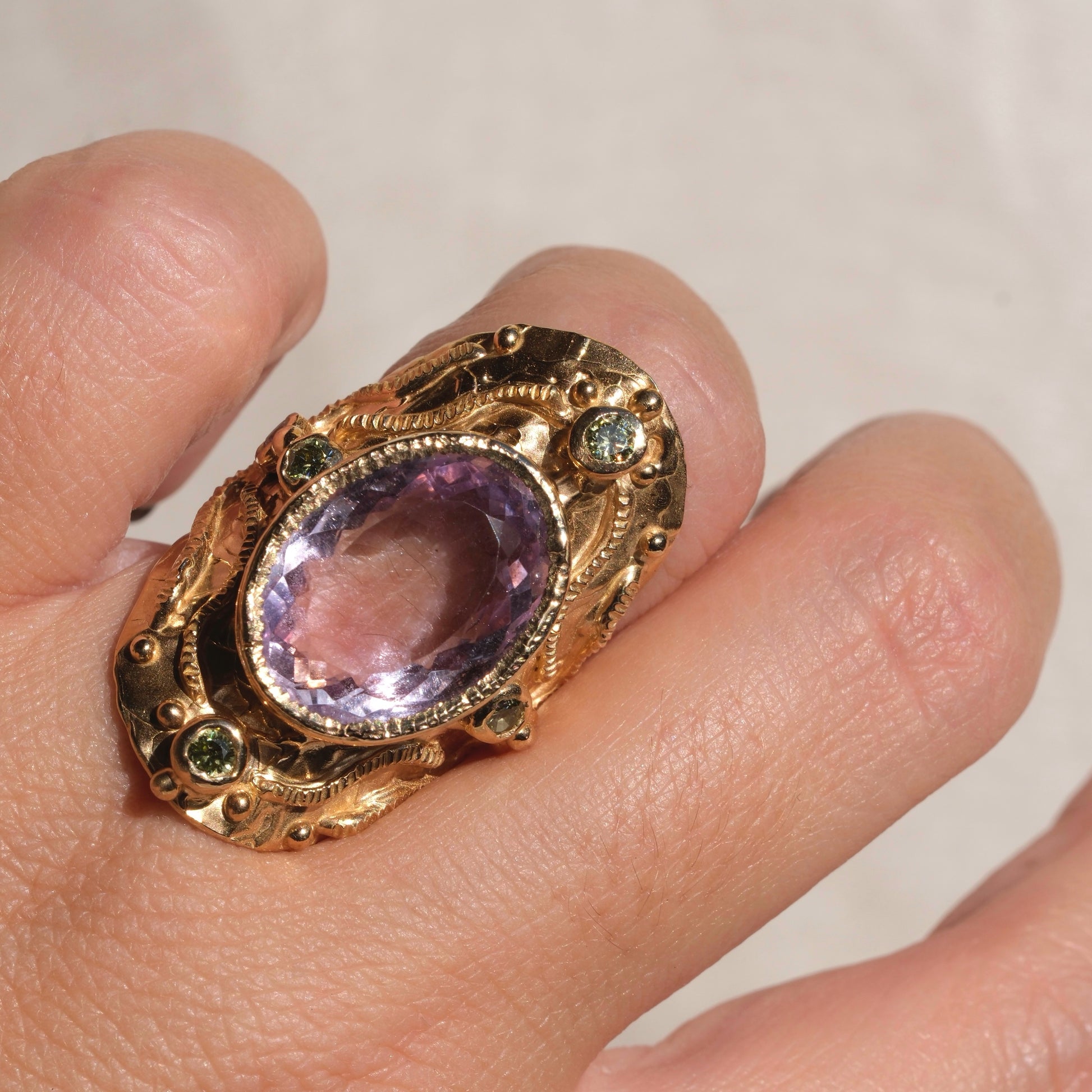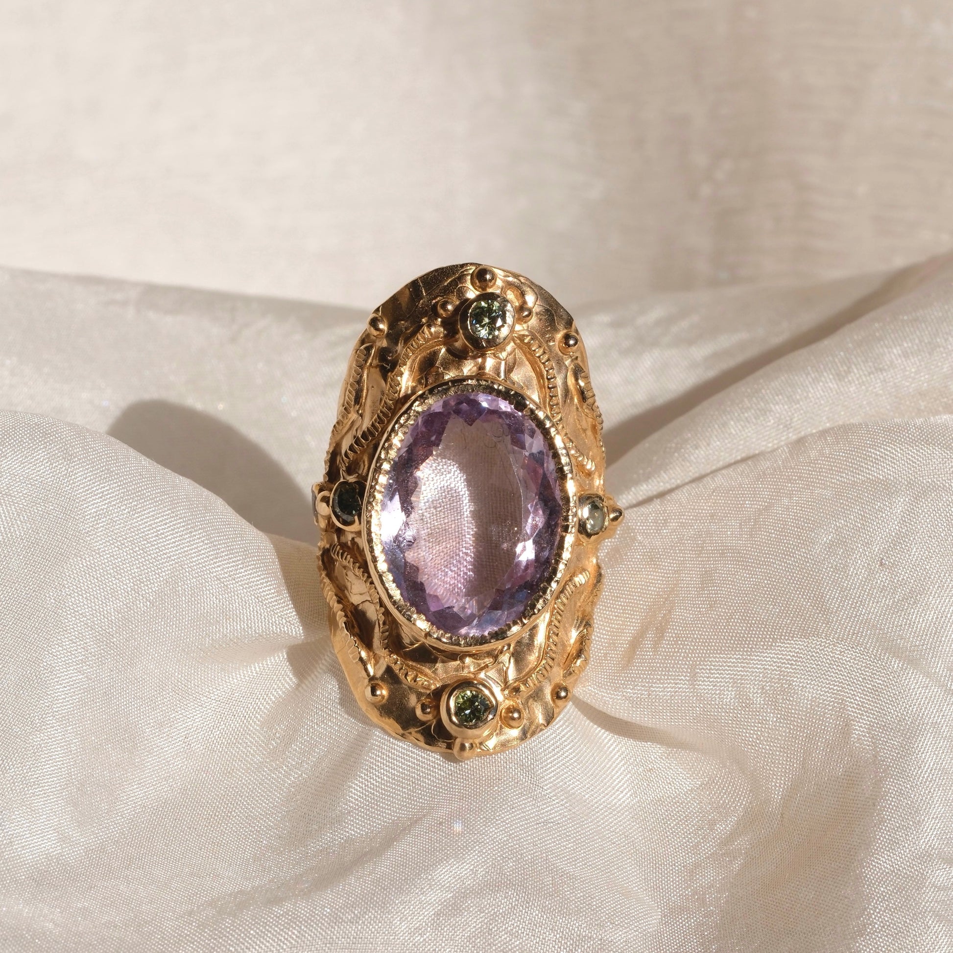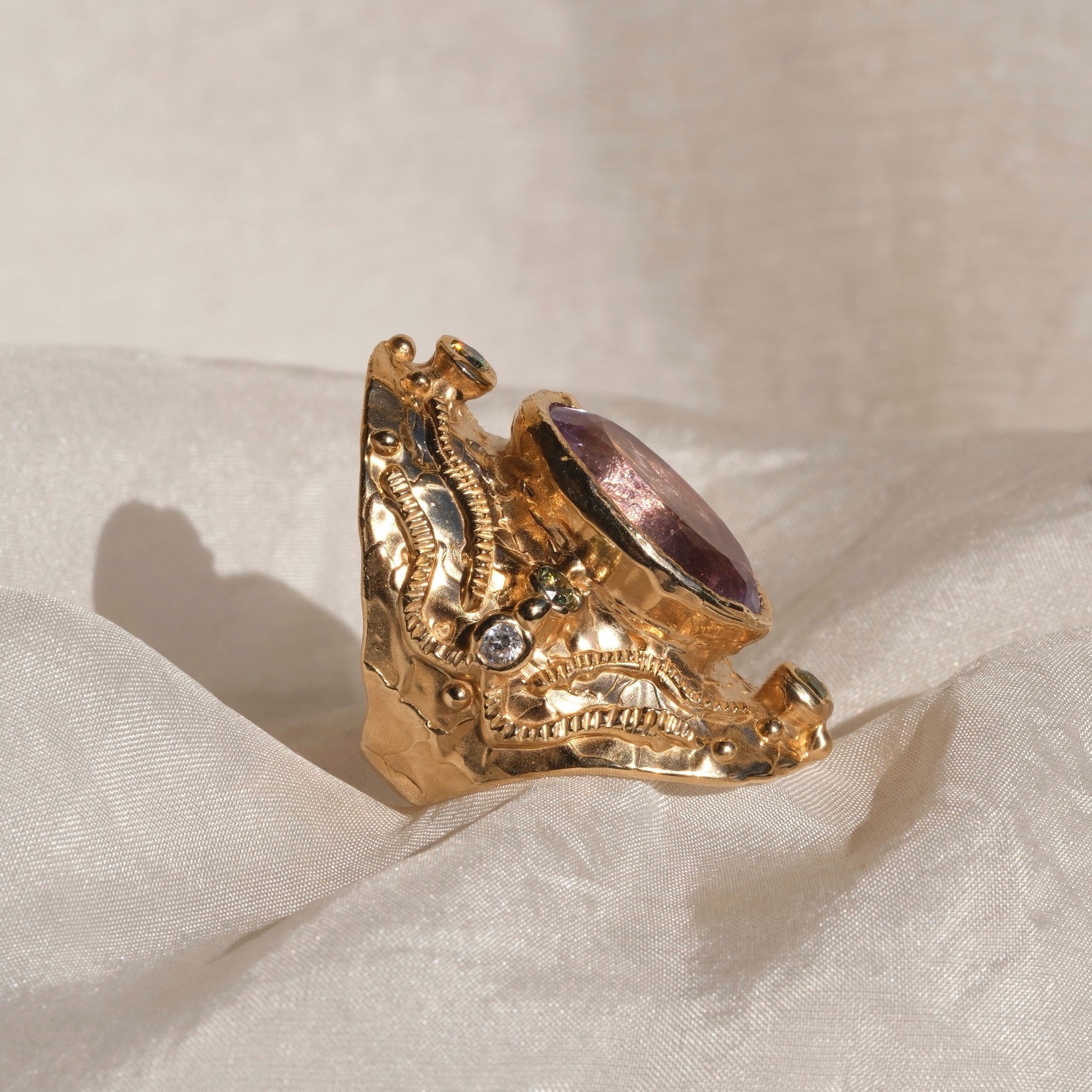 Un gioiello che racchiude equilibrio, luce e colore: questo anello in bronzo giallo è impreziosito da una splendida ametista ovale naturale da 12,76 carati, protagonista assoluta del design.
