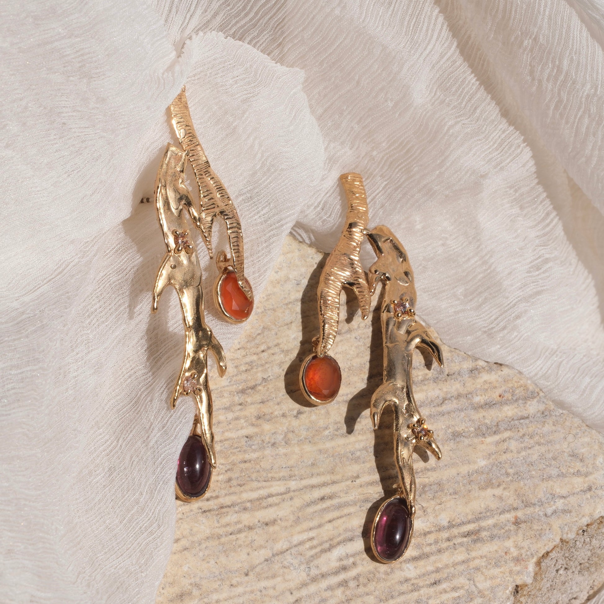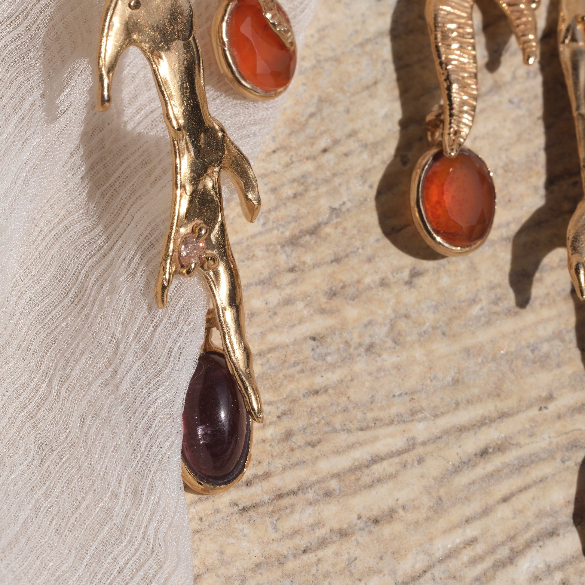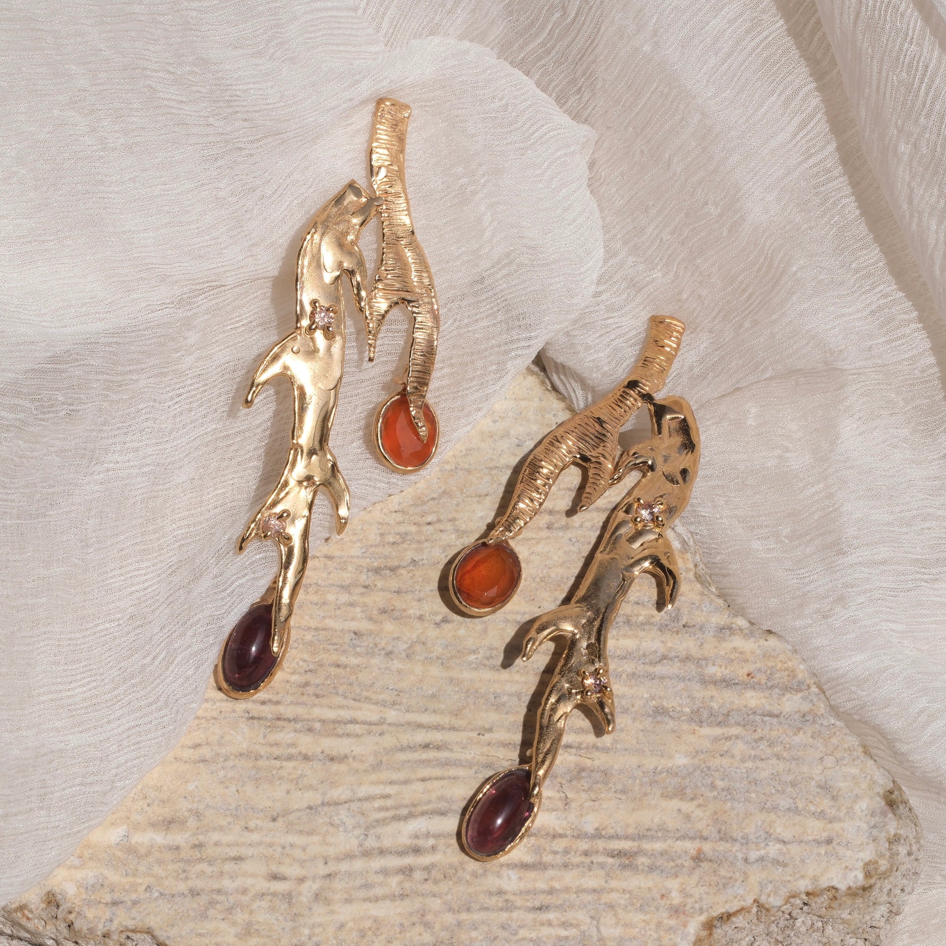 Questi orecchini in bronzo giallo sono impreziositi da tormaline rosa ovali cabochon, delicate e luminose, e da corniole ovali sfaccettate, che aggiungono profondità e calore al design. Zirconi bianchi completano il look, donando brillantezza e un elegante contrasto con le pietre colorate.