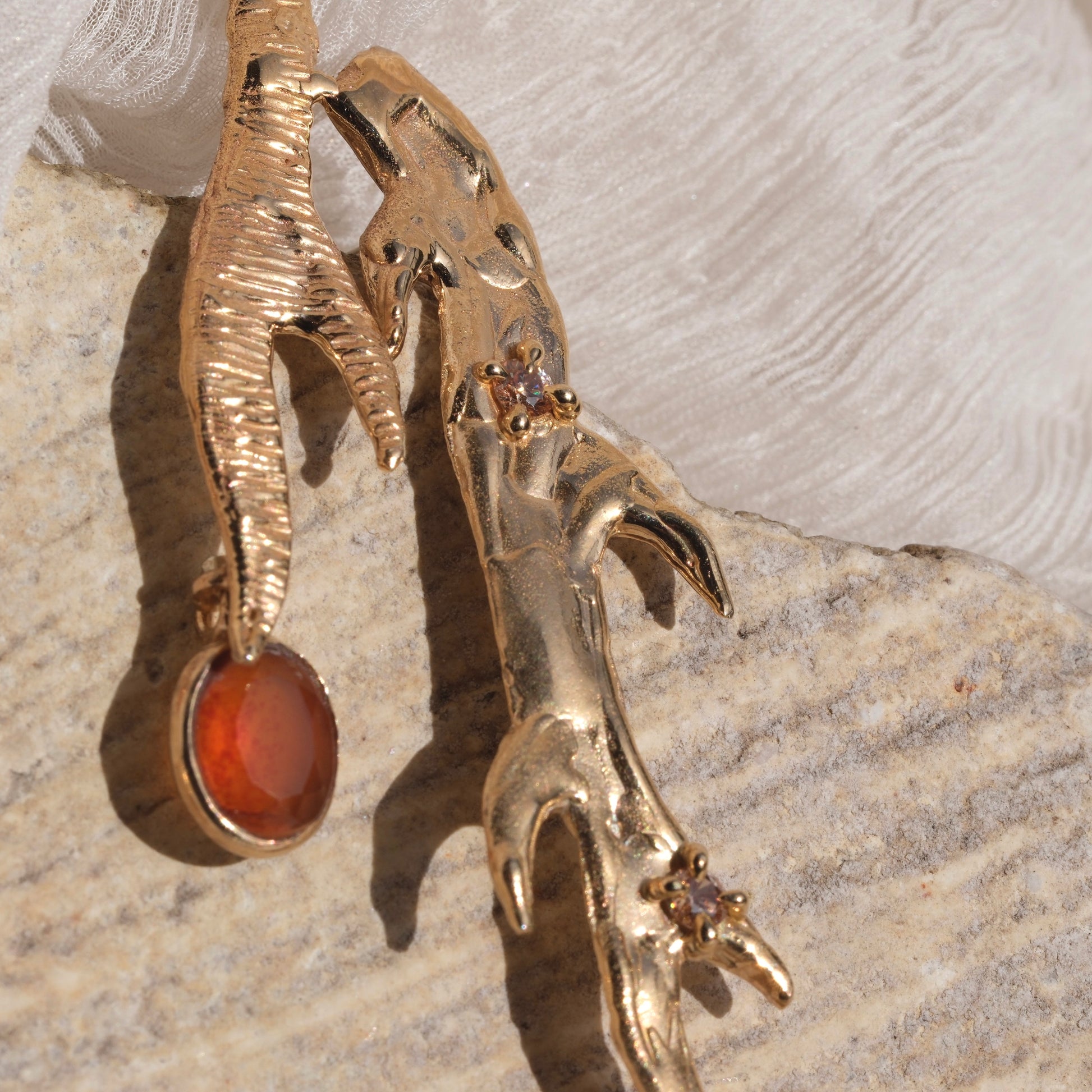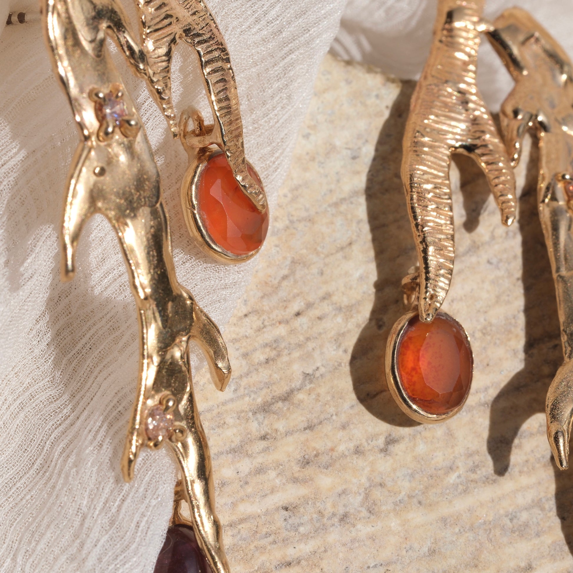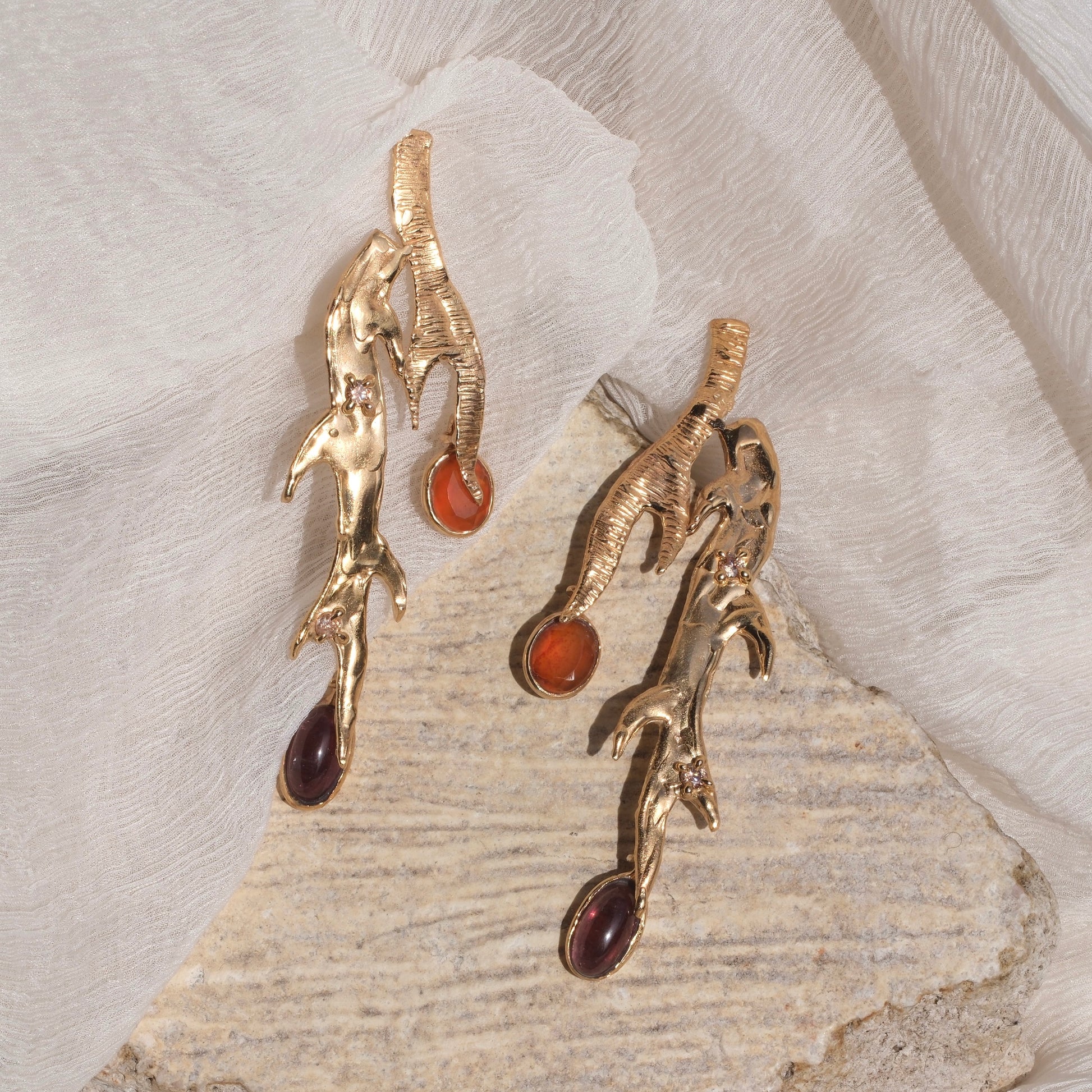 Questi orecchini in bronzo giallo sono impreziositi da tormaline rosa ovali cabochon, delicate e luminose, e da corniole ovali sfaccettate, che aggiungono profondità e calore al design. Zirconi bianchi completano il look, donando brillantezza e un elegante contrasto con le pietre colorate.