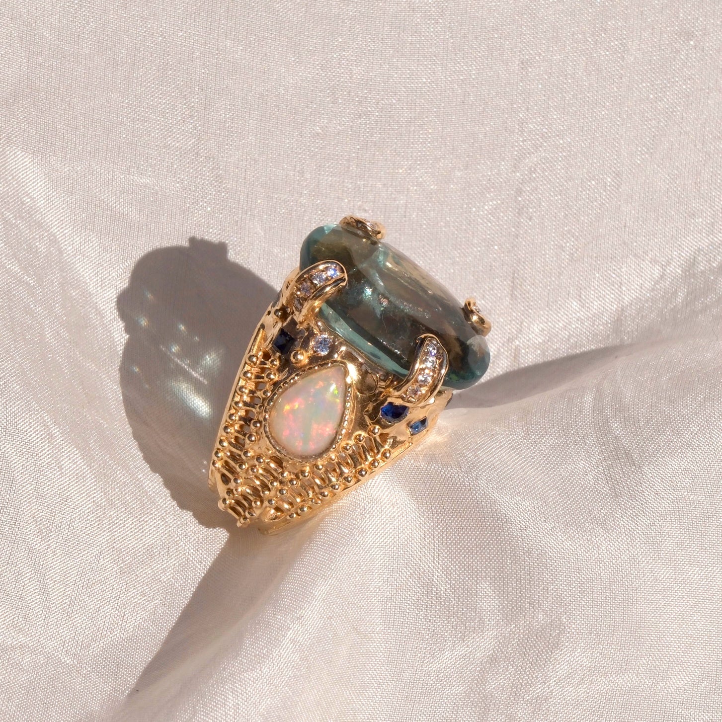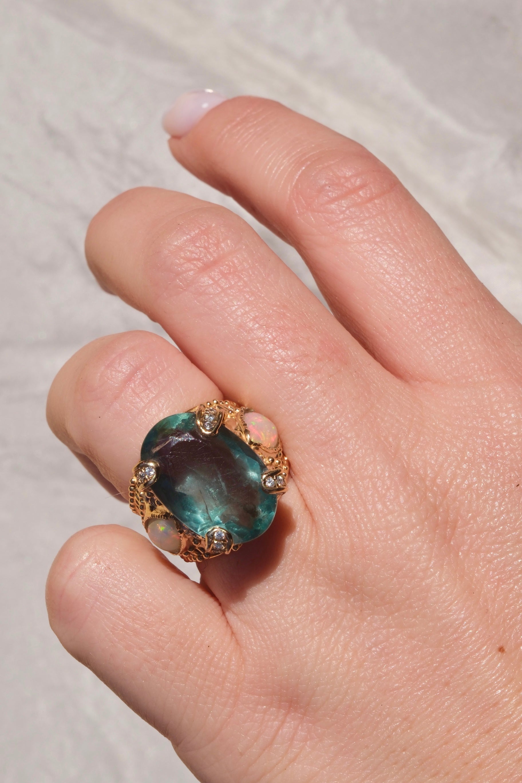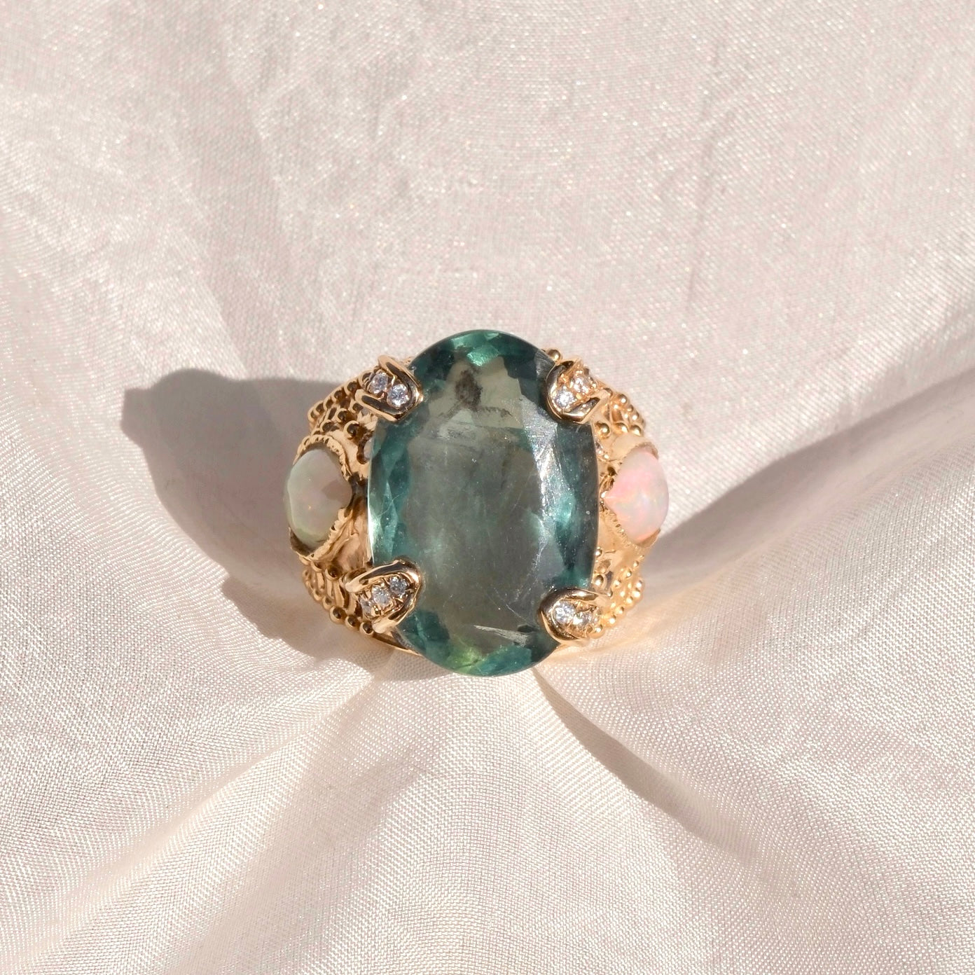 Anello in bronzo giallo dal design sofisticato e ricercato, con al centro una fluorite ovale dalla trasparenza vibrante e dai delicati giochi di colore. Ai lati della pietra centrale sono incastonati opali australiani a goccia, che aggiungono riflessi iridescenti e una luminosità unica, conferendo profondità e carattere all’insieme.