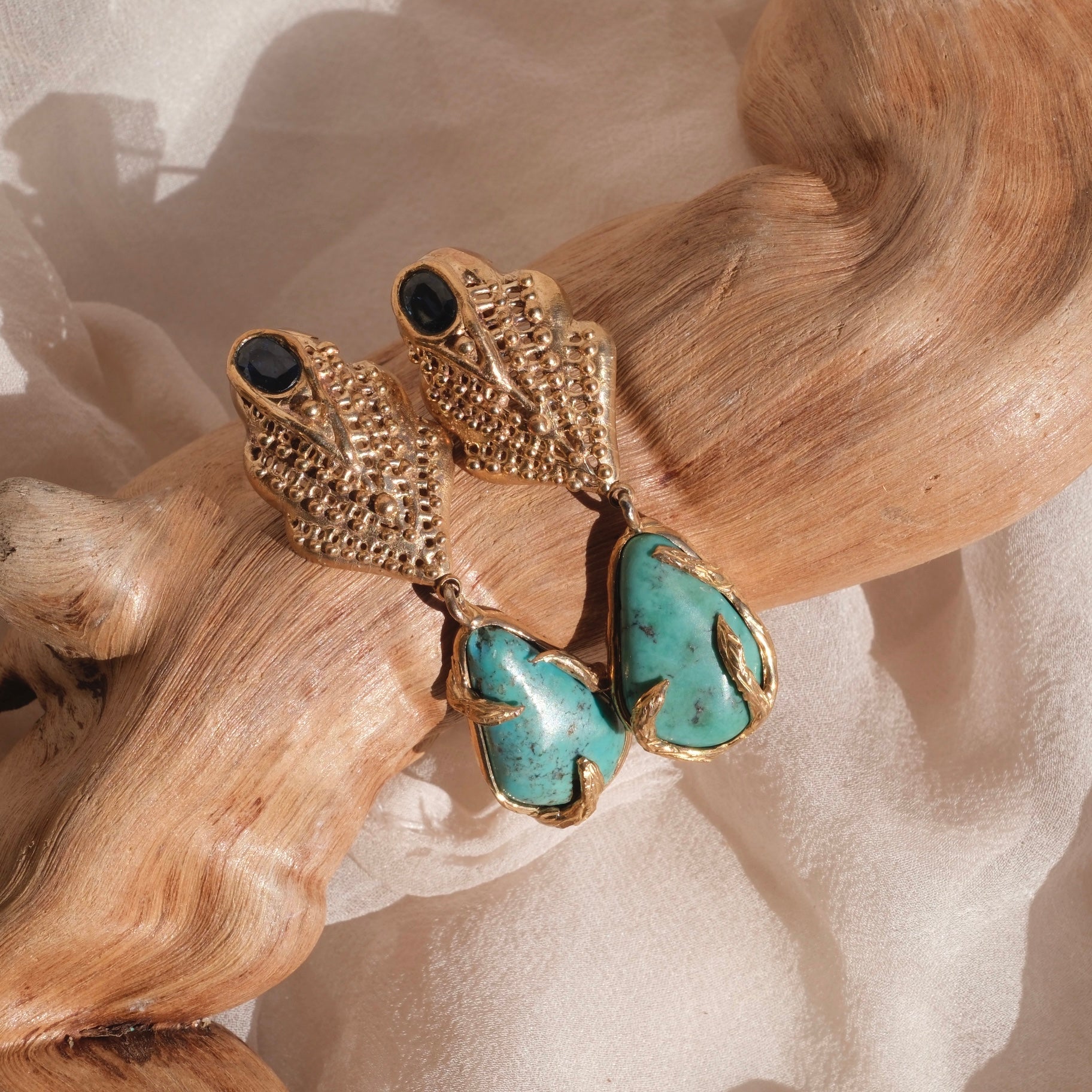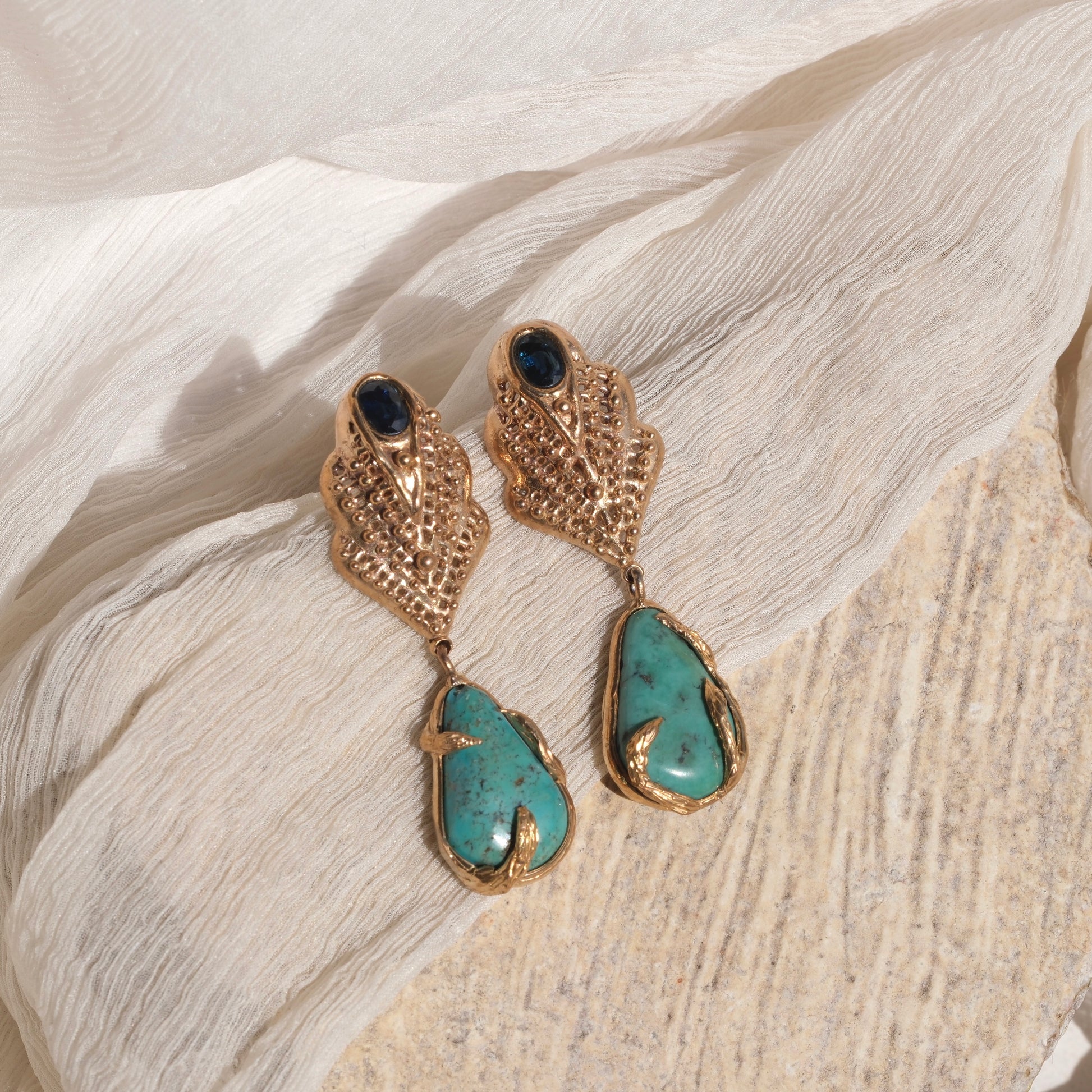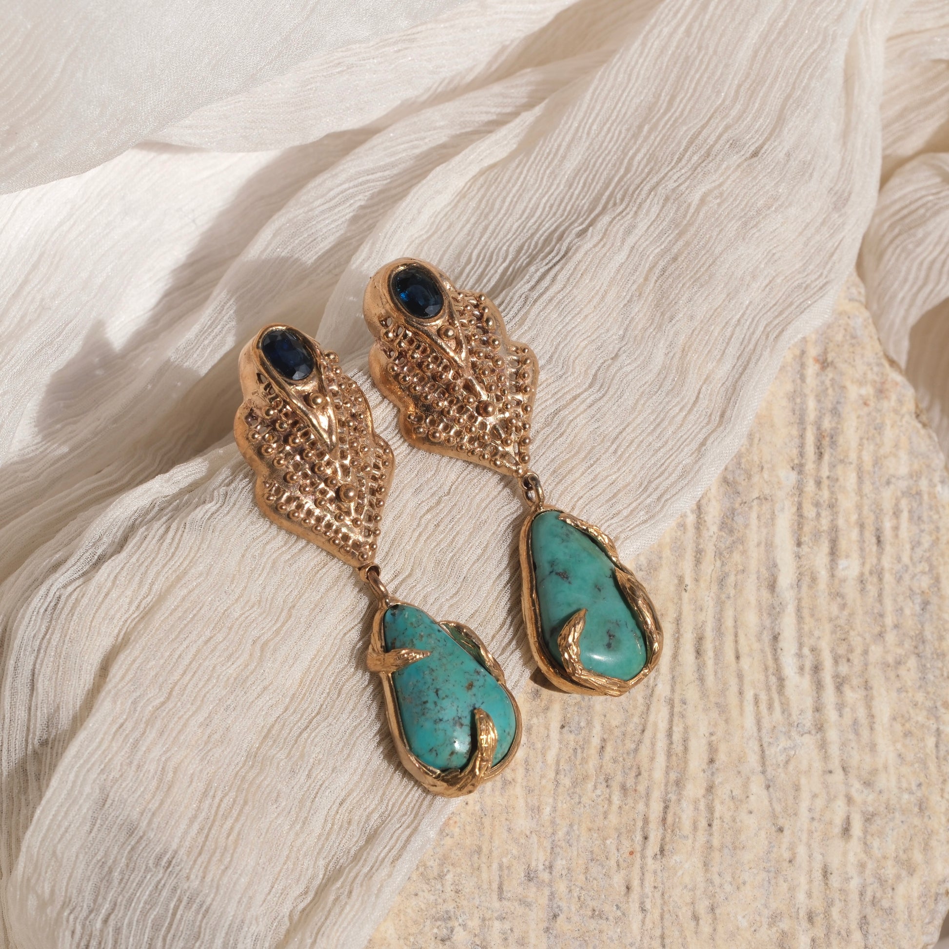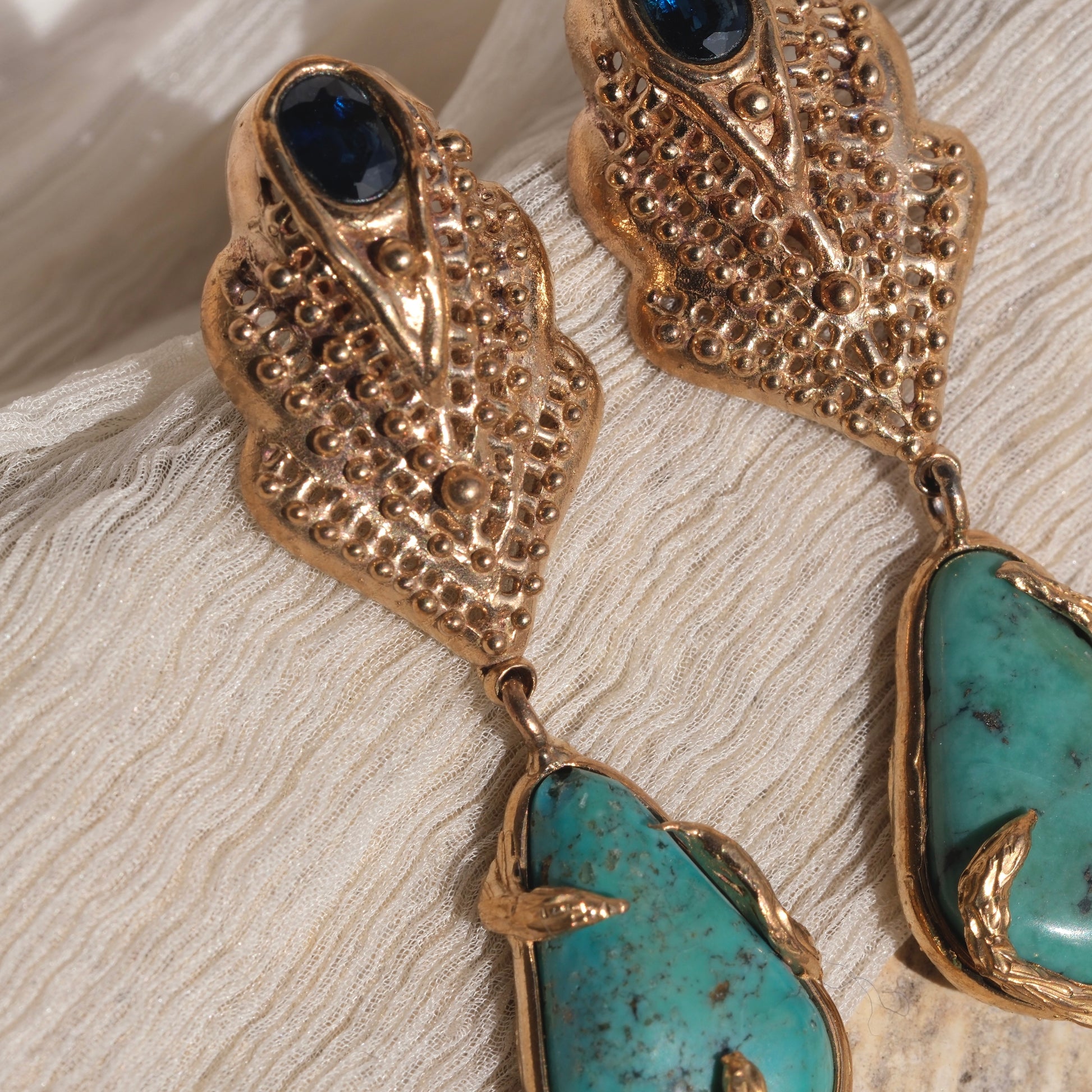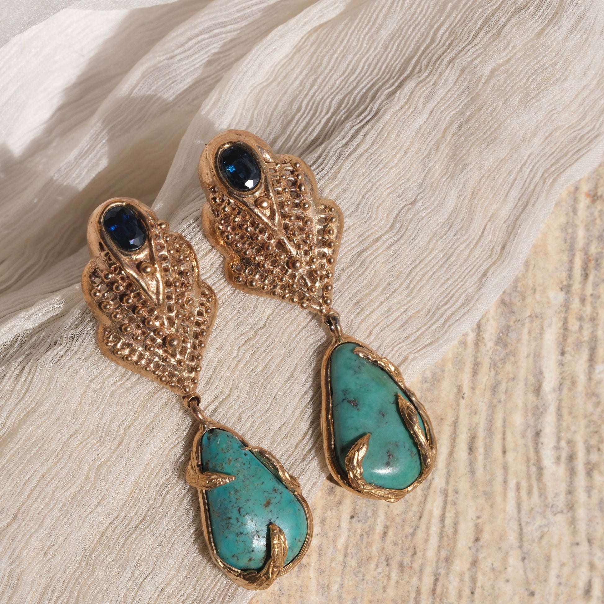 A completare il design, pendenti in pasta di turchese a goccia aggiungono un tocco di freschezza e luminosità, creando un armonioso contrasto con le tonalità calde del bronzo.
