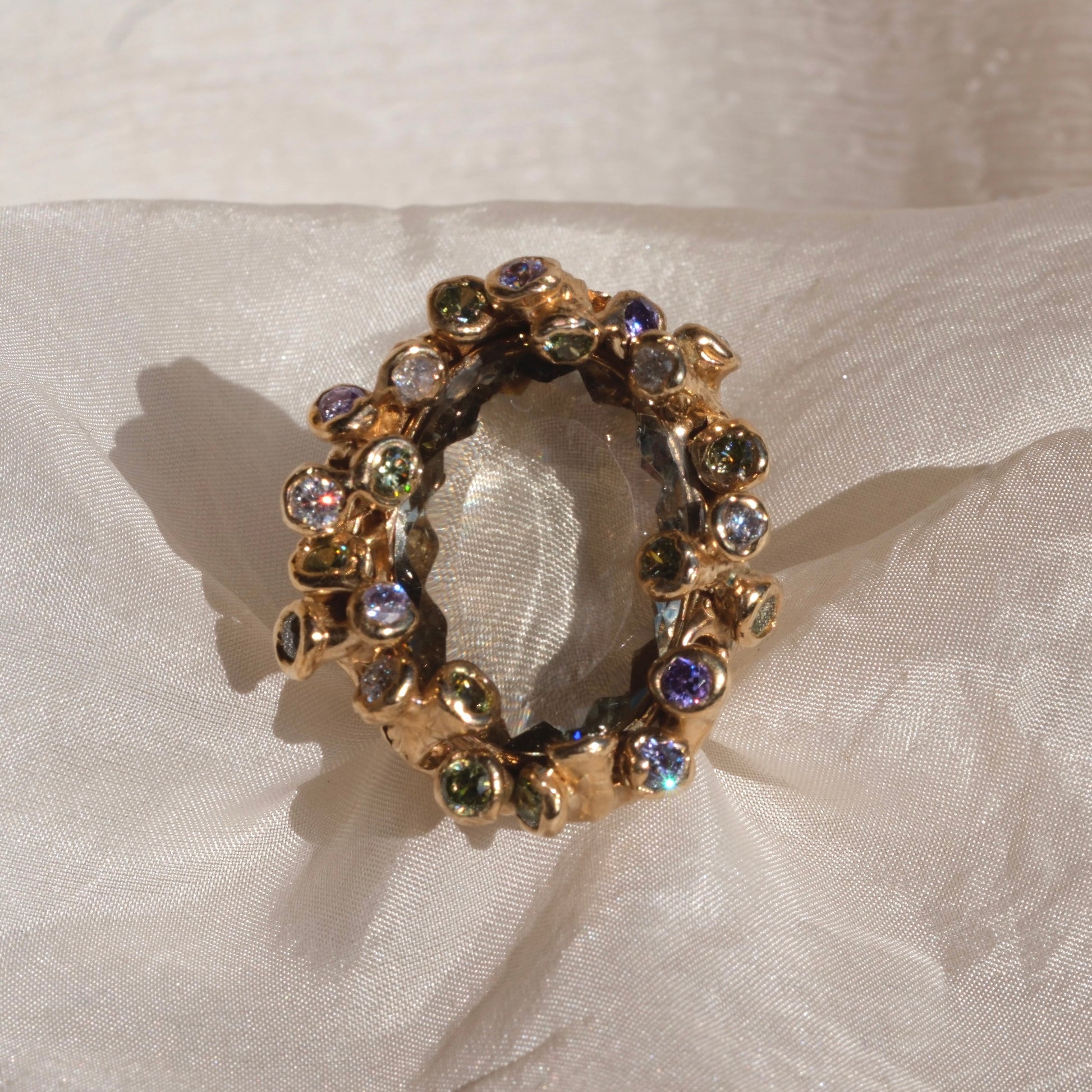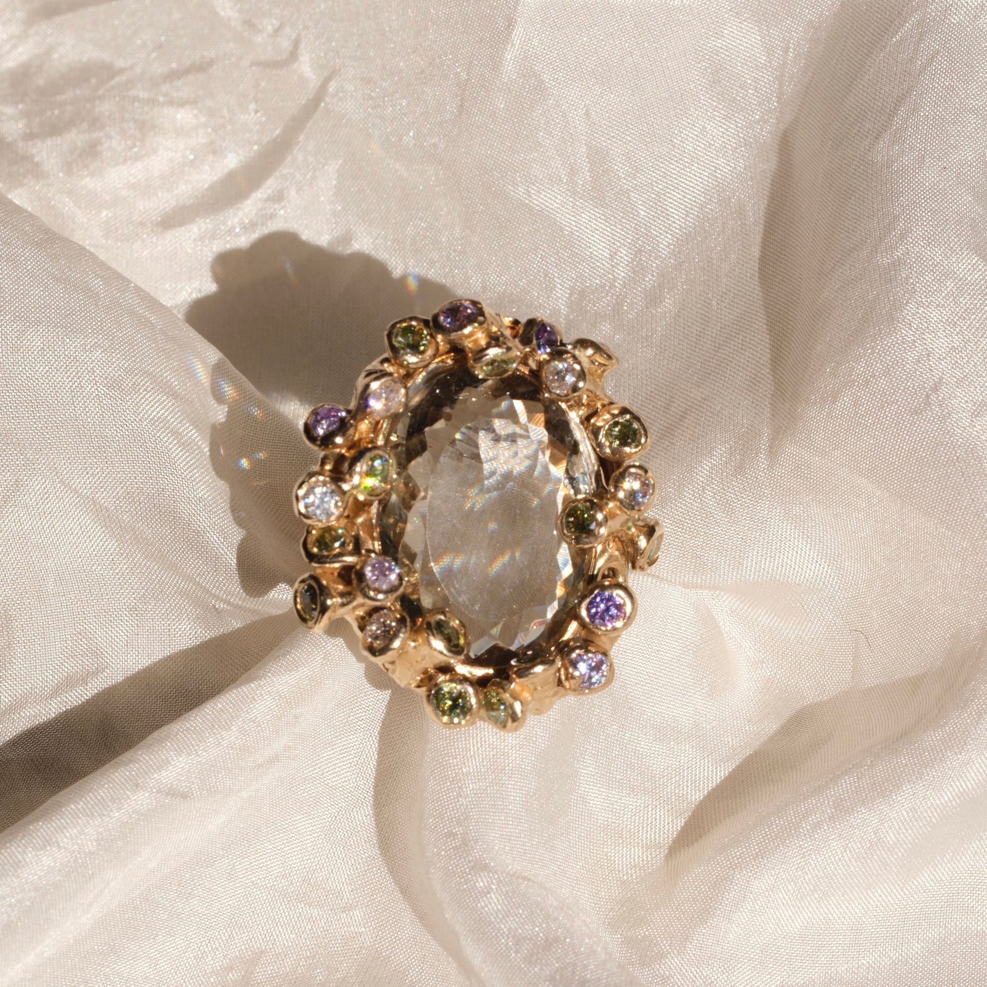 Un raffinato anello con prasiolite ovale centrale, circondata da zirconi viola, bianchi e verdi che ne esaltano la lucentezza naturale.