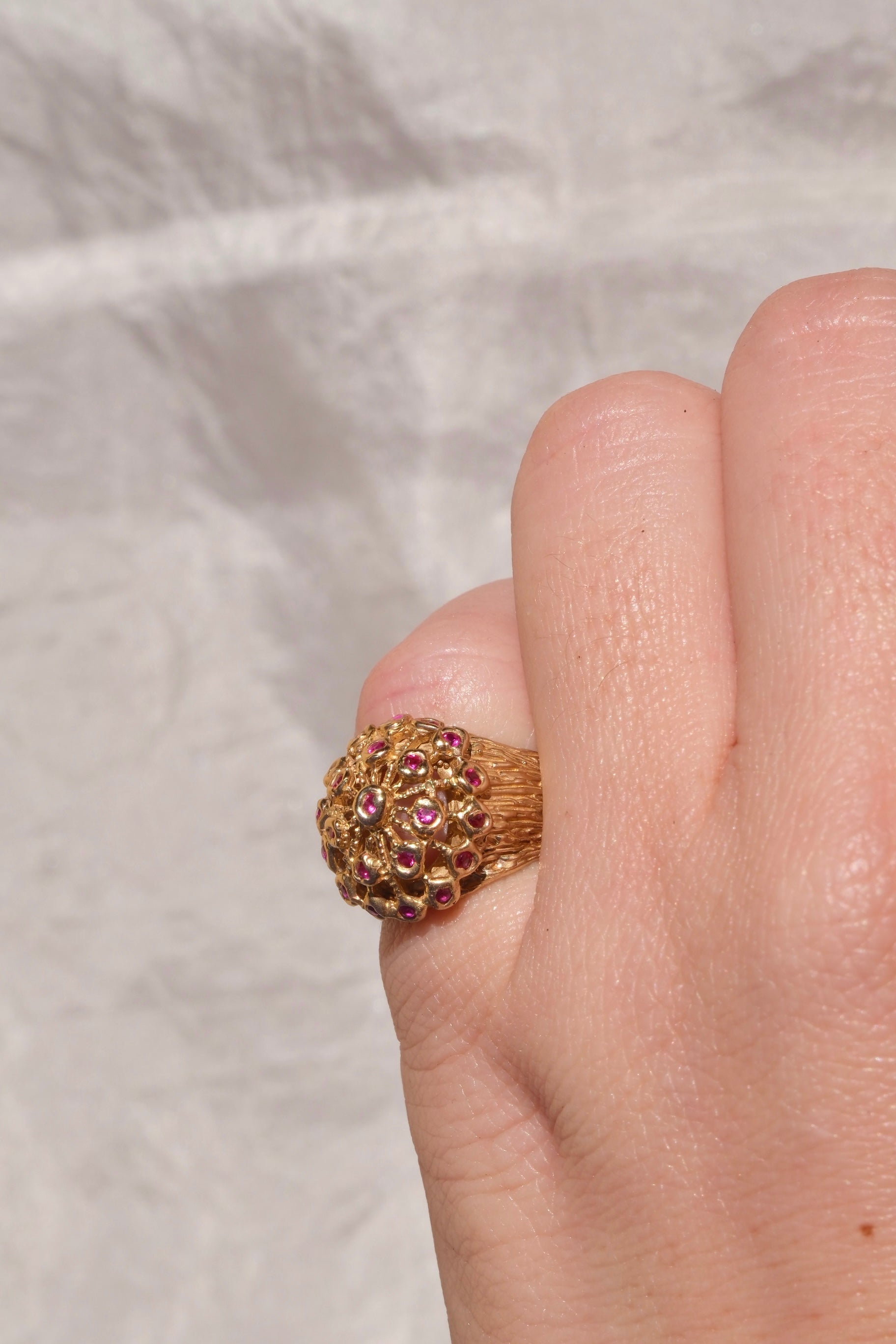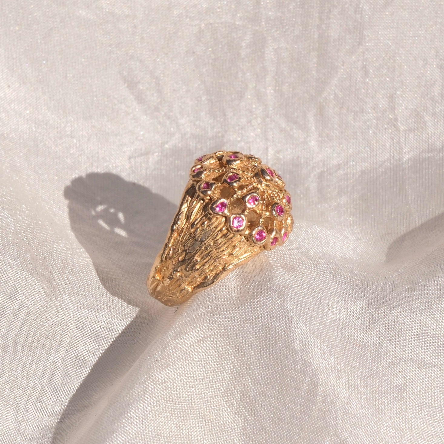 Anello a cupola in bronzo giallo dal design audace e raffinato, impreziosito da rubini sintetici incastonati lungo la superficie arrotondata della cupola. La forma bombata crea un elegante gioco di luce, valorizzando la brillantezza e il colore intenso dei rubini, che spiccano sul caldo riflesso dorato del bronzo.