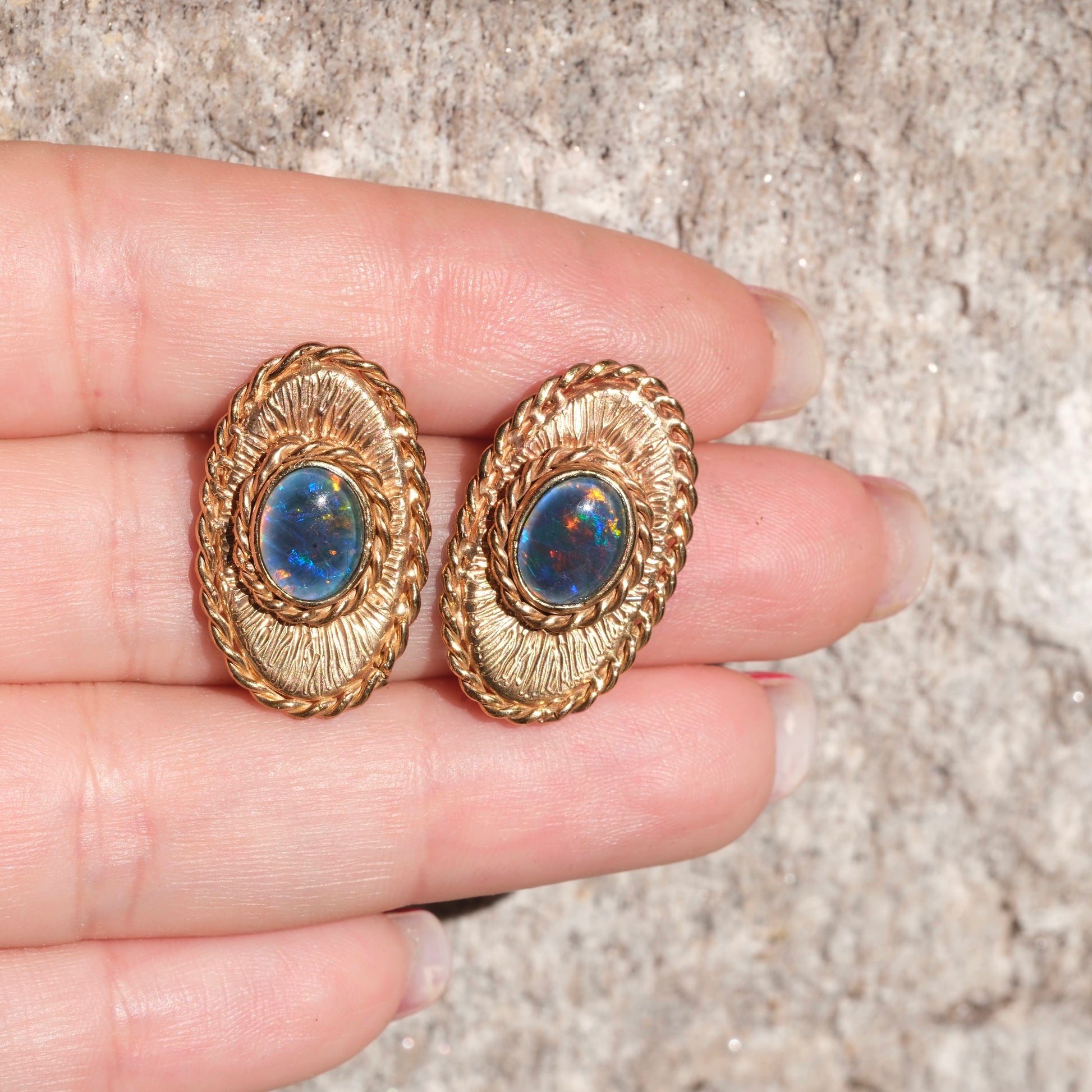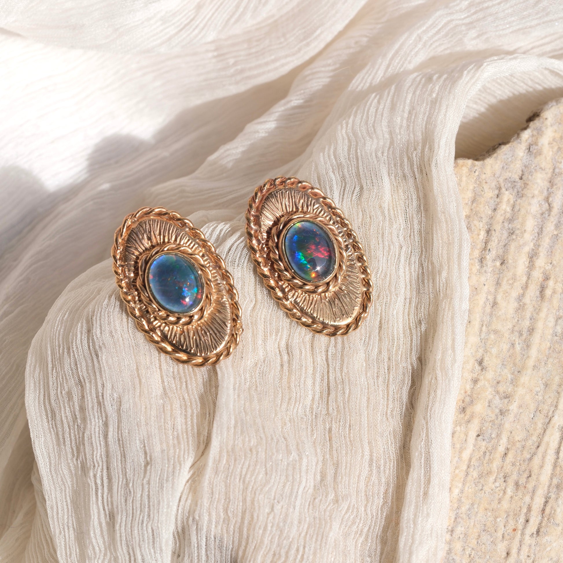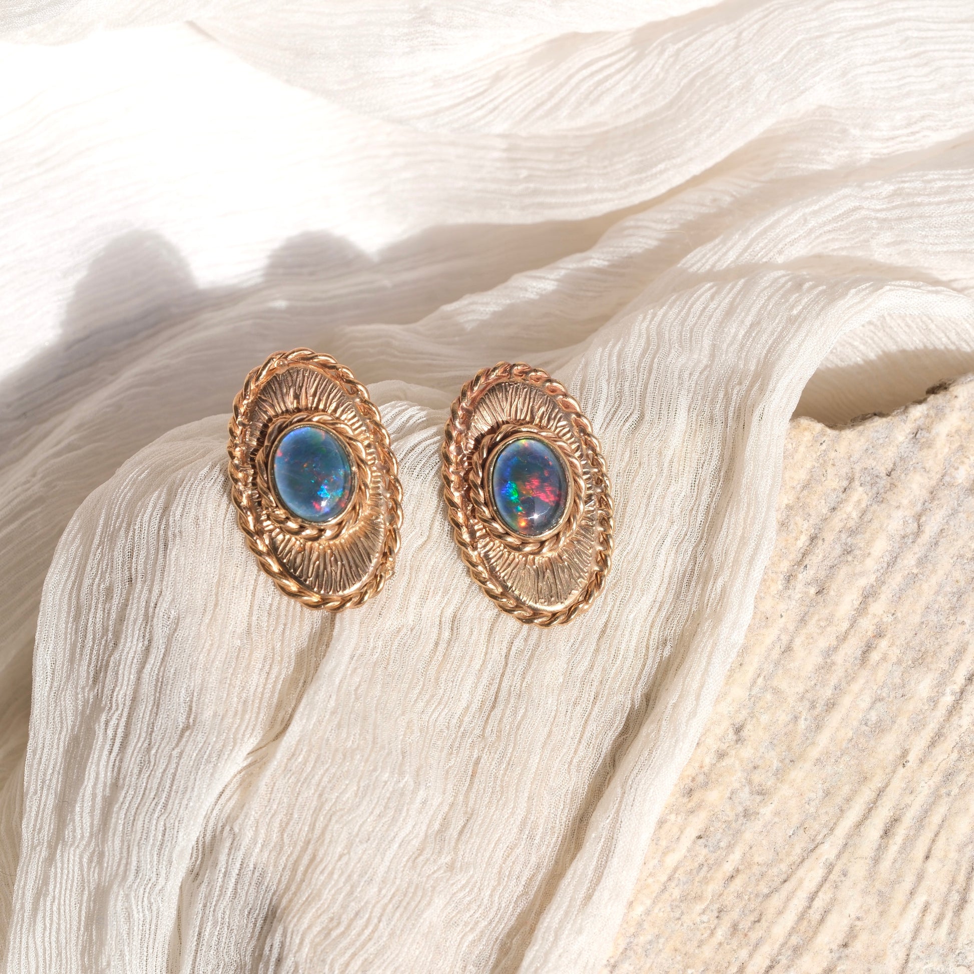 Raffinati e luminosi, questi orecchini a lobo in bronzo giallo esprimono eleganza senza tempo. Ogni orecchino è impreziosito da una doppietta di opale, pietra affascinante nota per i suoi riflessi cangianti che sprigionano bagliori di luce in ogni movimento.