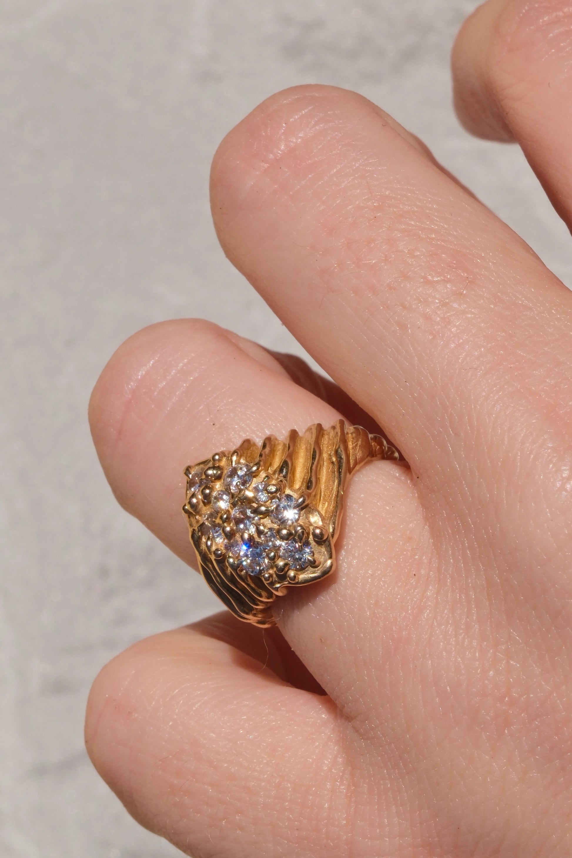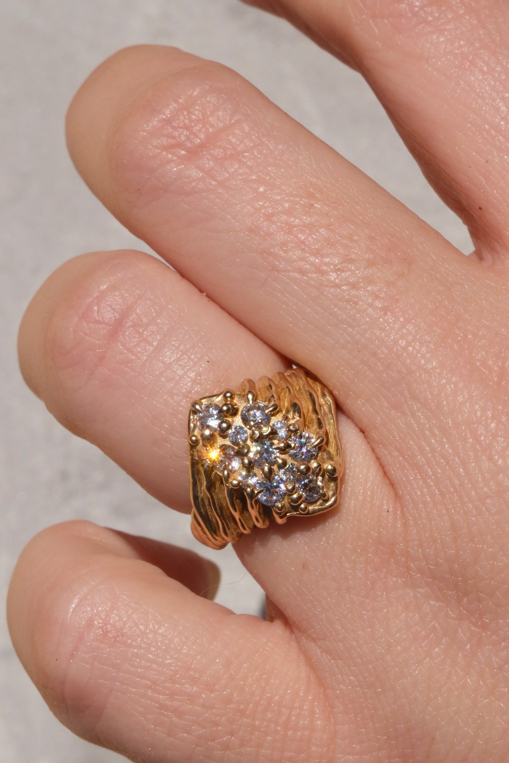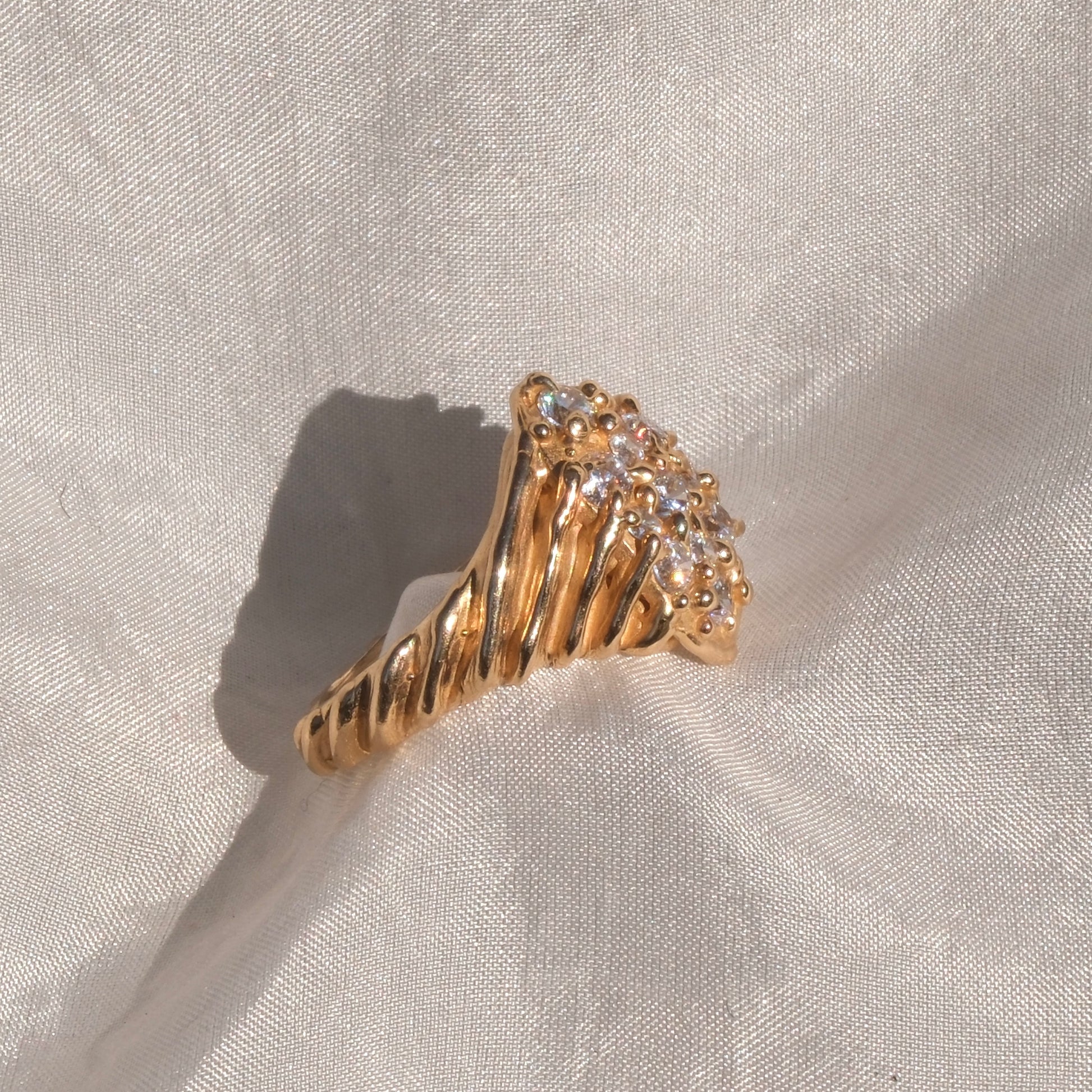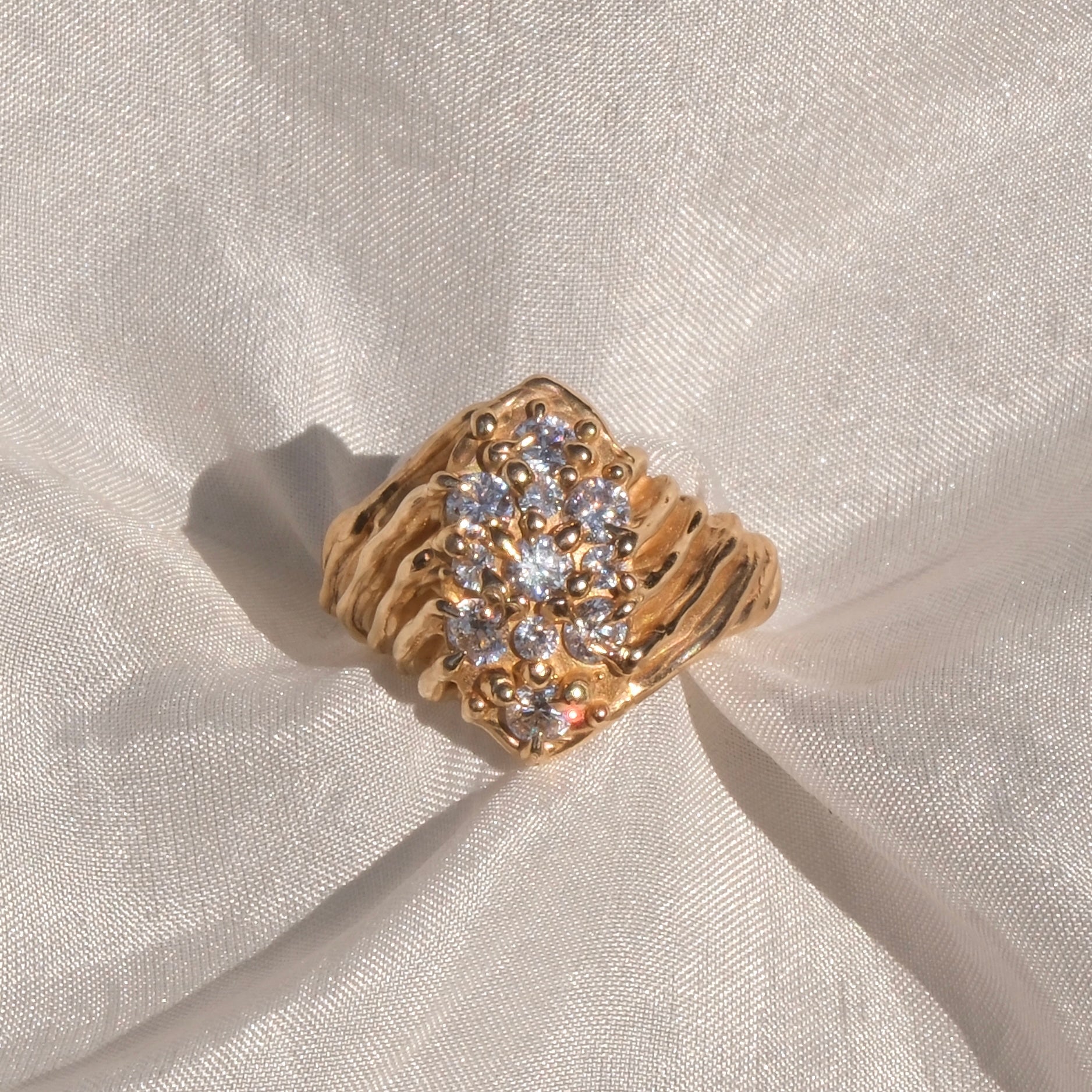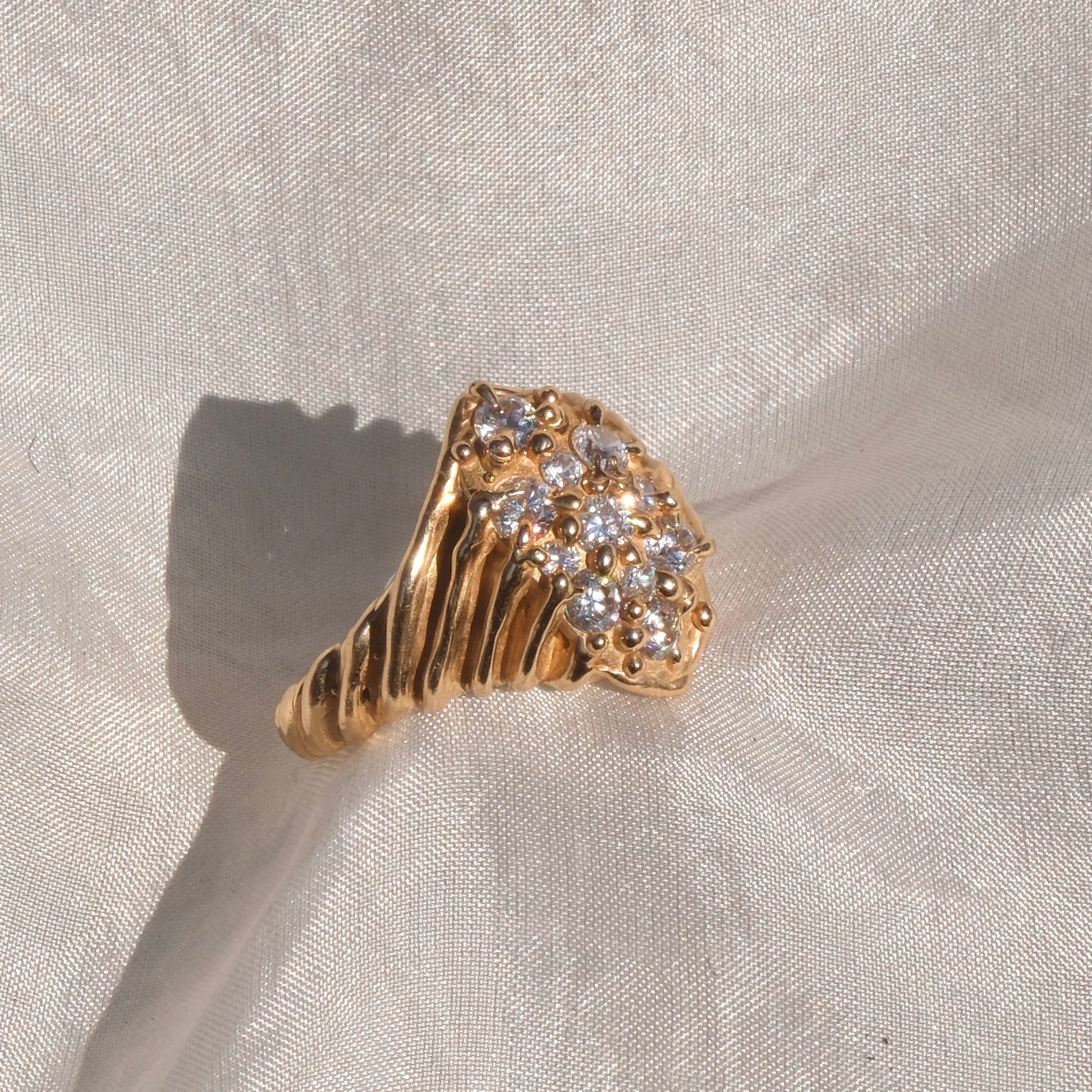 Anello in bronzo giallo dal design luminoso e raffinato, caratterizzato da un pavé di zirconia bianche che ricopre la superficie della montatura, creando un elegante gioco di luce e brillantezza. La disposizione delle pietre garantisce continuità e armonia, valorizzando il caldo tono dorato del bronzo e conferendo al gioiello un aspetto sofisticato e prezioso.