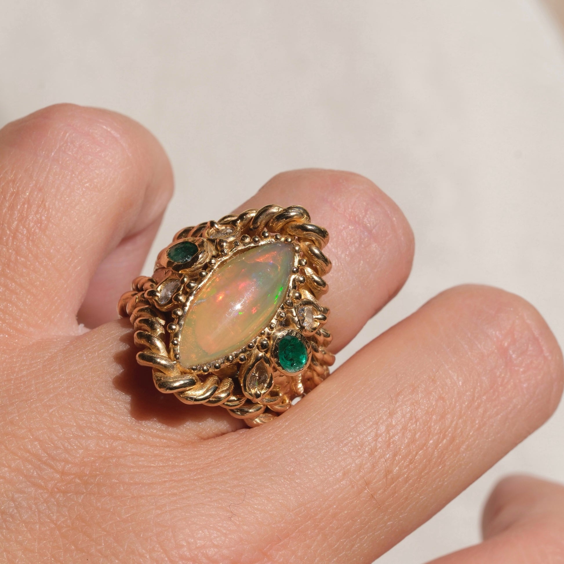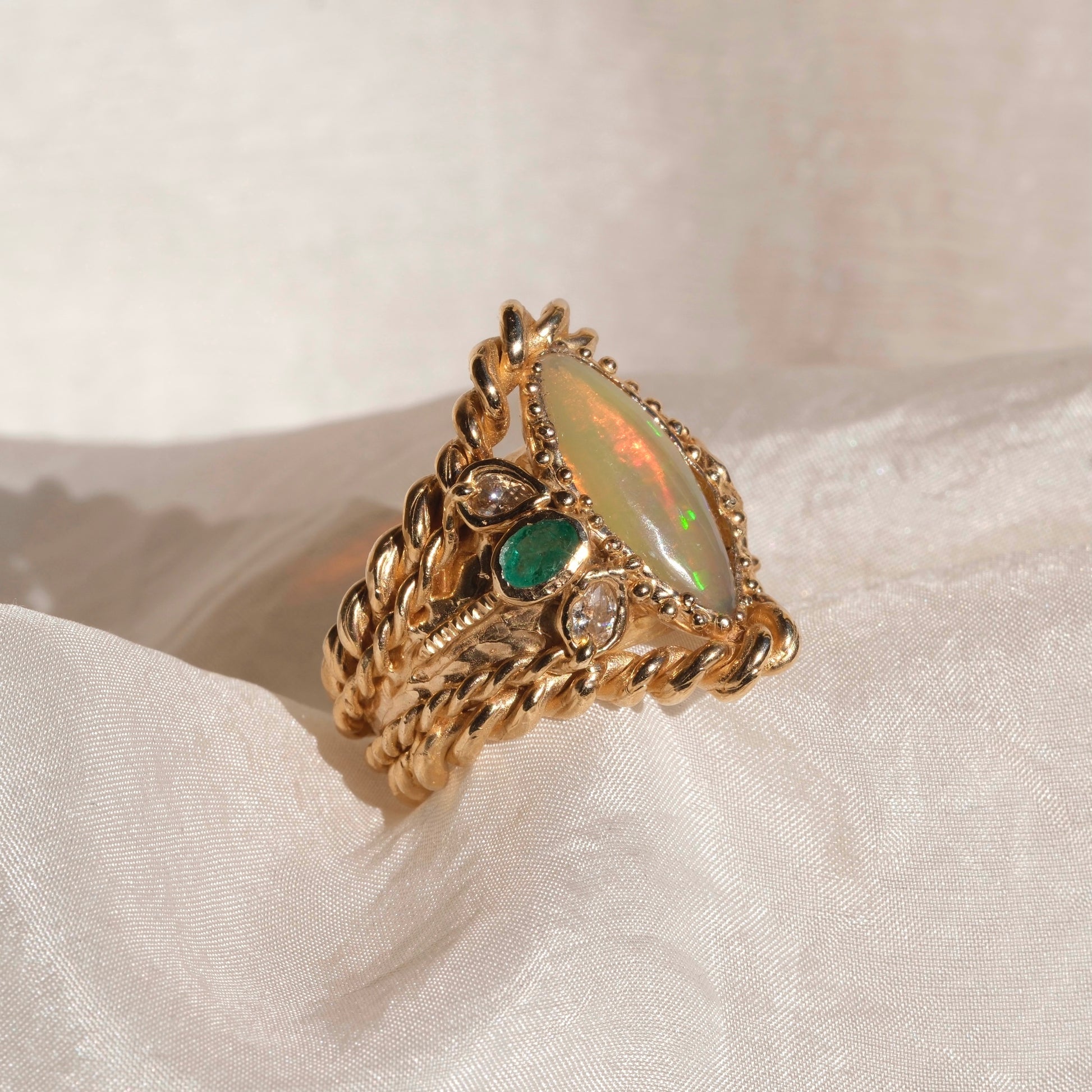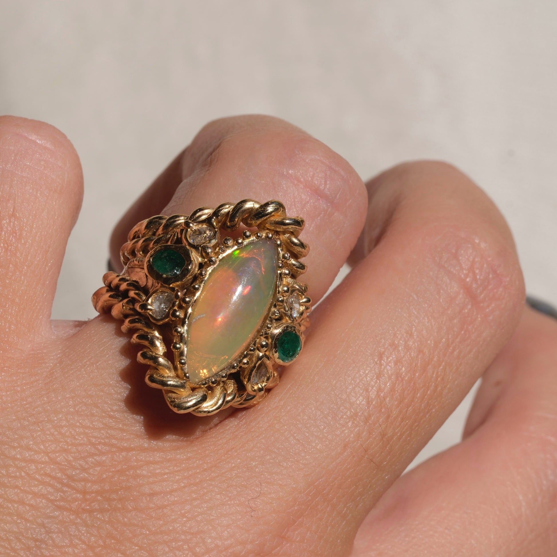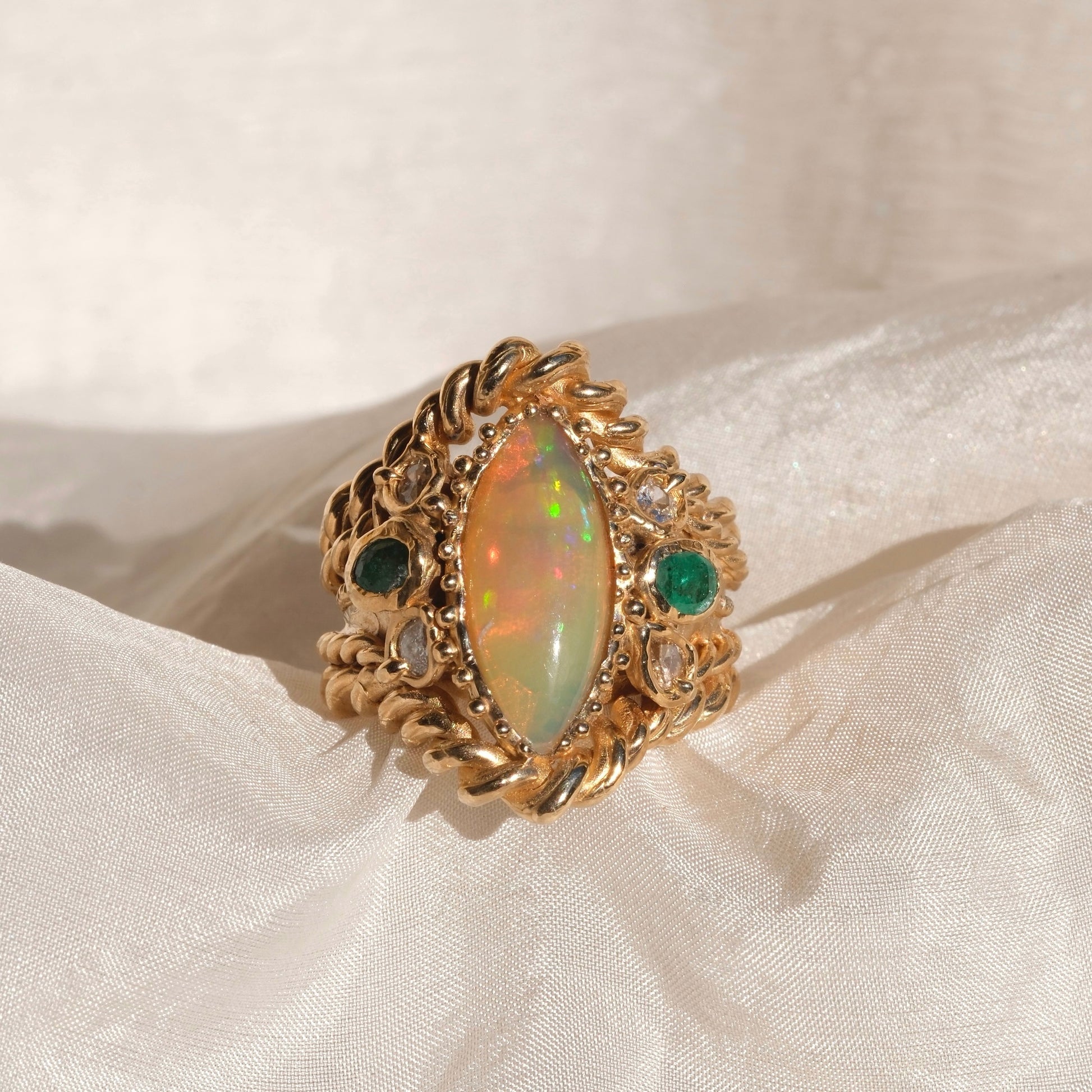 Un gioiello dal fascino naturale e raffinato. Questo elegante anello è realizzato in bronzo giallo e impreziosito da una splendida navette di opale etiope da 3,70 ct, nota per i suoi straordinari riflessi iridescenti che cambiano con la luce.
